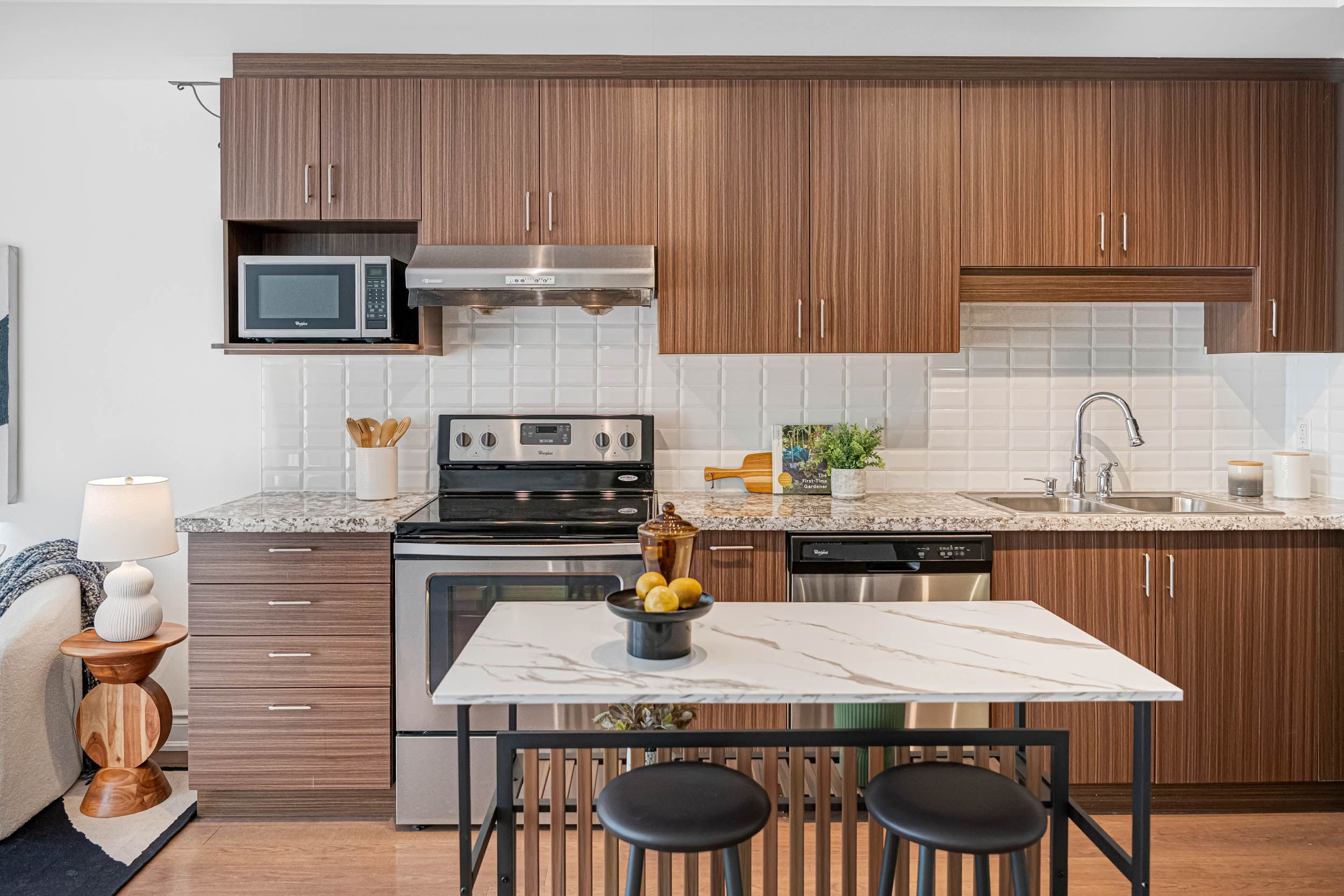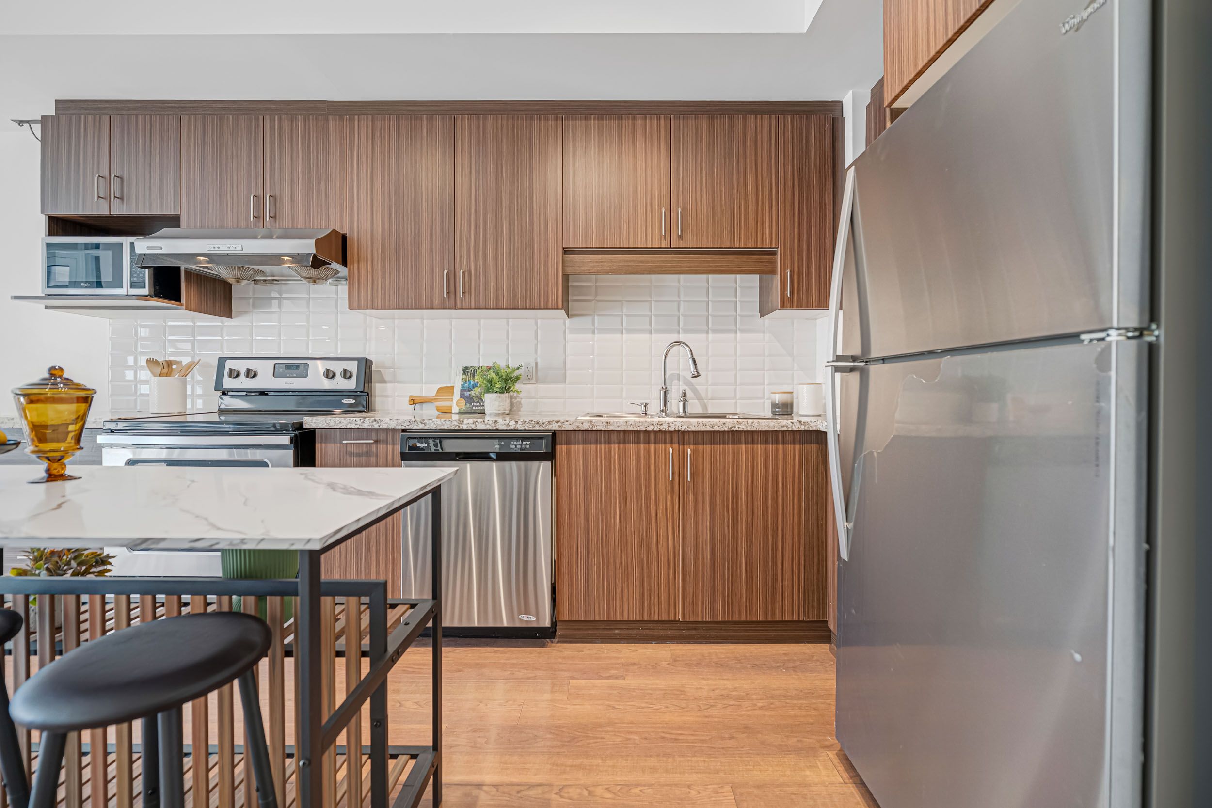 • Modern kitchen featuring stainless steel appliances and granite countertops.