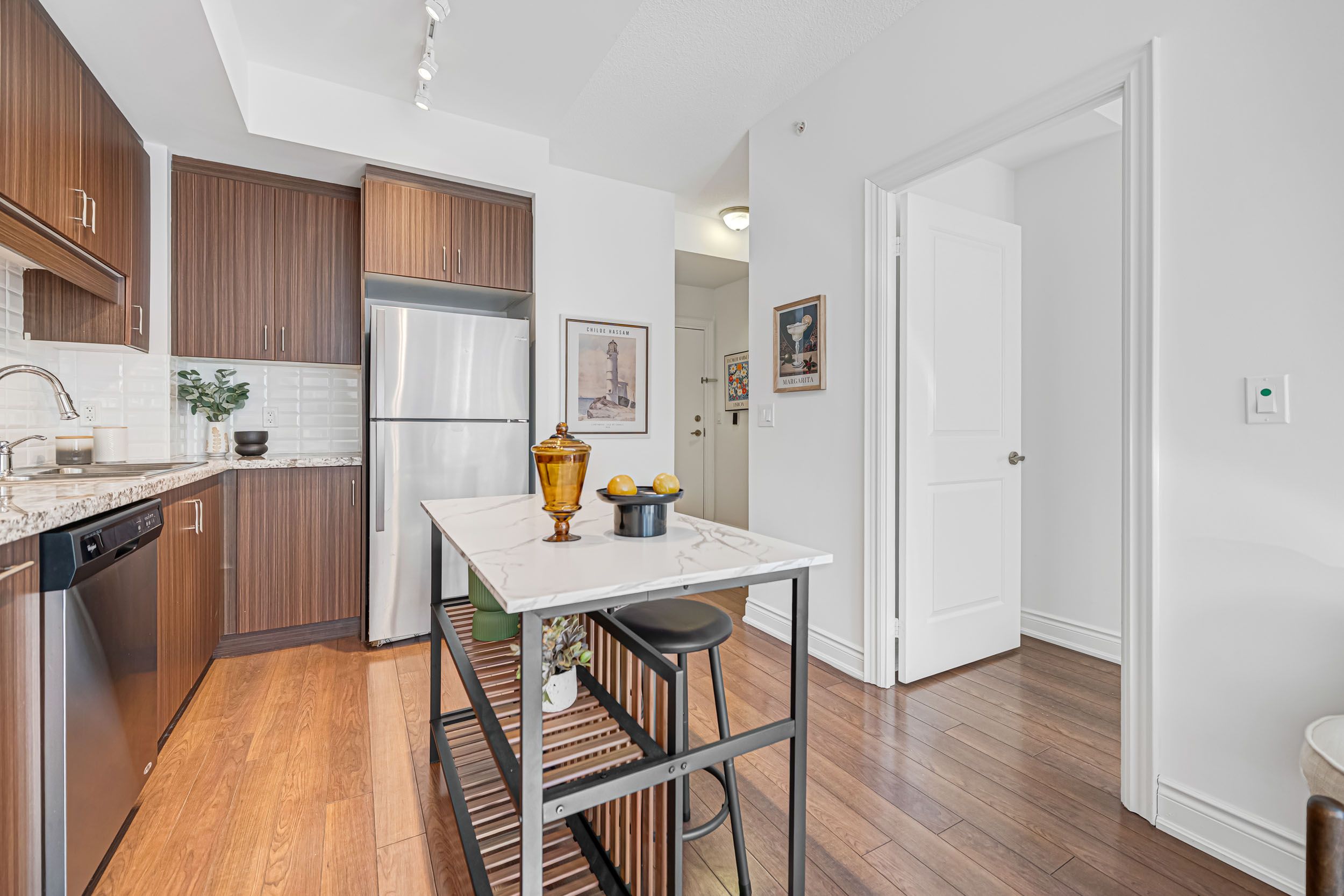 Luxurious fontana condominium located in the heart of downtown markham. Well-designed & spacious 1-bedroom layout featuring 9-foot ceilings and a modern kitchen equipped with stainless steel appliances and granite countertops. Highly convenient location within walking distance to viva transit, restaurants, shopping, and everyday amenities. Situated in the top-ranking unionville high school district. Well-managed building offering 24-hour concierge, ample visitor parking, and extensive amenities including an indoor swimming pool, fitness centre, and multi-sport court suitable for badminton, pickleball, table tennis, dance, and more. A ground-level locker is included.