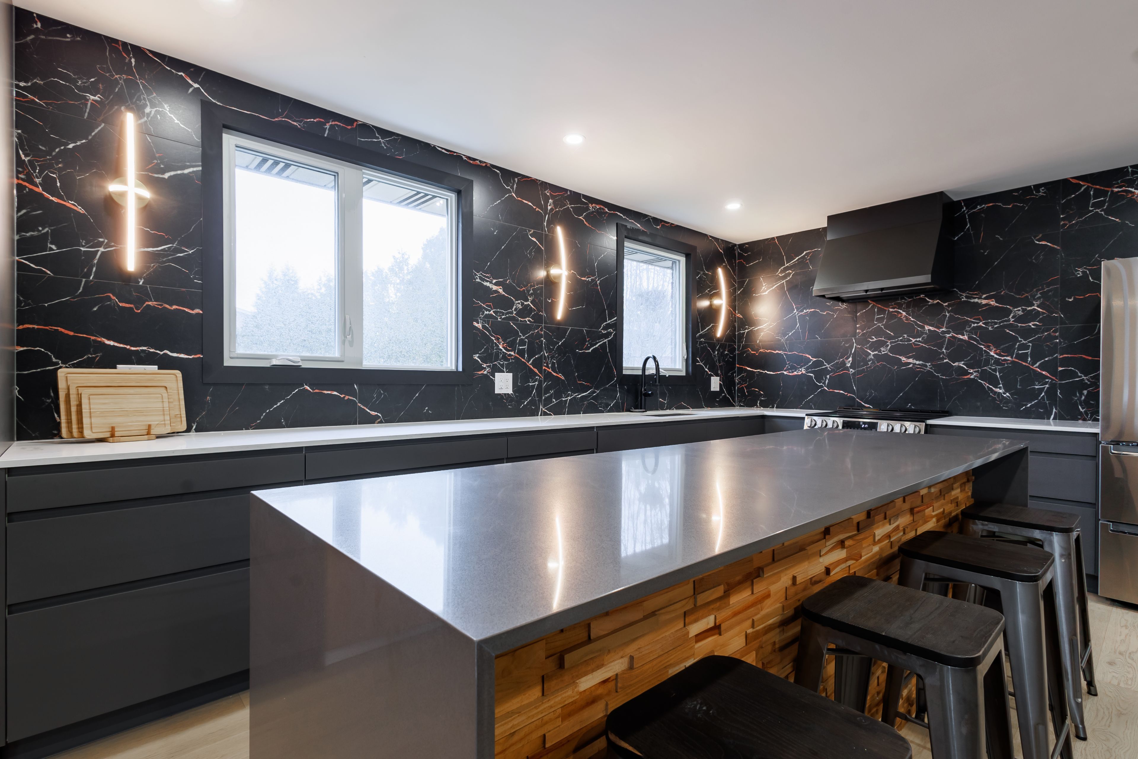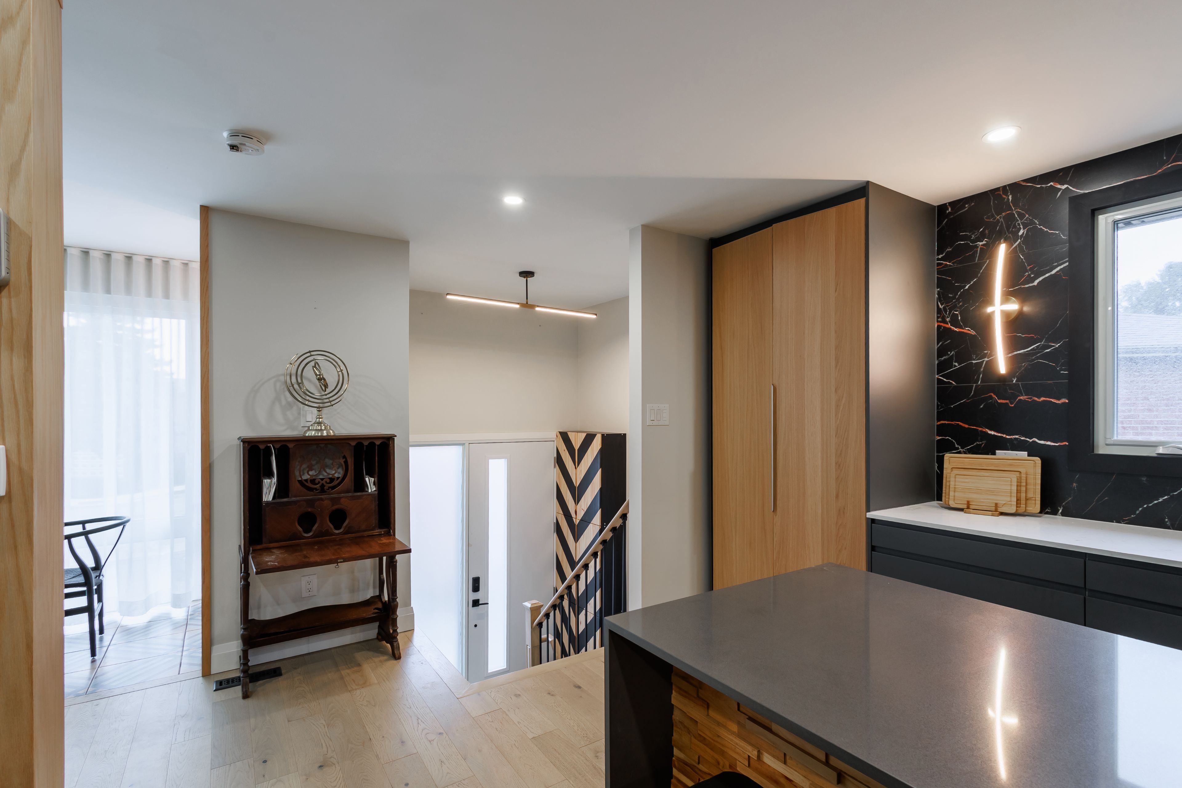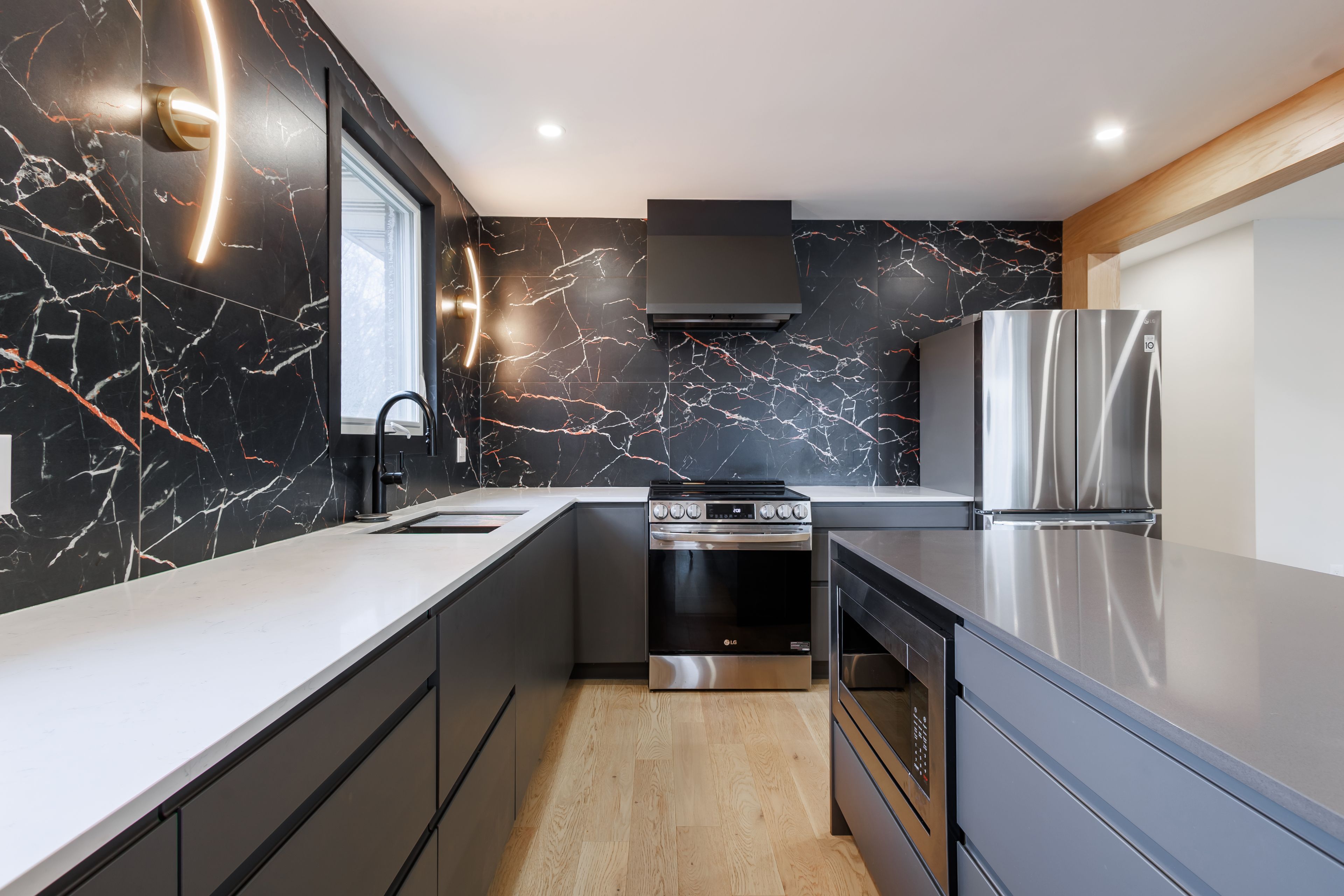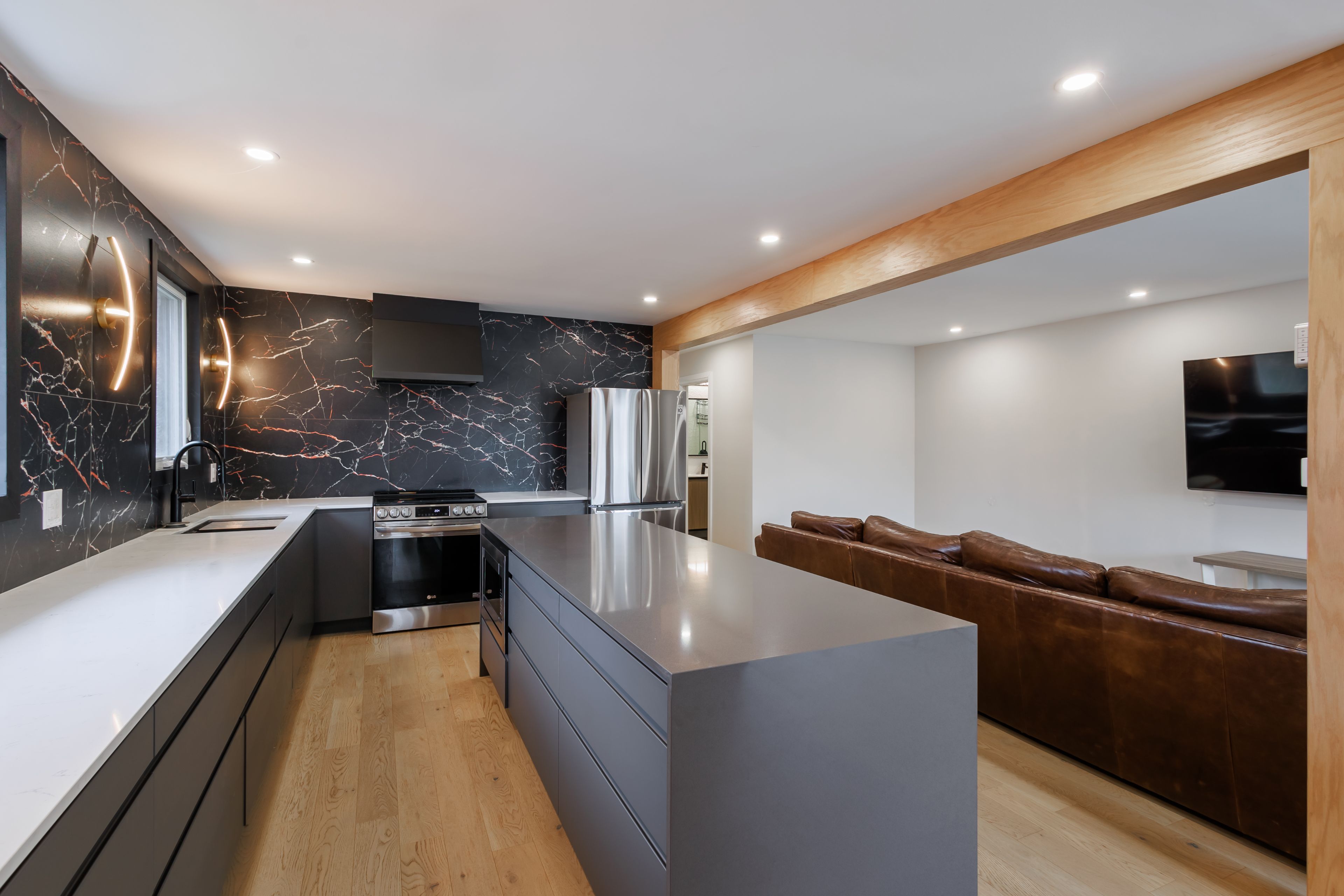 • Expansive chef's kitchen with eat-in island and newer appliances.