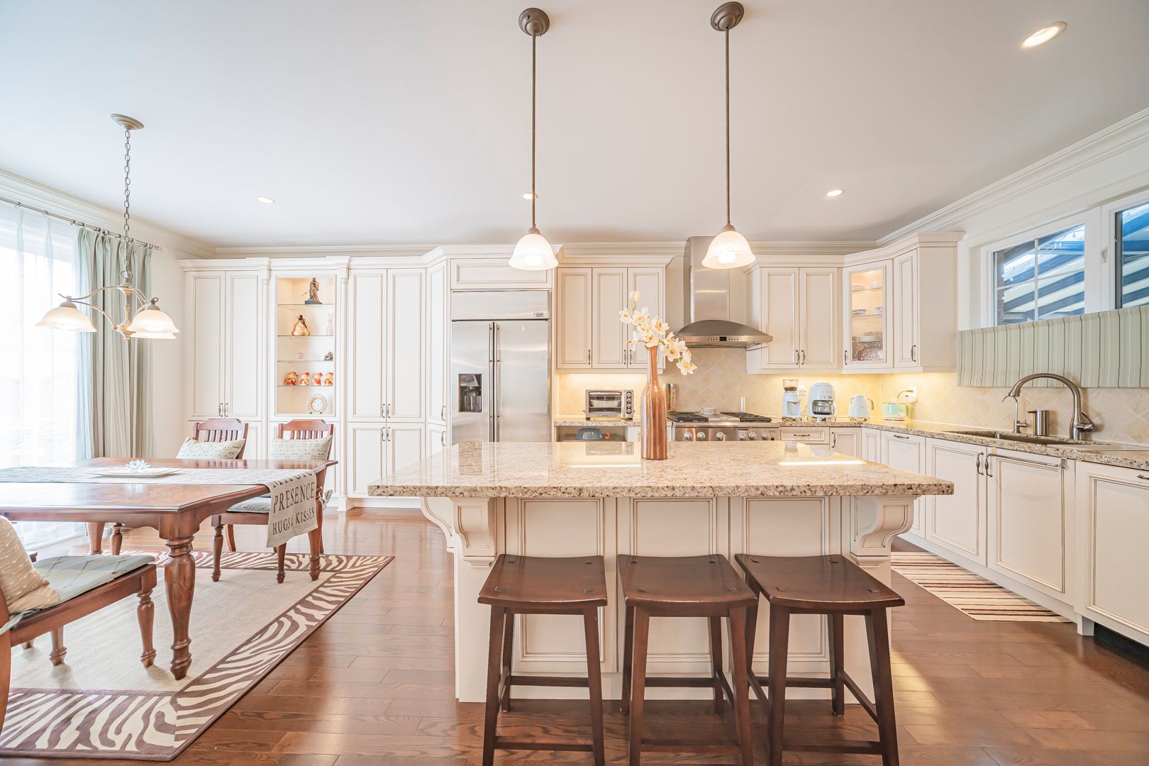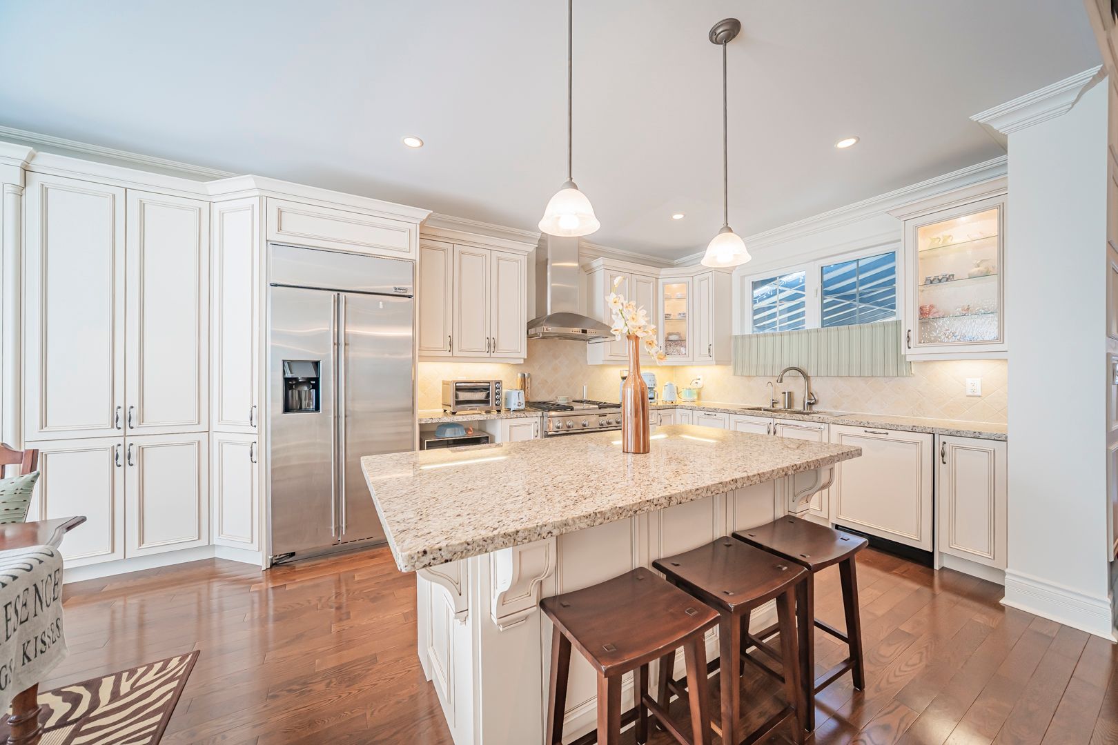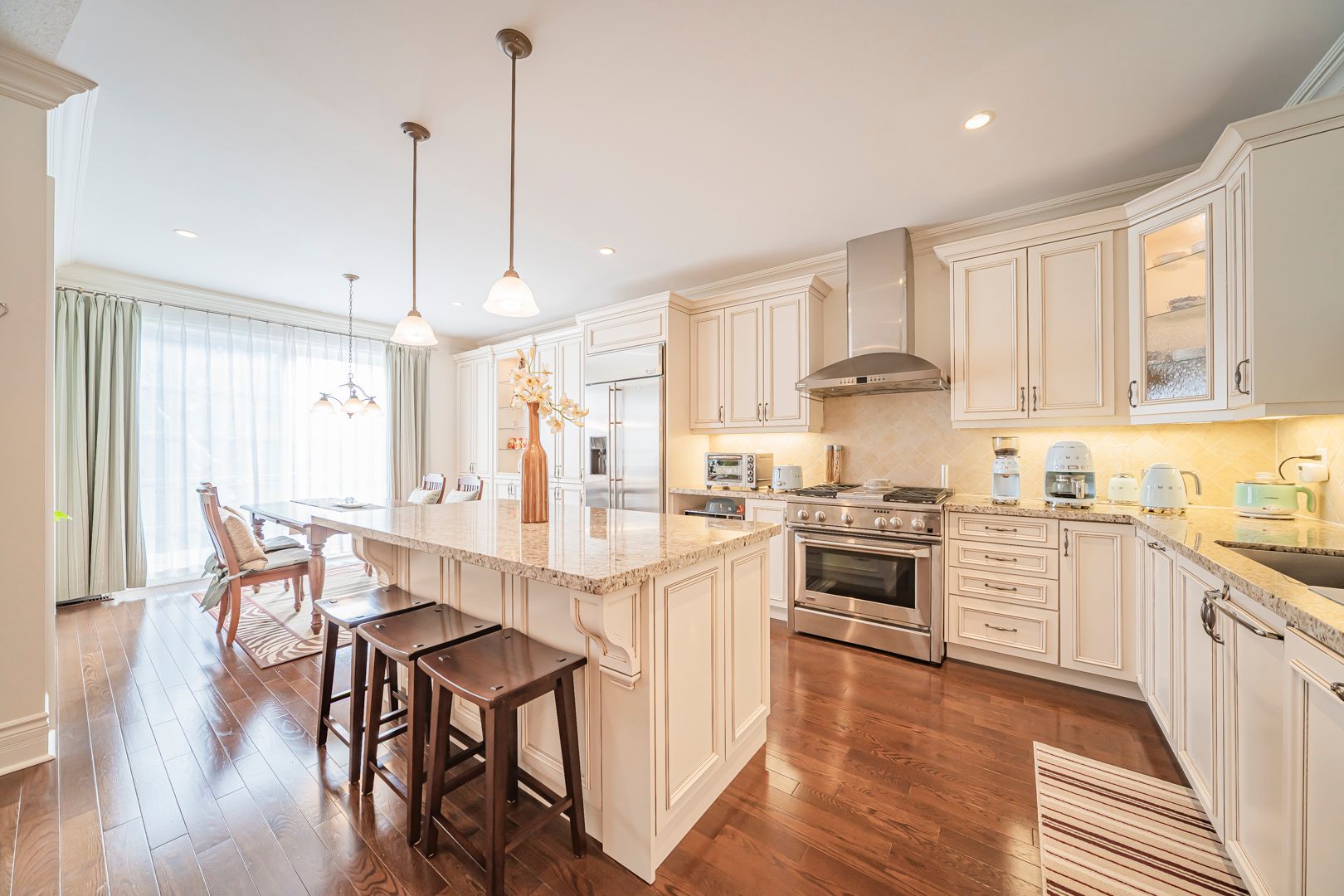 • Gourmet kitchen with custom cabinetry and large centre island for cooking enthusiasts.
