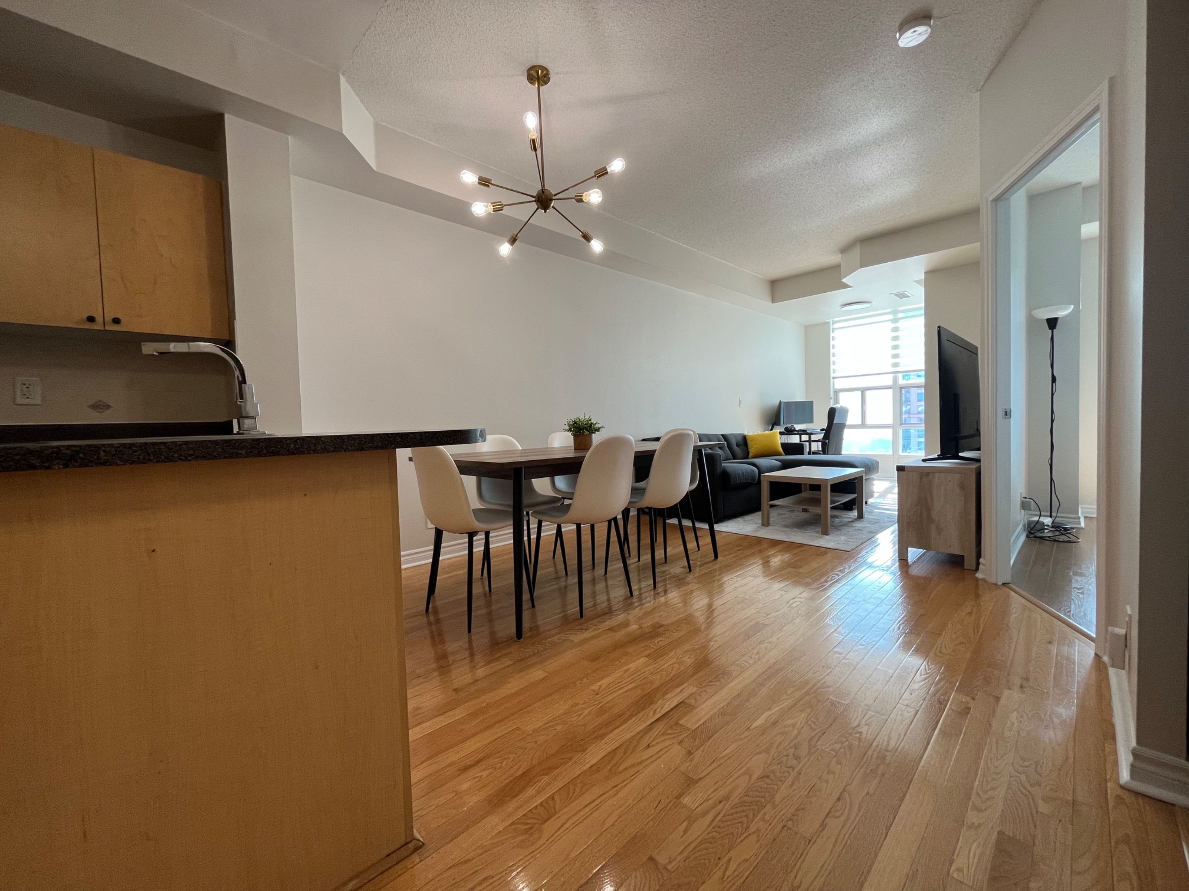 Spacious and fully furnished 1+den unit built by daniels. Ideally situated in the heart of downtown mississauga. Large 663 sq ft one bedroom + den which can be comfortably used as a second bedroom. This unit boasts 9 ft ceiling and floor to ceiling windows for a ton of natural light and airy feel. Steps from square one, go train, library, public transit, and minutes from qew and 403. Enjoy modern amenities, 24 hour concierge, indoor pool, sauna, indoor and outdoor hot tub, yoga room, party room, and lots of visitor parking.