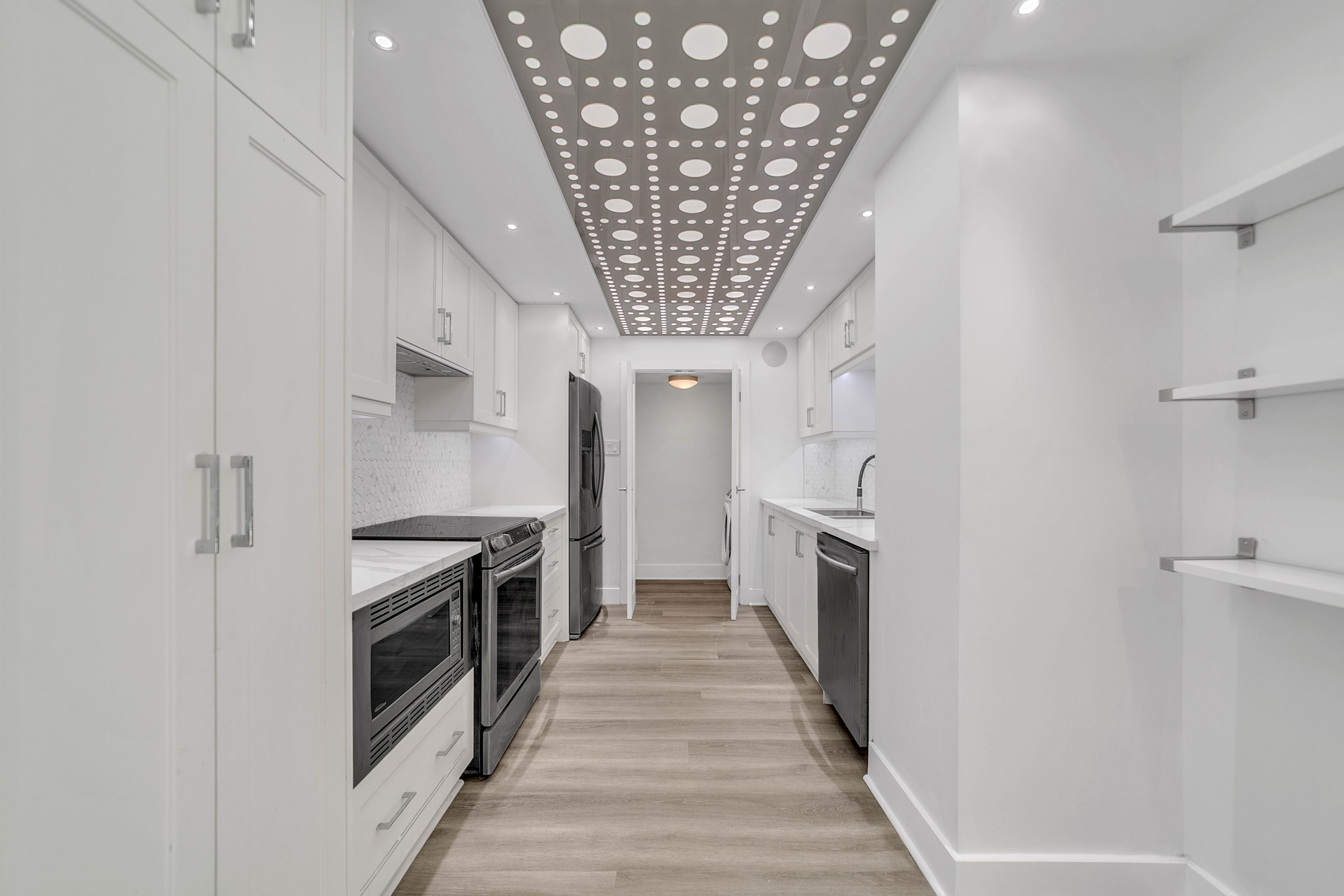 • Modern kitchen includes quartz countertops and stainless steel appliances.