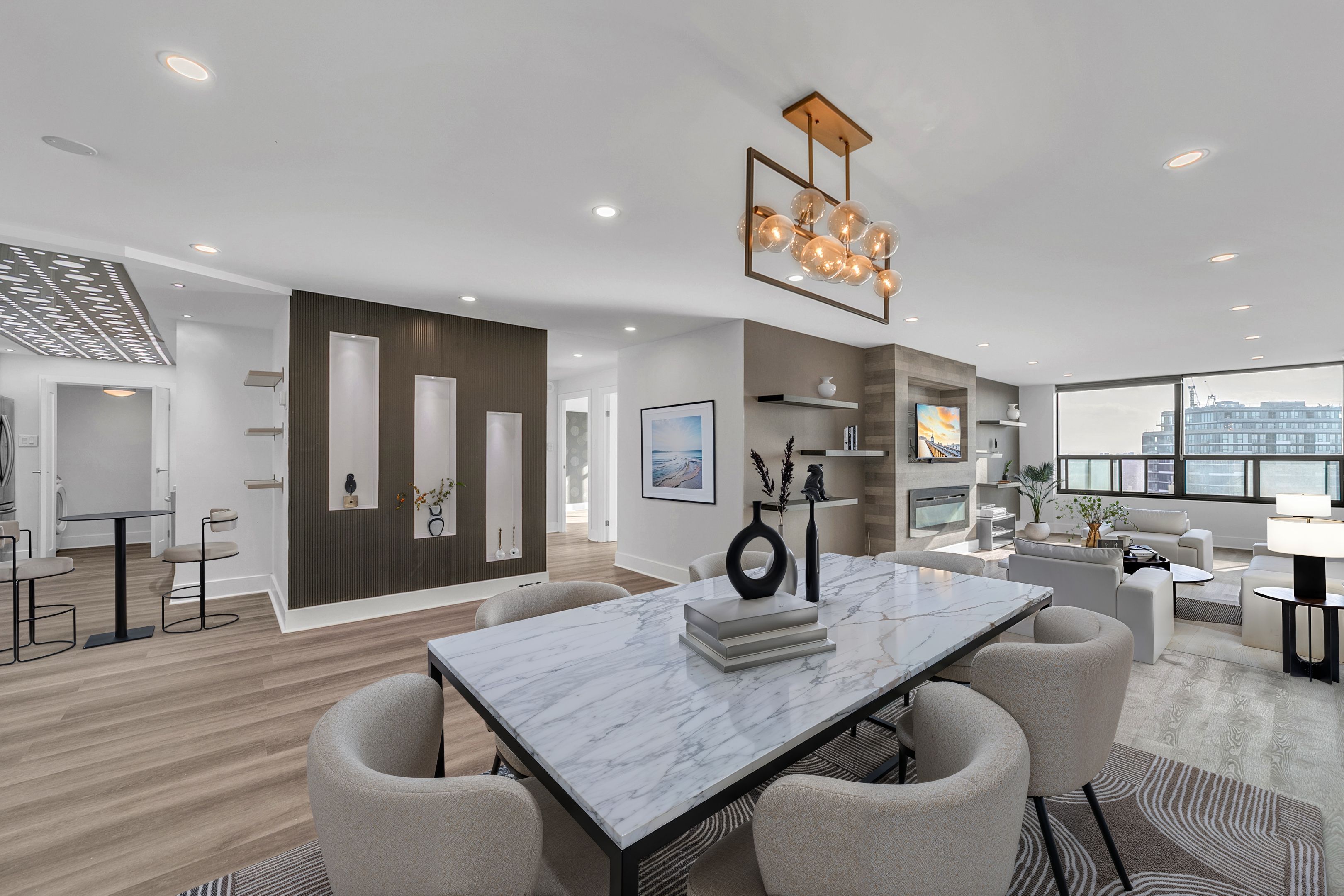 Exquisitely renovated exceptional 2+1 bedroom, 2 bath condo in the heart of north york completely transformed from its original layout with solarium removed and expertly reconfigured into a spacious, functional floor plan - truly a gem! Bright and spacious approx. 1,200 sq. With beautiful south-west views. Open concept living with new wood flooring, pot lights, and dedicated dining area. Modern kitchen with quartz/marble countertops, stainless steel appliances, and ample cabinetry, connected to laundry room with built-in shelving. Custom built wall unit with fireplace adds style and function. Primary bedroom features 3-piece ensuite and double closet. Prestigious building with 24-hour concierge and excellent amenities. Prime location steps to sheppard-yonge subway, hwy 401, longos, food basics, parks, schools, shops & restaurants.