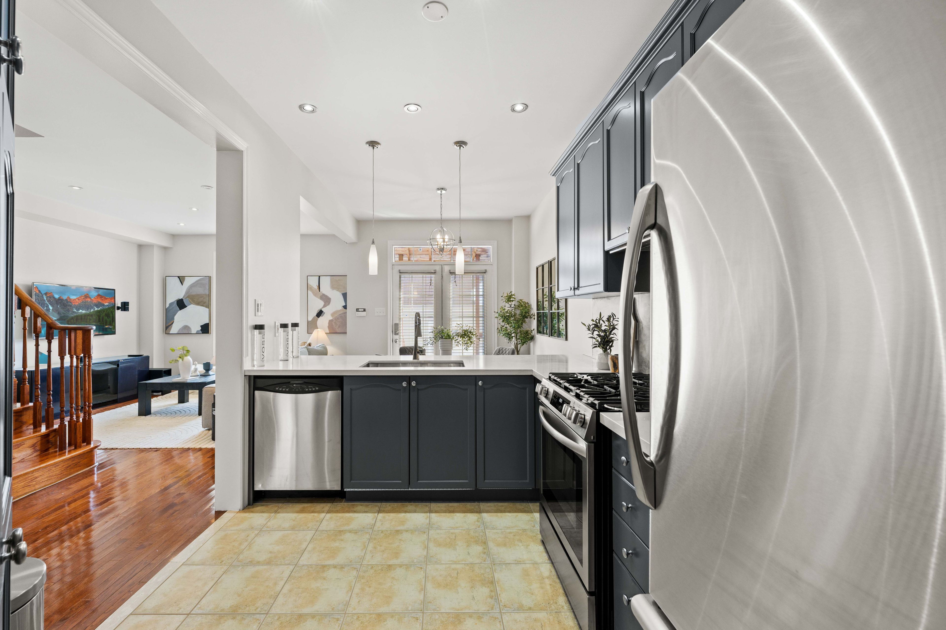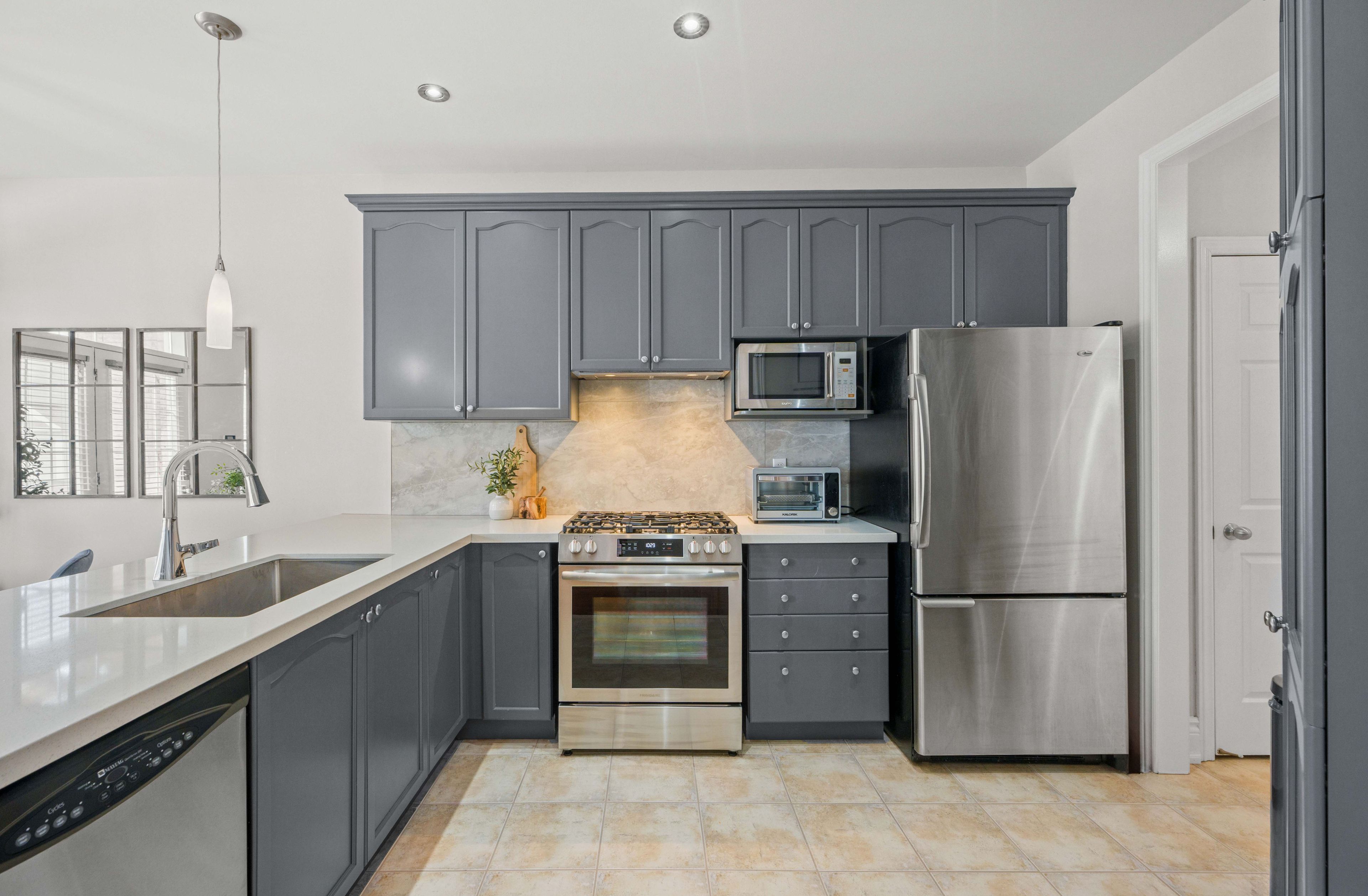 • Updated kitchen with premium cabinetry and modern appliances for cooking.