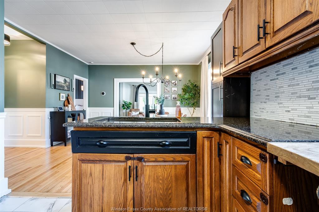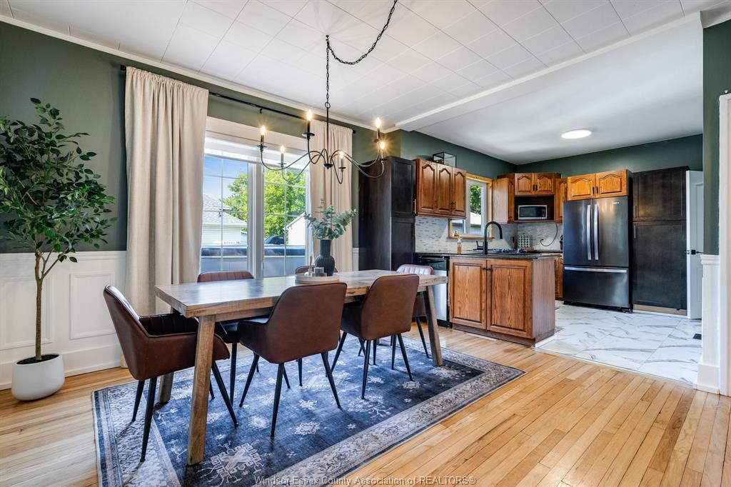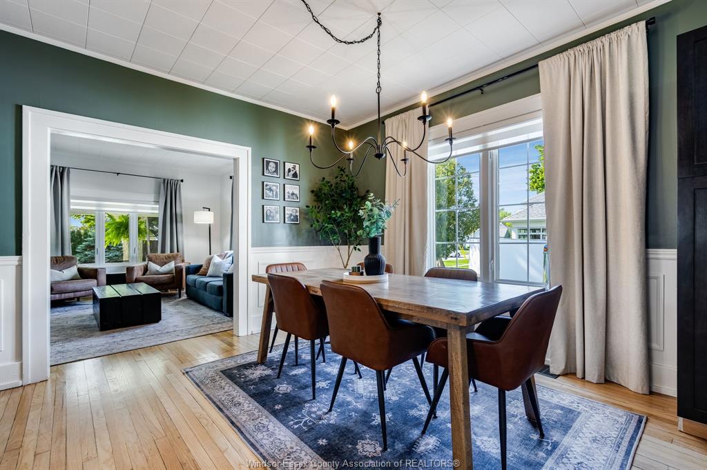 • Refinished hardwood floors and elegant wainscoting throughout the main level.