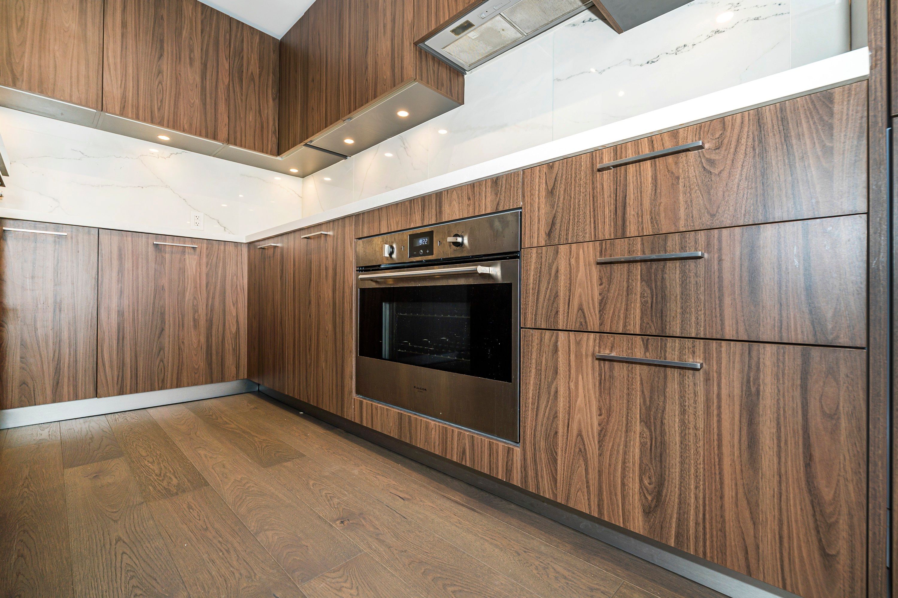 • Modern kitchen featuring stainless steel appliances and quartz counters.