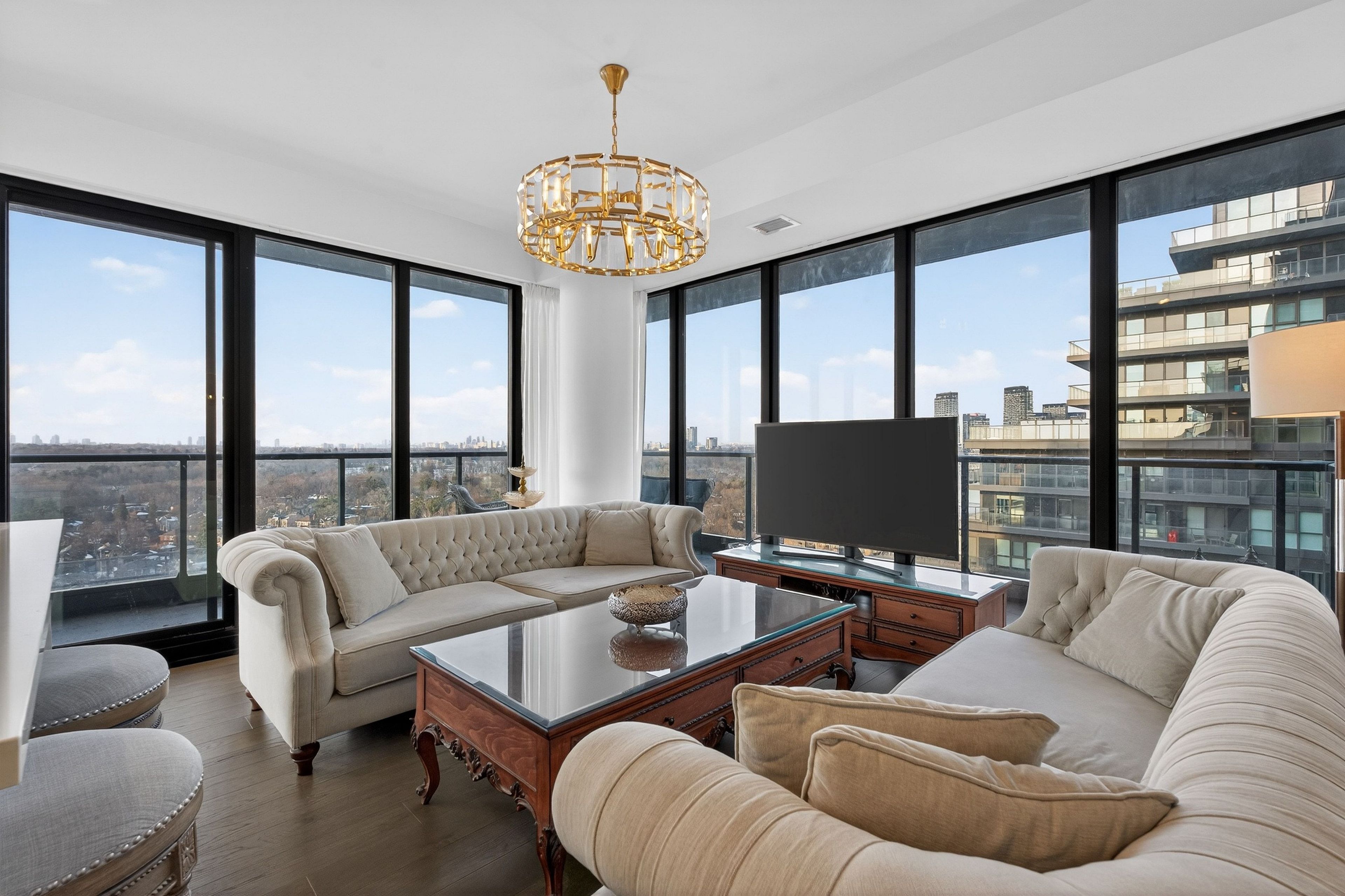 Luxury condominium in prestigious leaside, offering one of the few suites with an exceptional custom designed open concept floor plan and stunning views of sunnybrook park. The suite features european oak flooring throughout and a modern kitchen with upgraded, top of the line appliances. The primary bedroom includes a luxurious five piece ensuite, while the second bedroom offers its own three piece ensuite. Enjoy the convenience of a full size washer and dryer, a dedicated powder room, and two expansive wrap around balconies ideal for outdoor living and entertaining. Building amenities include an indoor pool, steam sauna, 24 hour concierge, fitness centre, yoga studio, massage room, outdoor fire pits, and a landscaped terrace with bbq facilities. Ideally located close to the lrt, parks, top rated schools, shopping, dining, and the dvp. Experience refined luxury living in one of leaside's most sought-after communities.