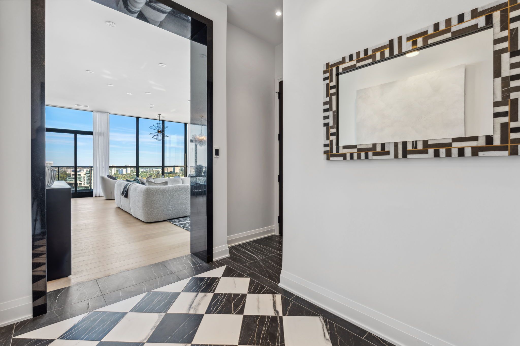 Welcome to this stunning southeast corner upper penthouse in the heart of leaside, boasting sweeping city views, 10-ft ceilings, and floor-to-ceiling windows. Enter through diamond-patterned tile and a custom granite archway into the expansive great room, featuring custom fluted millwork, open shelving with christian lacroix wallpaper, and four seamlessly integrated frameless tvs. The south-facing balcony is perfect for entertaining, while the dining room offers a separate balcony and another lacroix feature wall. The custom trevisana kitchen dazzles with calacatta marble counters, miele appliances, a 5-burner gas cooktop, and breakfast bar seating. The primary suite includes a private balcony, walk-in closet, and spa-like 6-pc ensuite. A guest bedroom offers its own walk-in closet and 3-pc ensuite. With black granite archways, glass walls, calacatta finishes, and elegant hardware throughout, this home is a true slice of heaven in the sky.