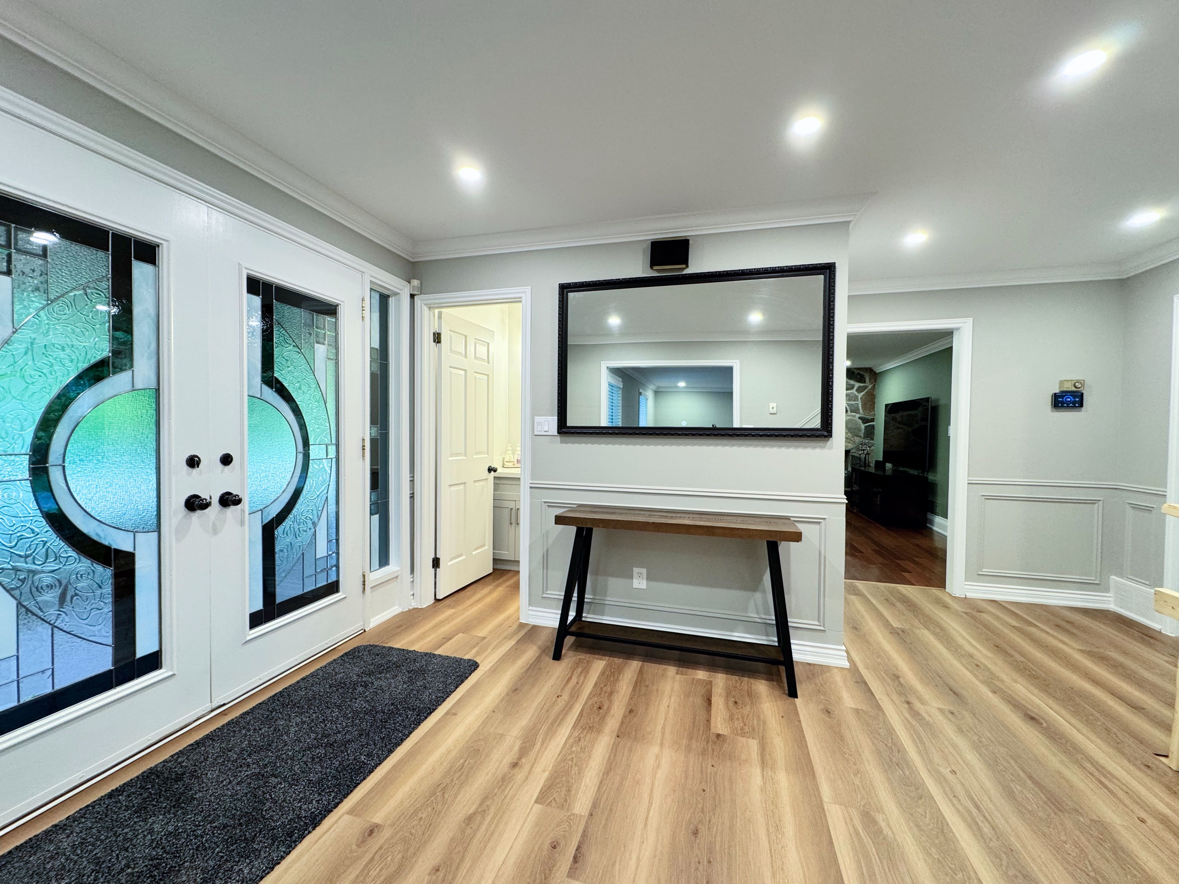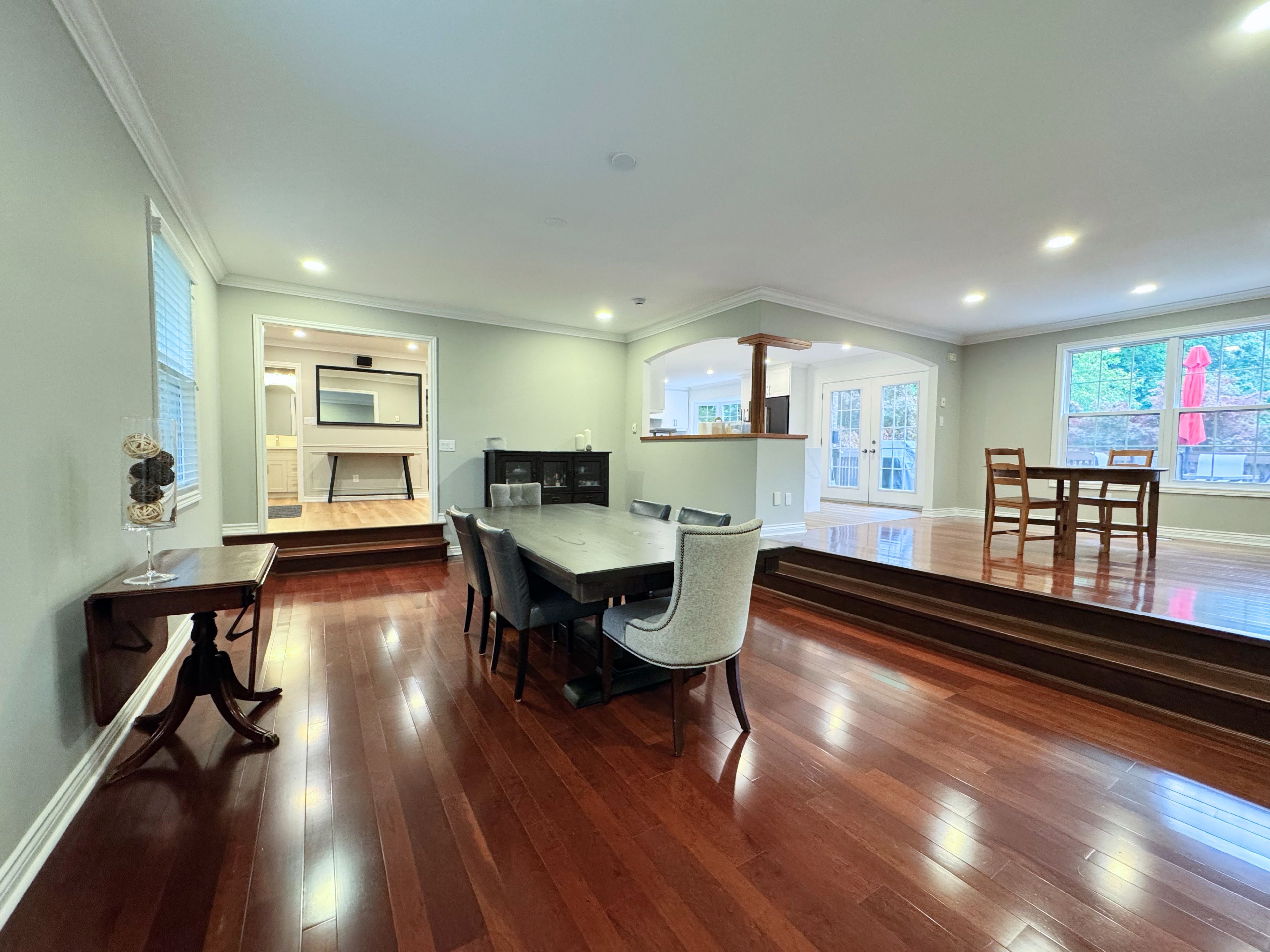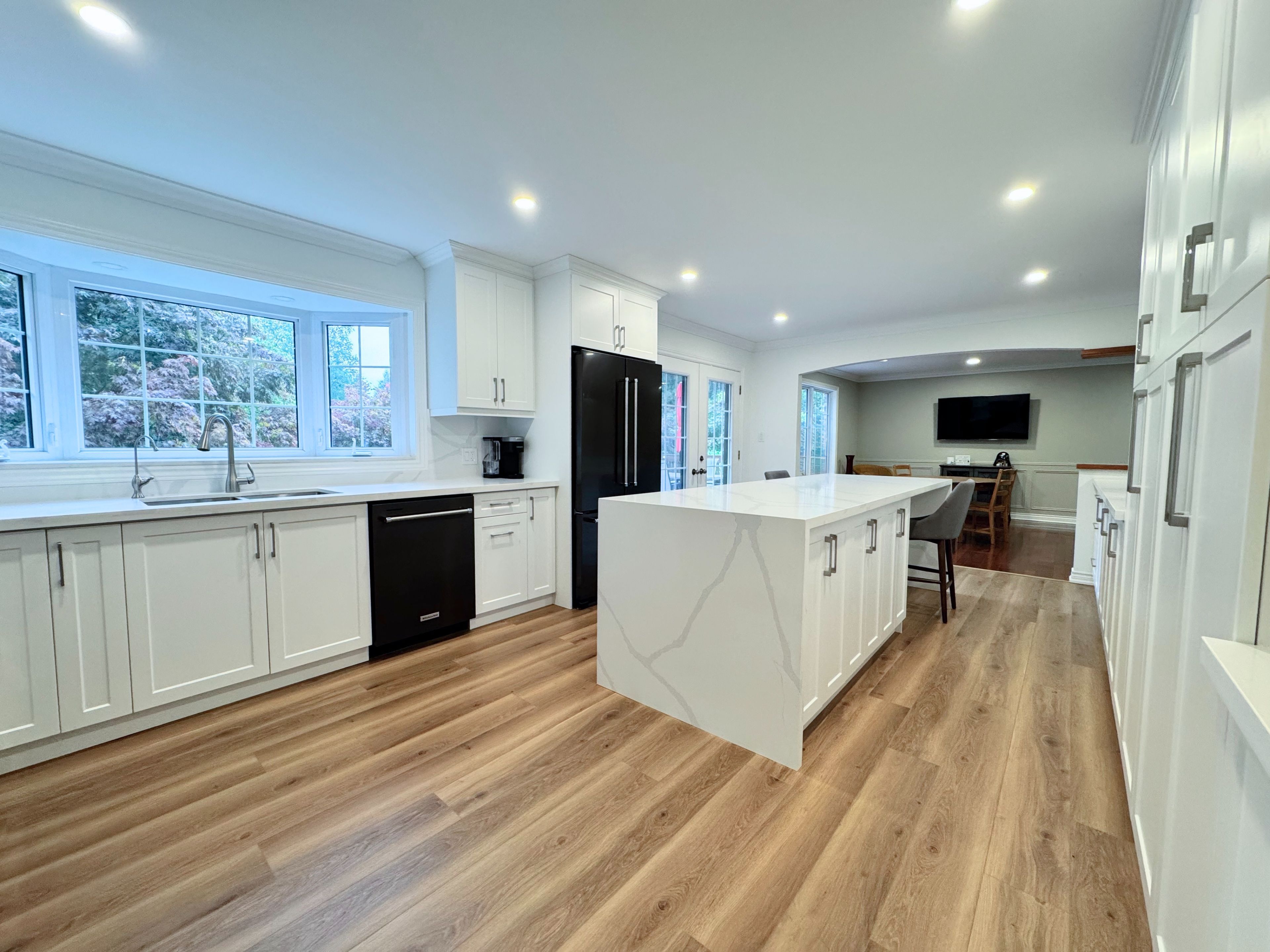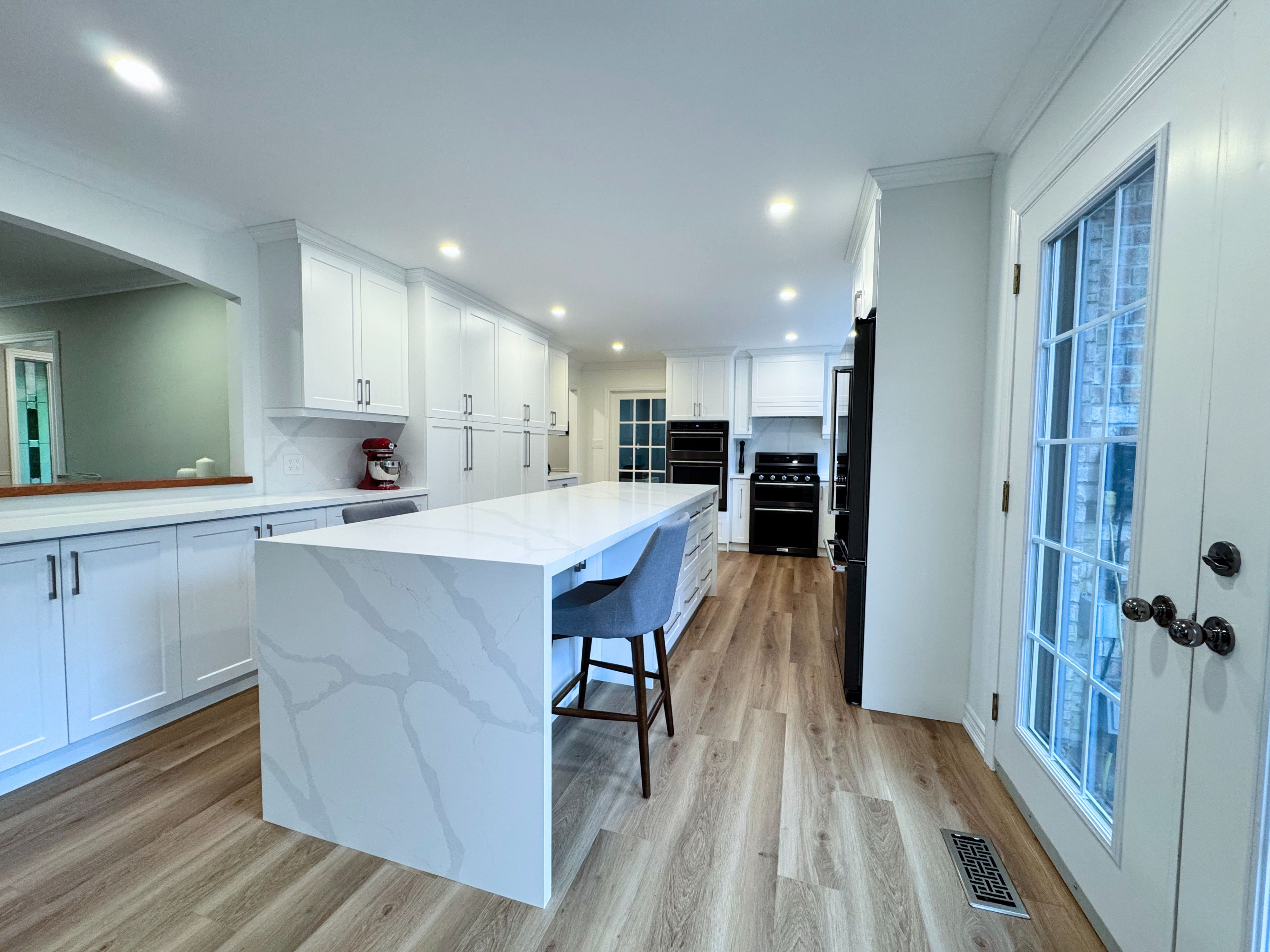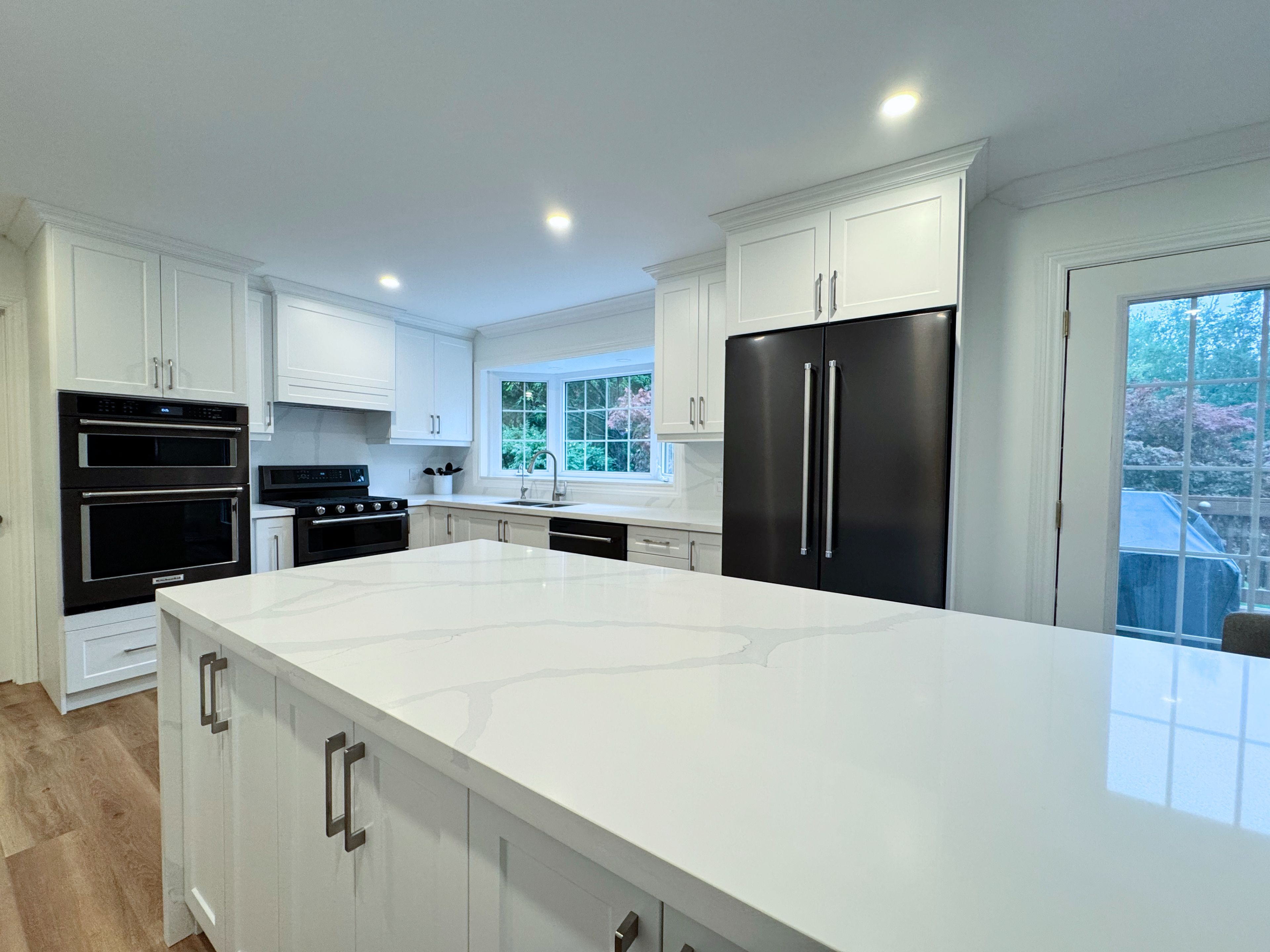 • Newly renovated custom kitchen with quartz countertops and modern appliances.