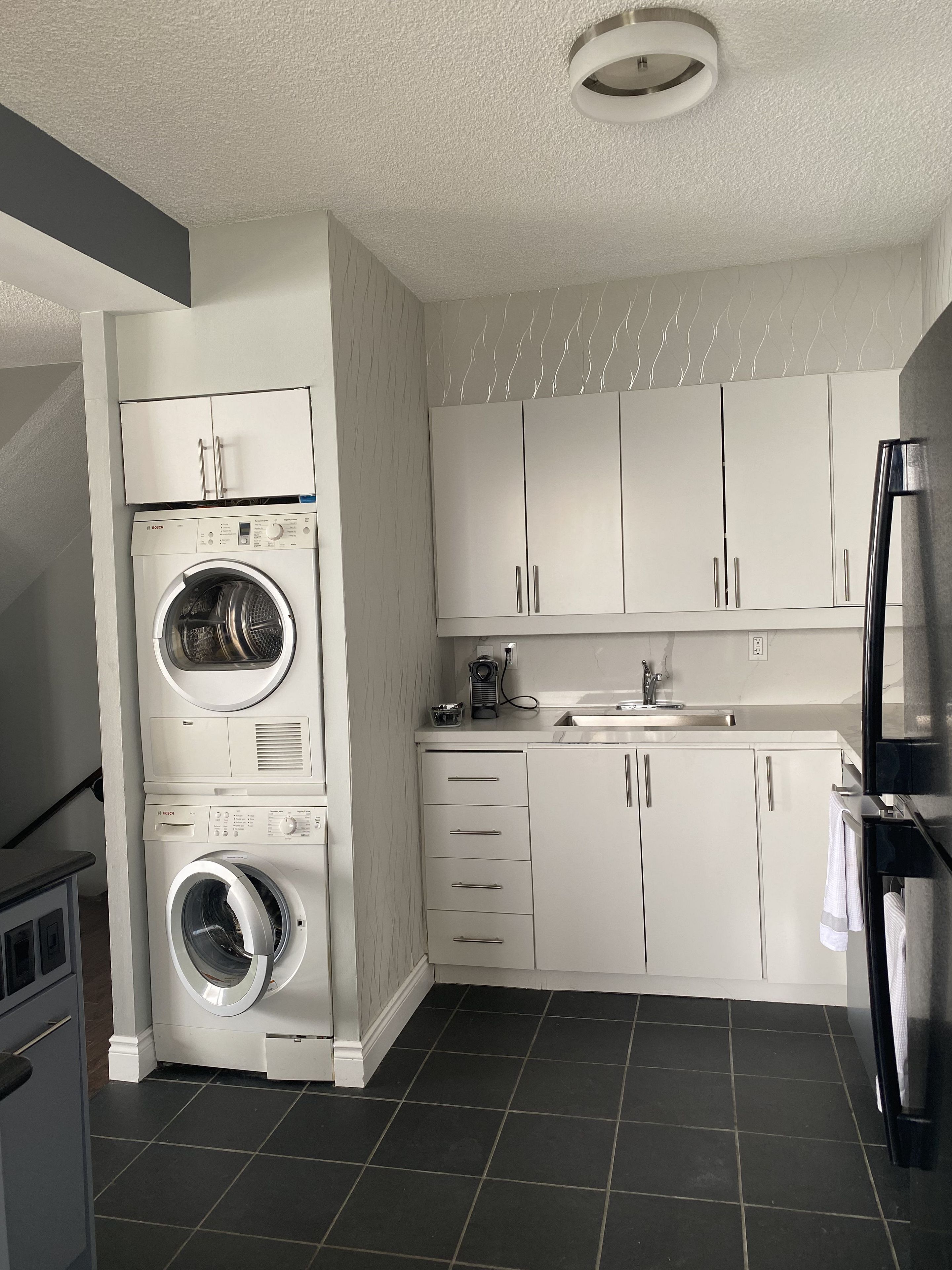 • Stylish renovated kitchen with quartz counters and breakfast bar.