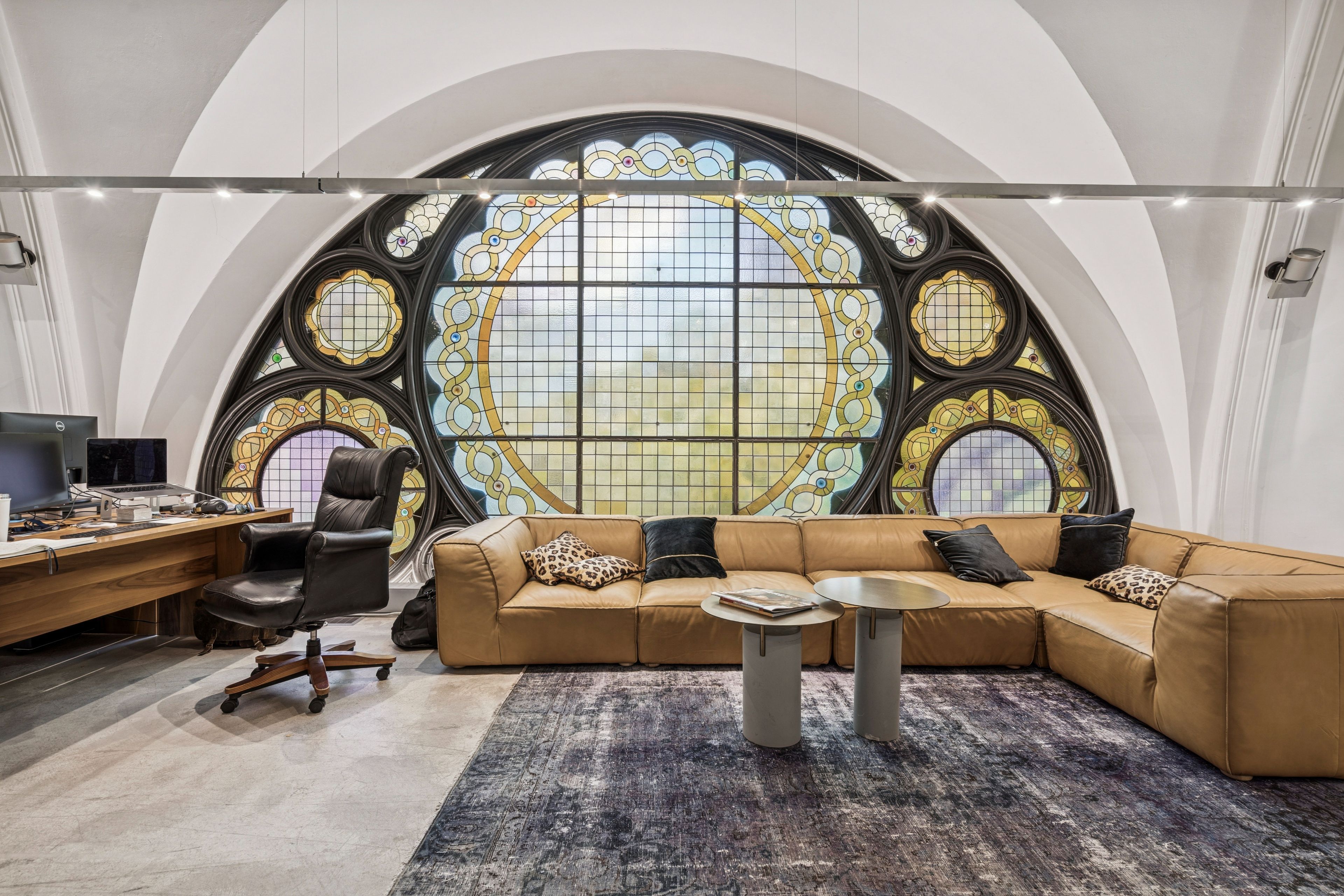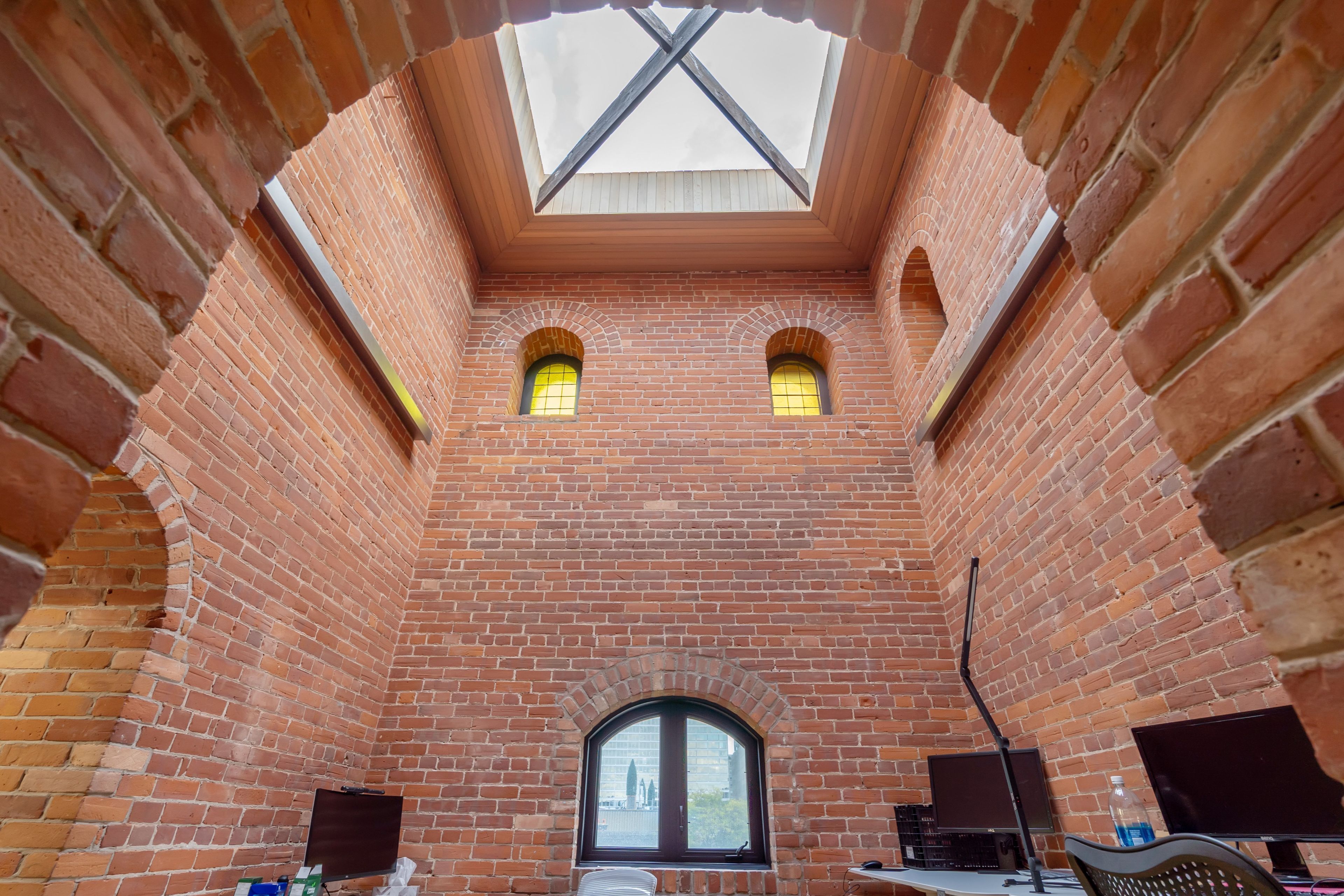 • Elegantly designed with red brick masonry and stained glass elements.