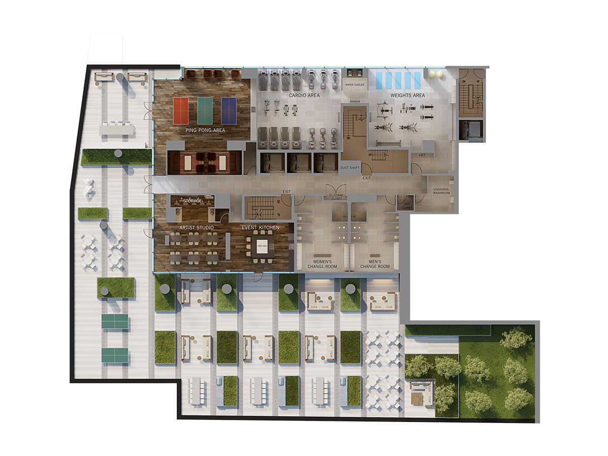 • Excellent amenities including a fitness center and artist lounge.