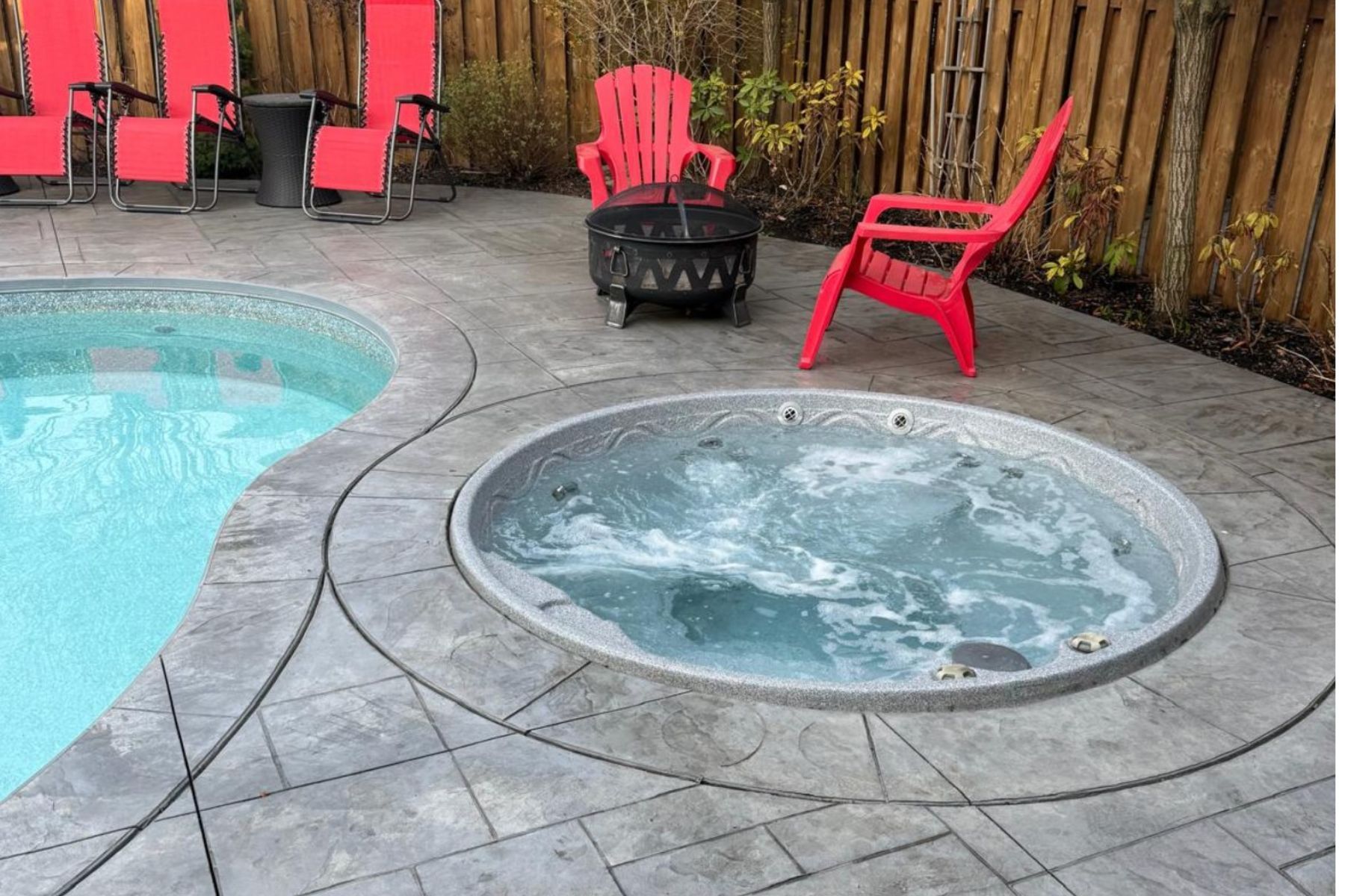 • Private backyard oasis featuring a heated saltwater pool and hot tub.