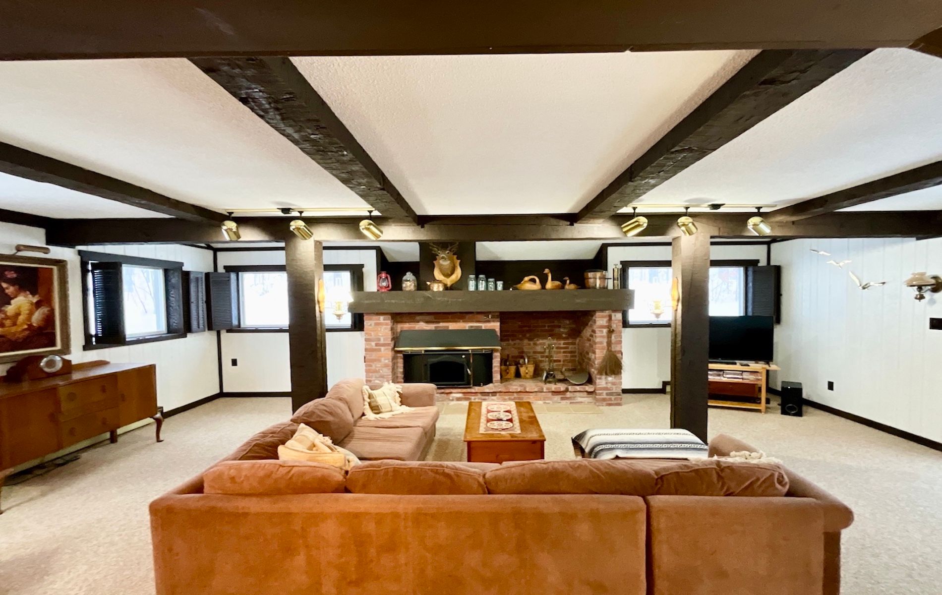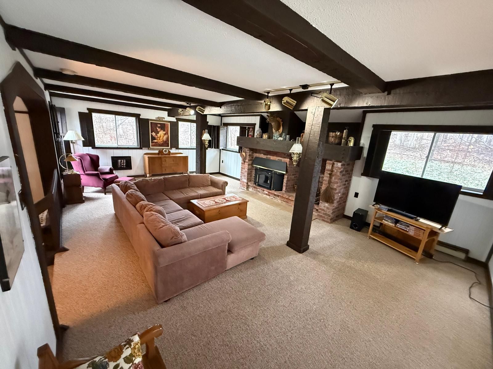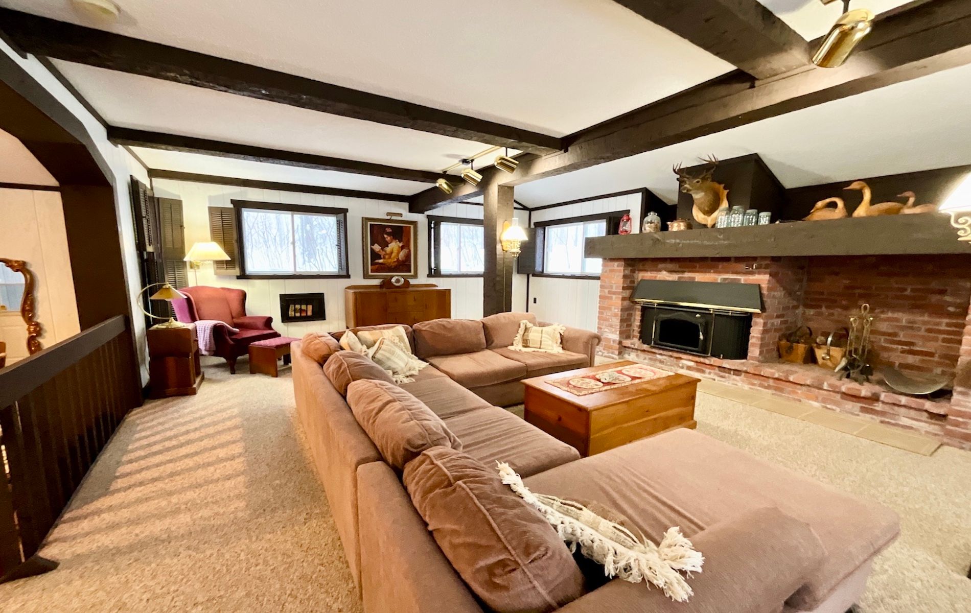 • Great room with reclaimed brick fireplace adds charm and comfort.