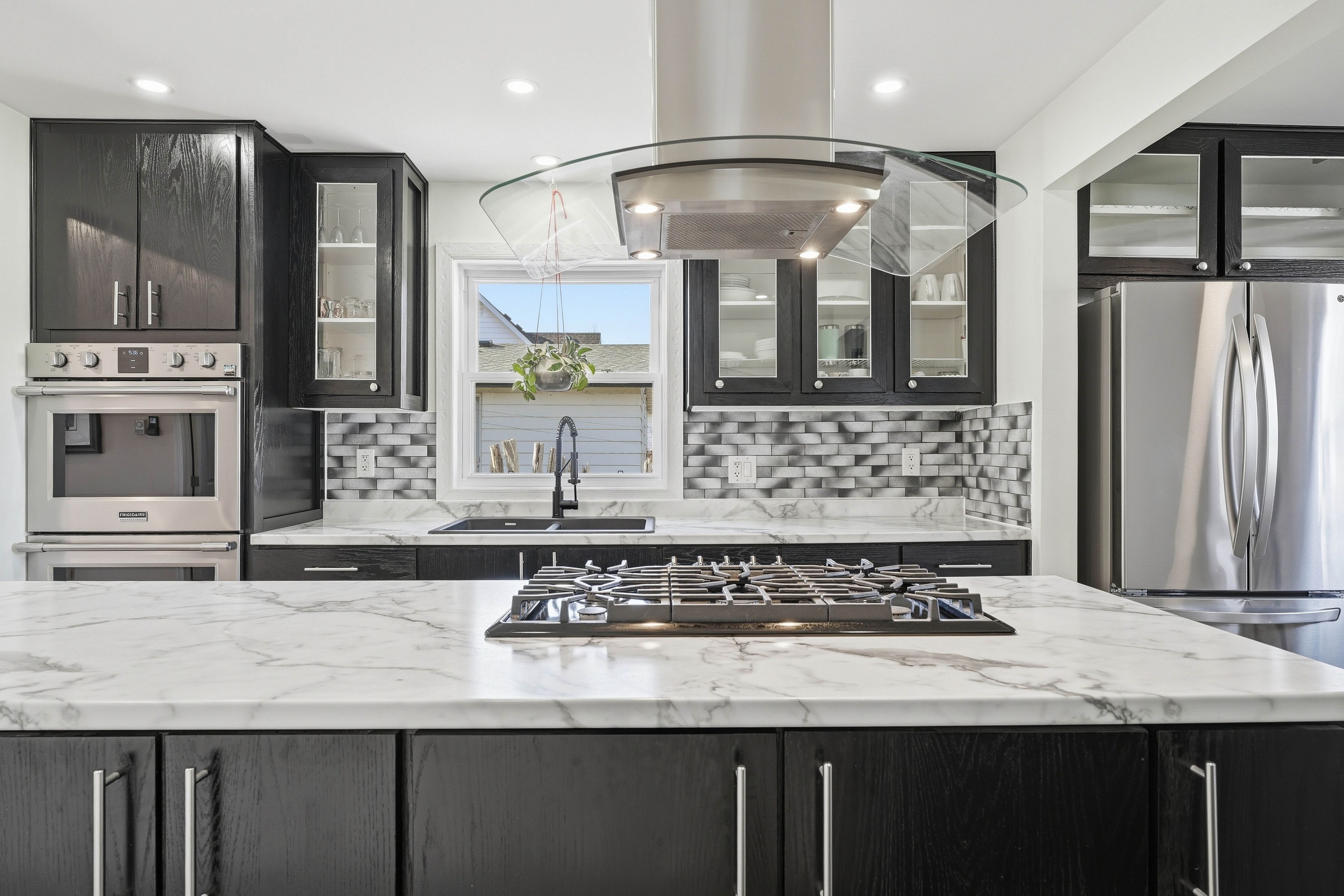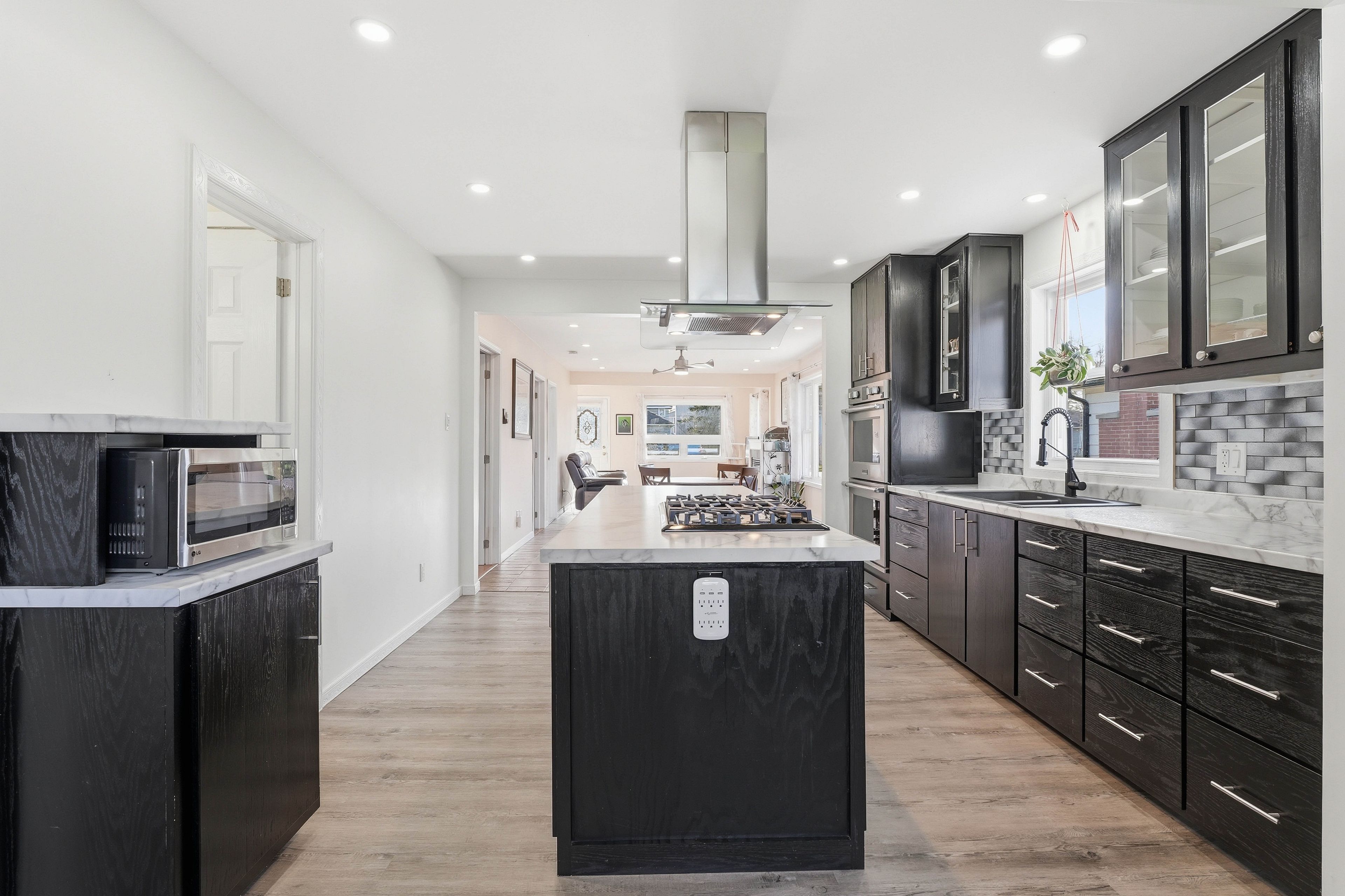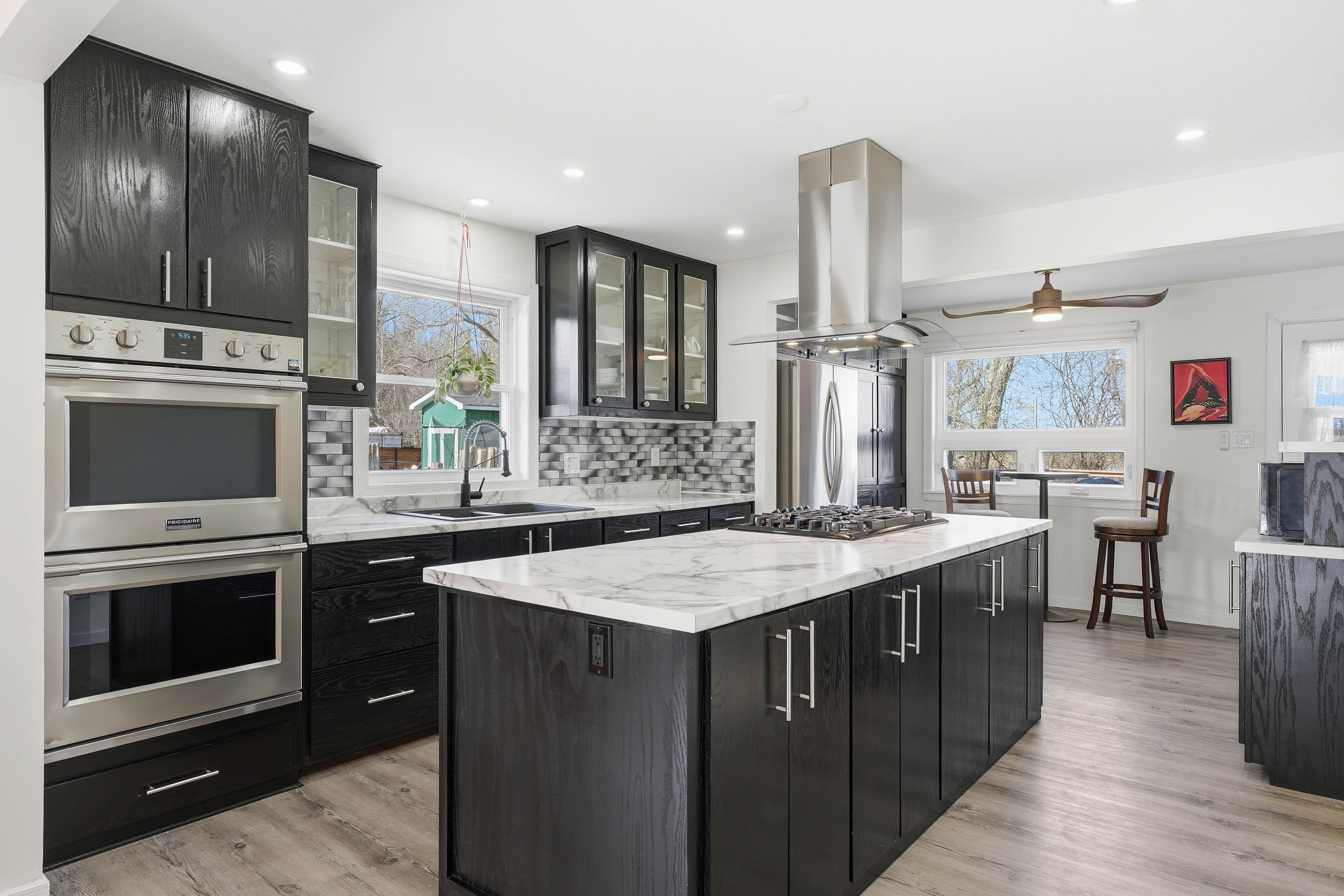 • Updated kitchen includes an island and double ovens for cooking ease.