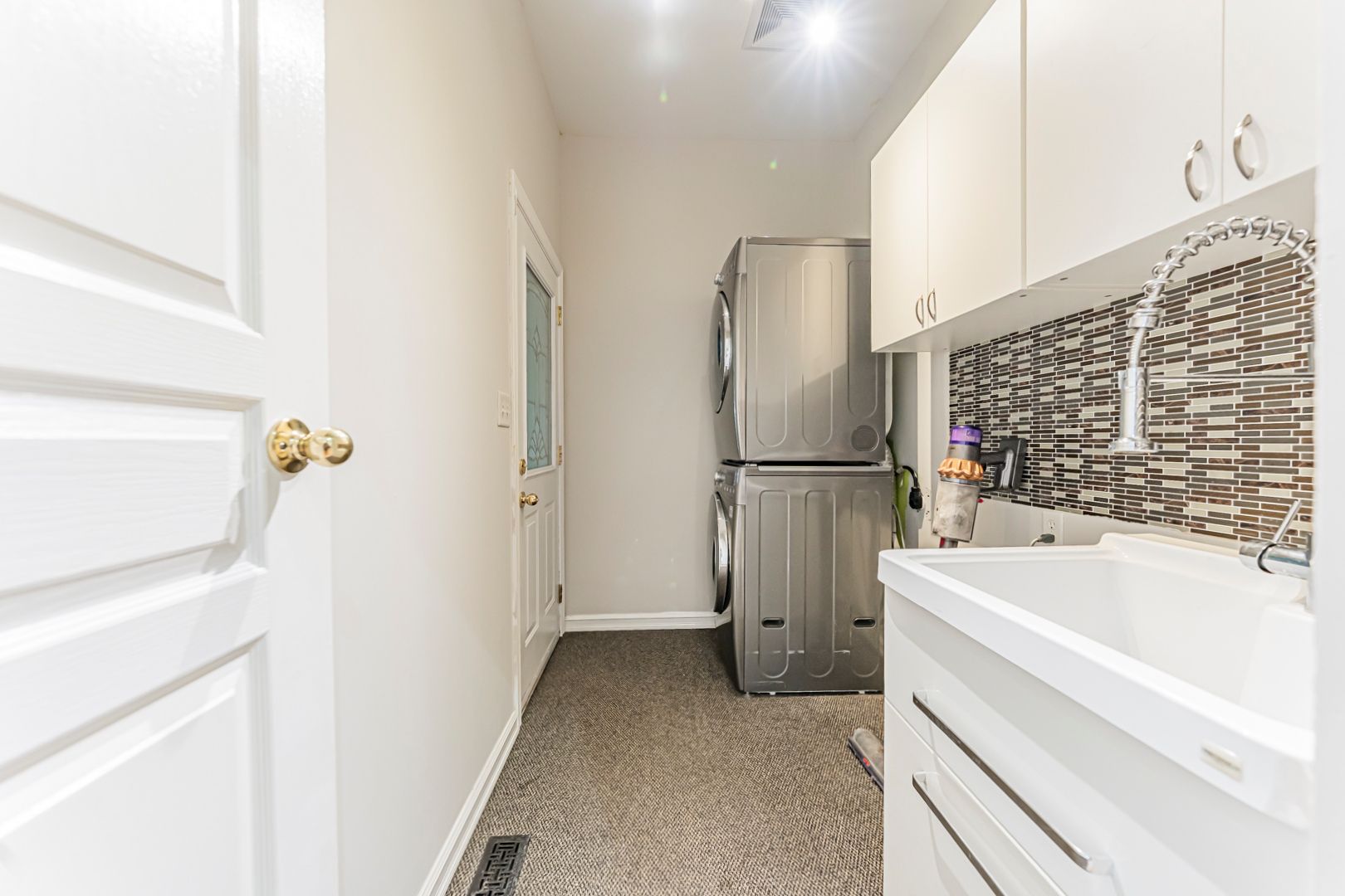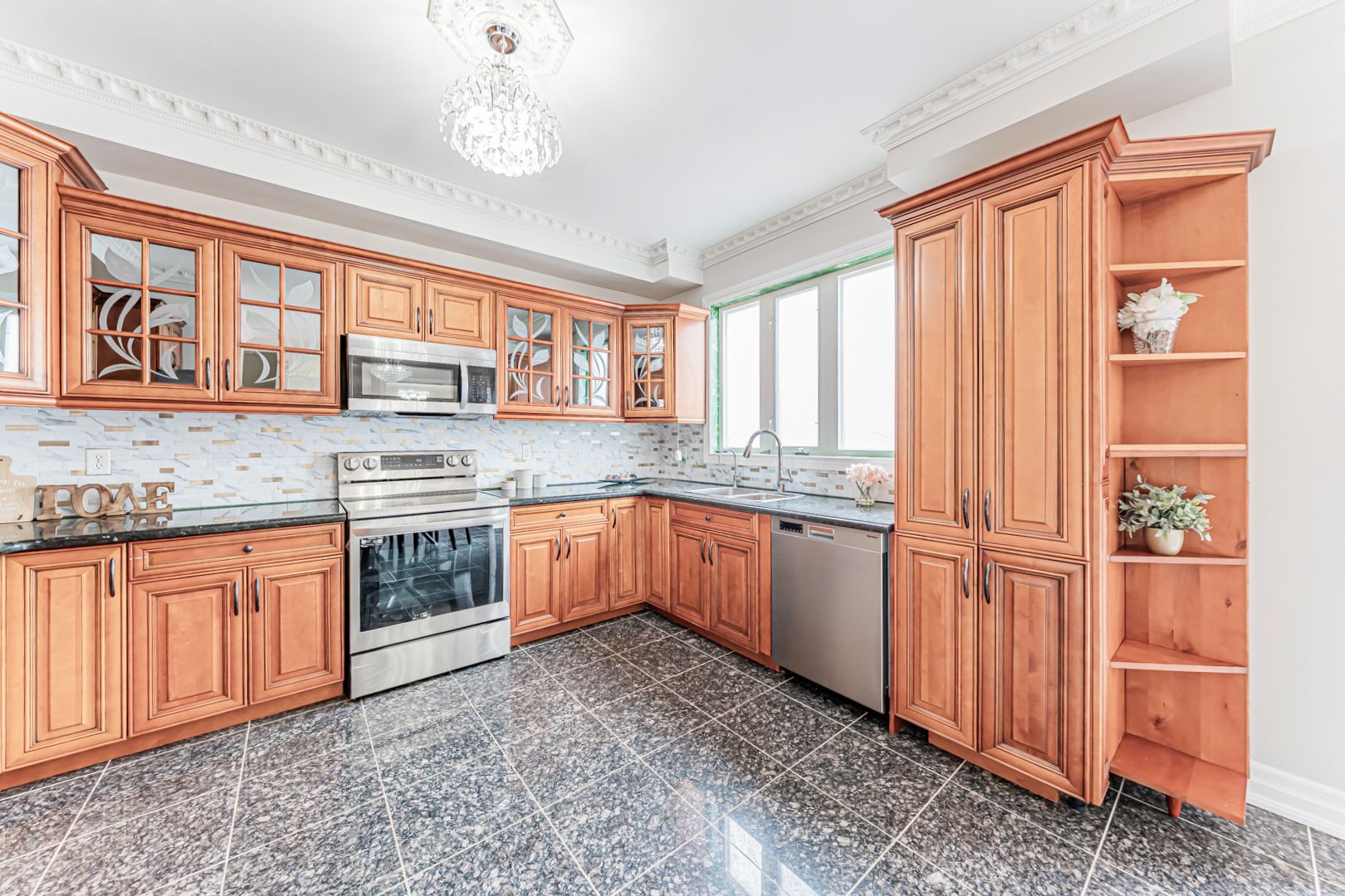 • Functional kitchen with stainless steel appliances and backyard access.