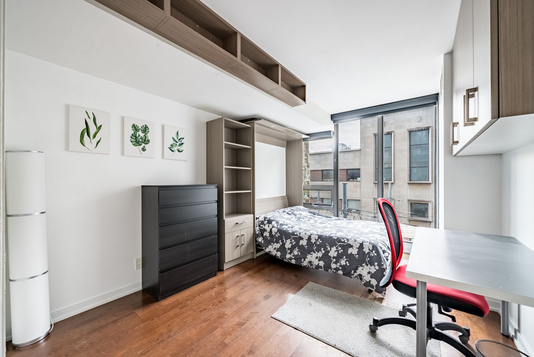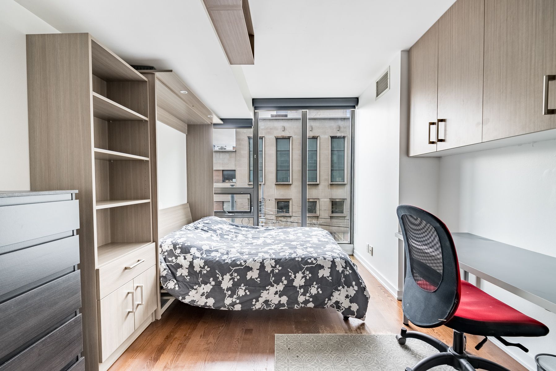 • Flexible second bedroom with Murphy bed for office use.