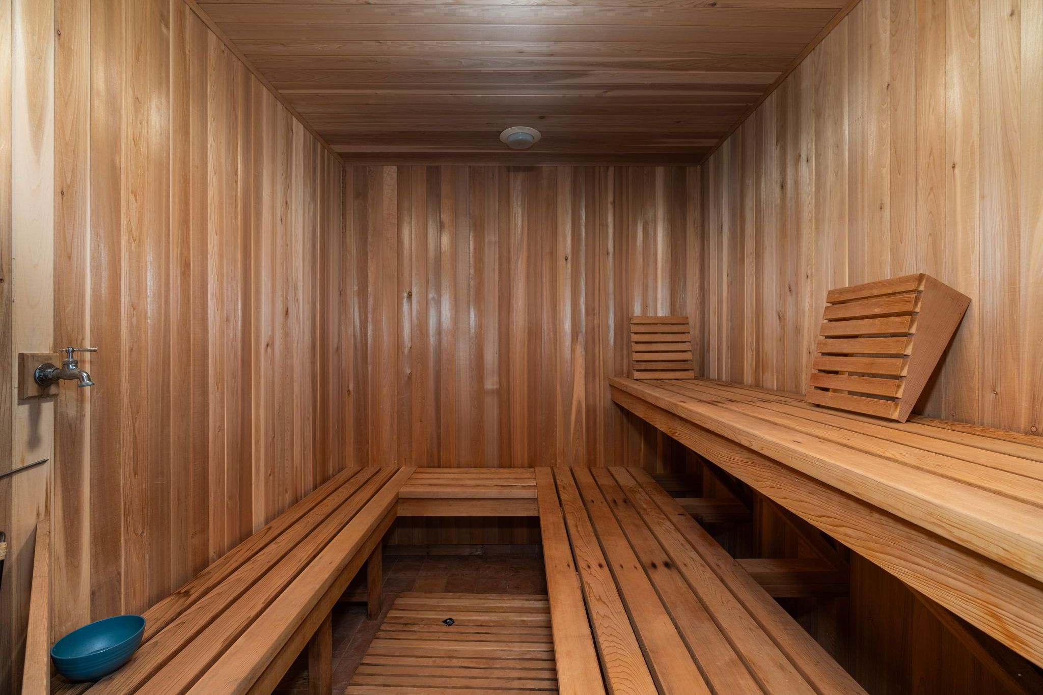 • Outdoor inground pool and cedar-lined sauna for relaxation.