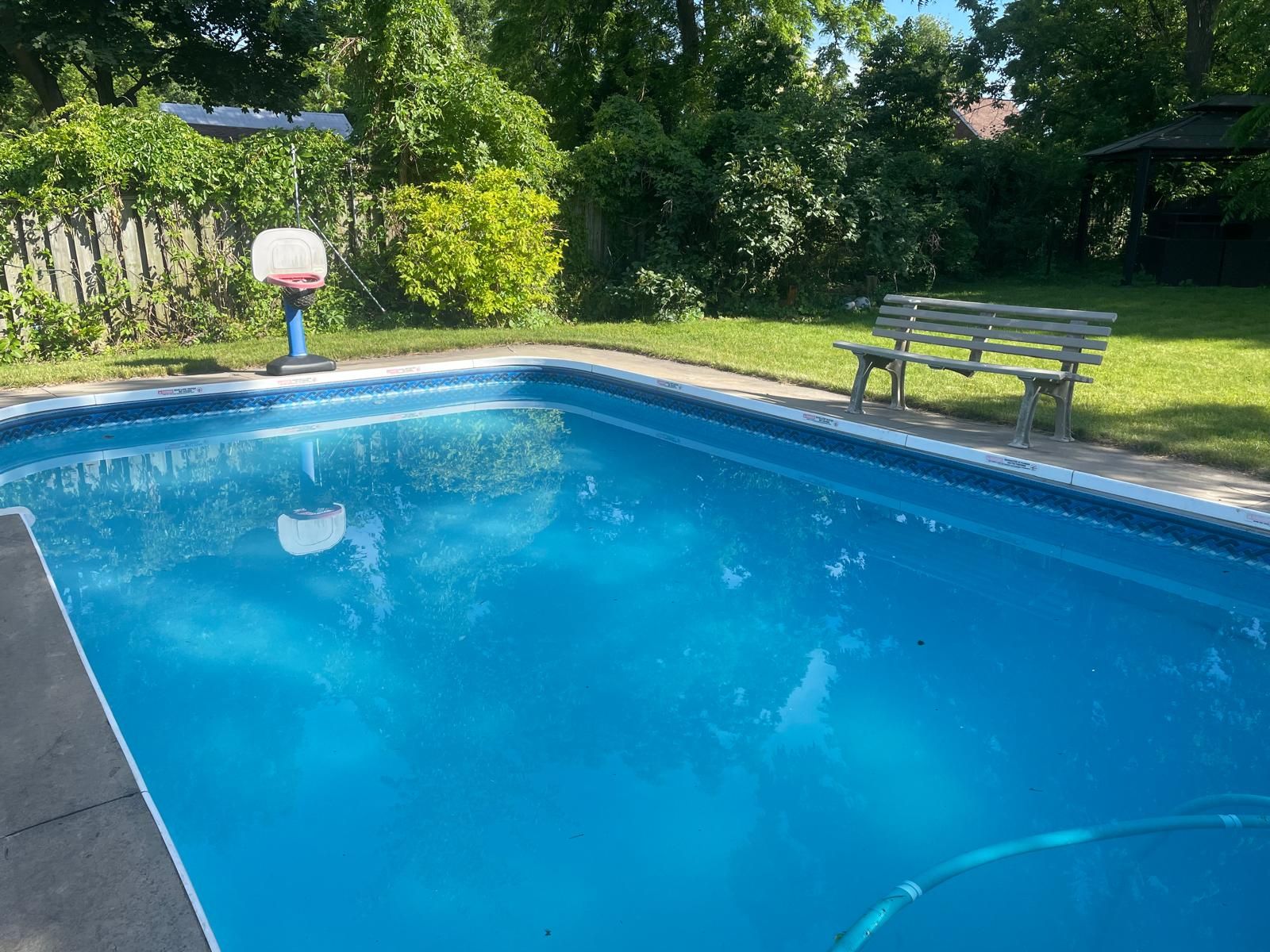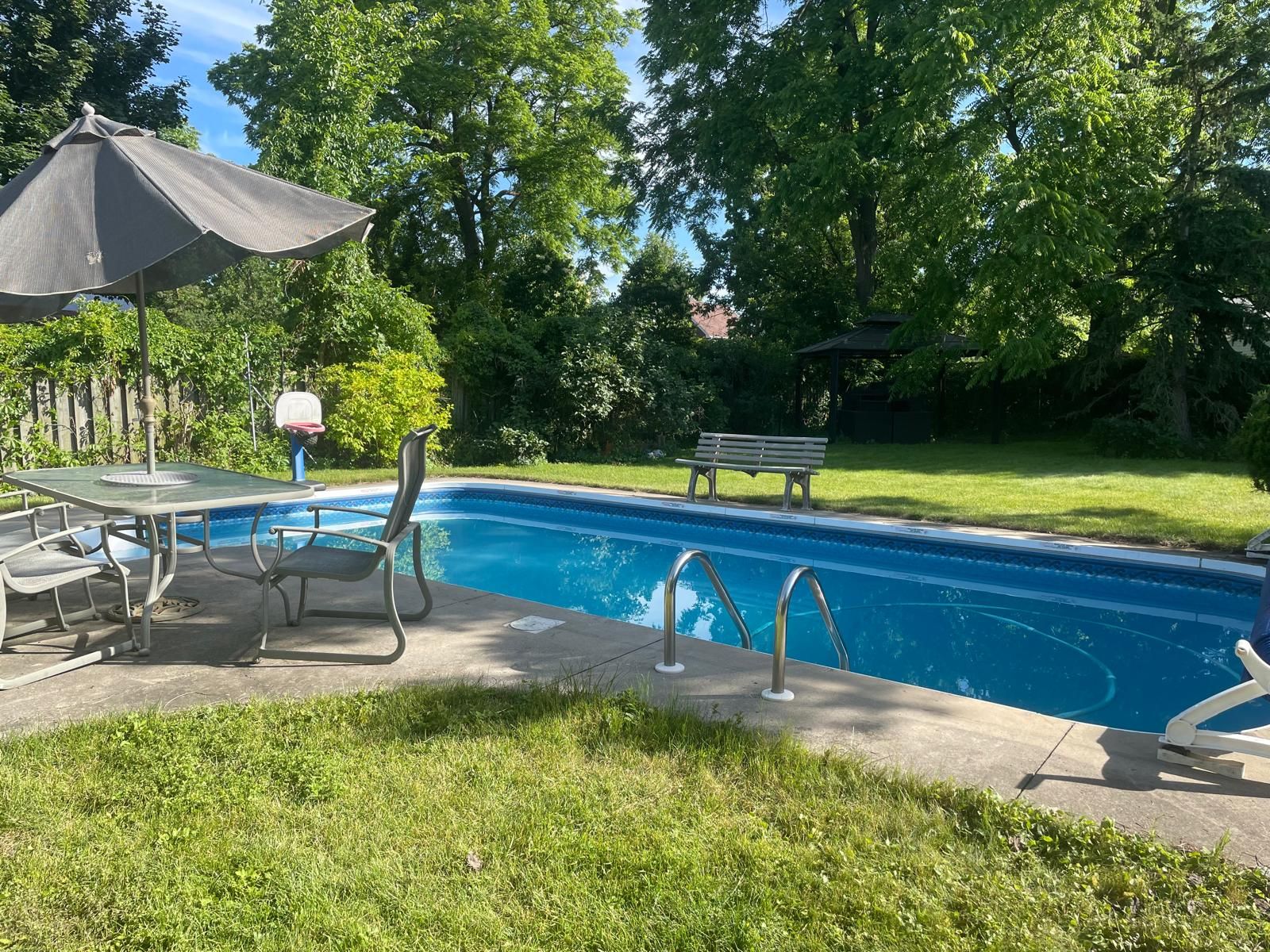 • Private backyard oasis with a bromine pool and outdoor gazebo.