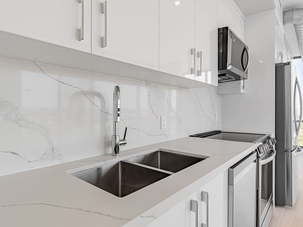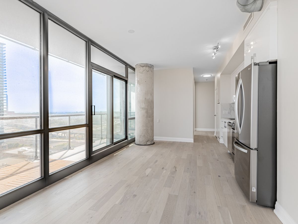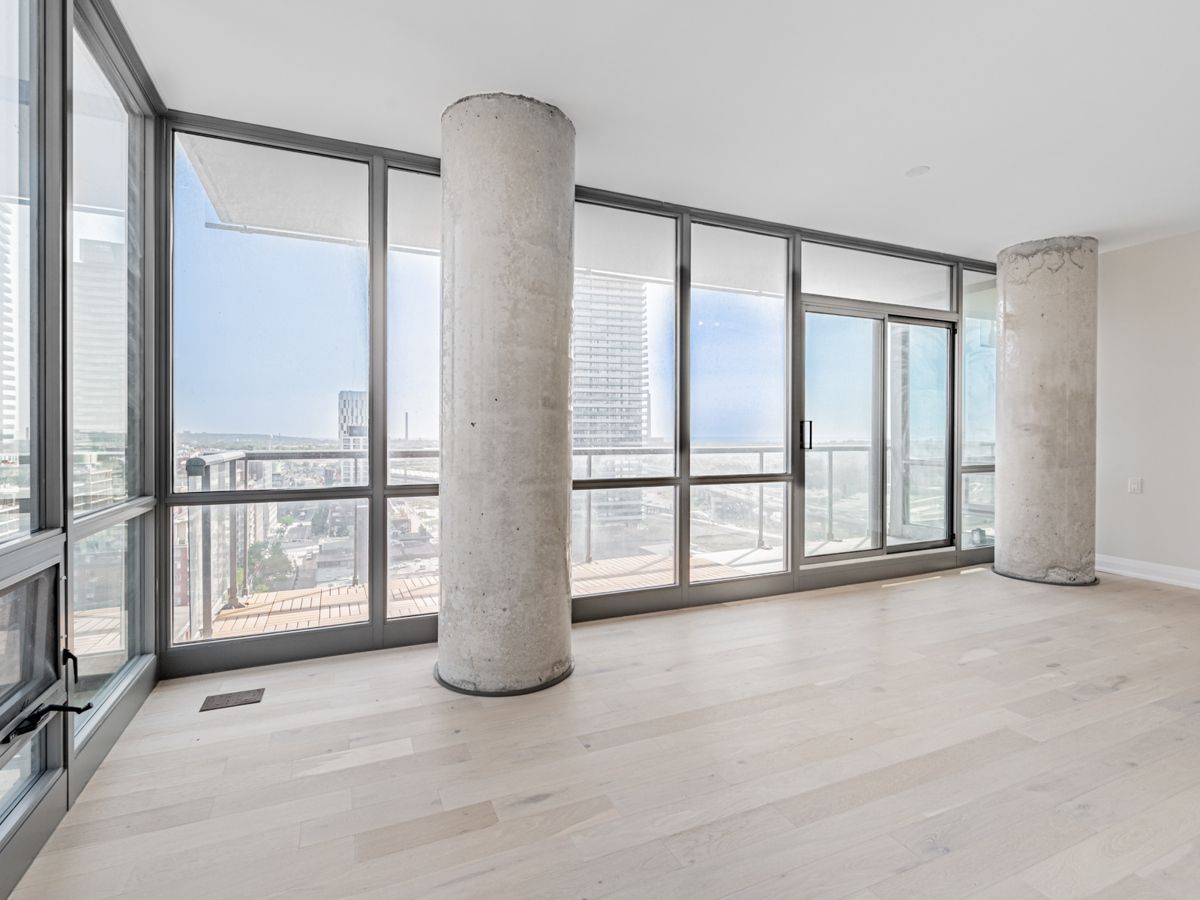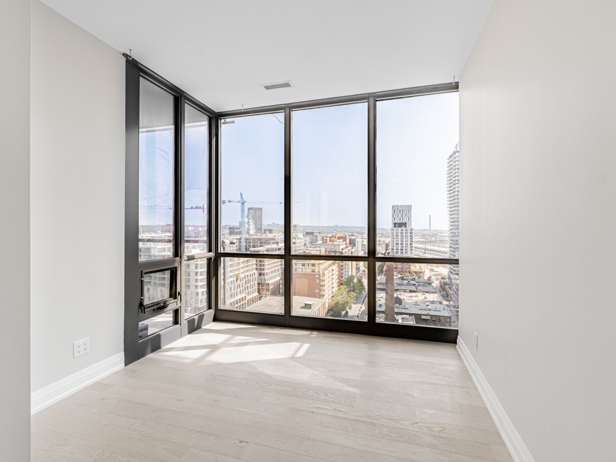 • Bright unit with floor-to-ceiling windows and city skyline views.