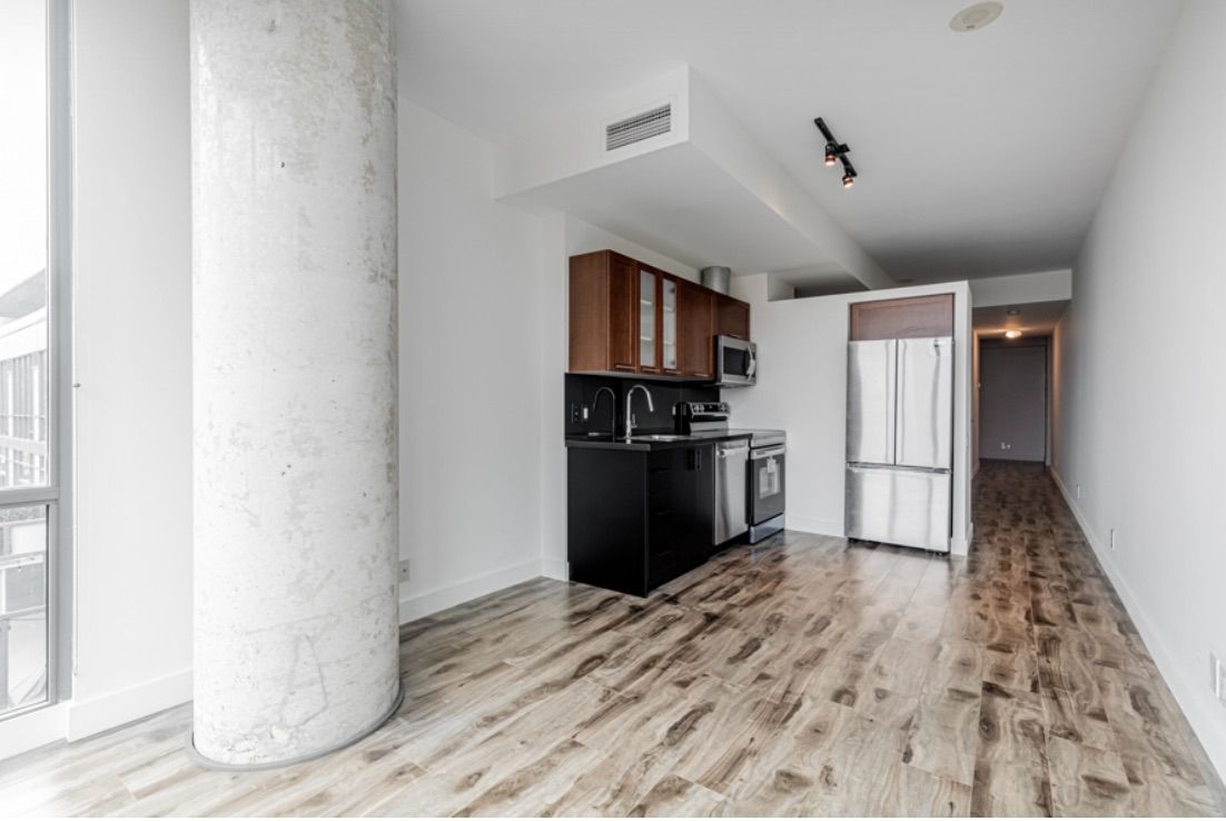 Welcome to 33 mill street, where historic charm meets modern living! This beautifully renovated and freshly painted 1-bedroom + den condo offers 642 sq. Ft. Of bright, open-concept space with soaring 10-foot polished concrete ceilings and stylish flooring throughout. The sleek, upgraded kitchen is equipped with stainless steel appliances and ample storage,making it perfect for cooking and entertaining. The versatile den is ideal as a home office or even a second bedroom. Located in one of toronto's most vibrant neighbourhoods, you'll be just steps from boutique shops, top-rated restaurants, theatres, transit, and the waterfront. Enjoy resort-style amenities, including a concierge, outdoor pool, hot tub, sun deck, and fitness centre. Renovated just two years ago with all-new appliances, this stunning condo is move-in ready. Don't miss your chance to own a piece of the distillery district's unique charm-book your showing today!
