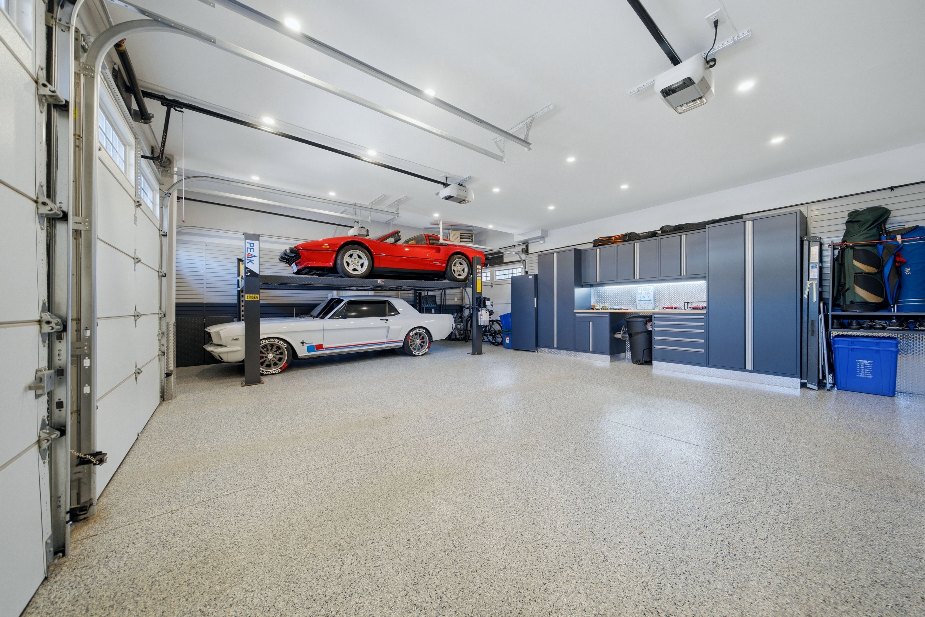 • Functional 4 car garage with built-in storage and epoxy flooring.