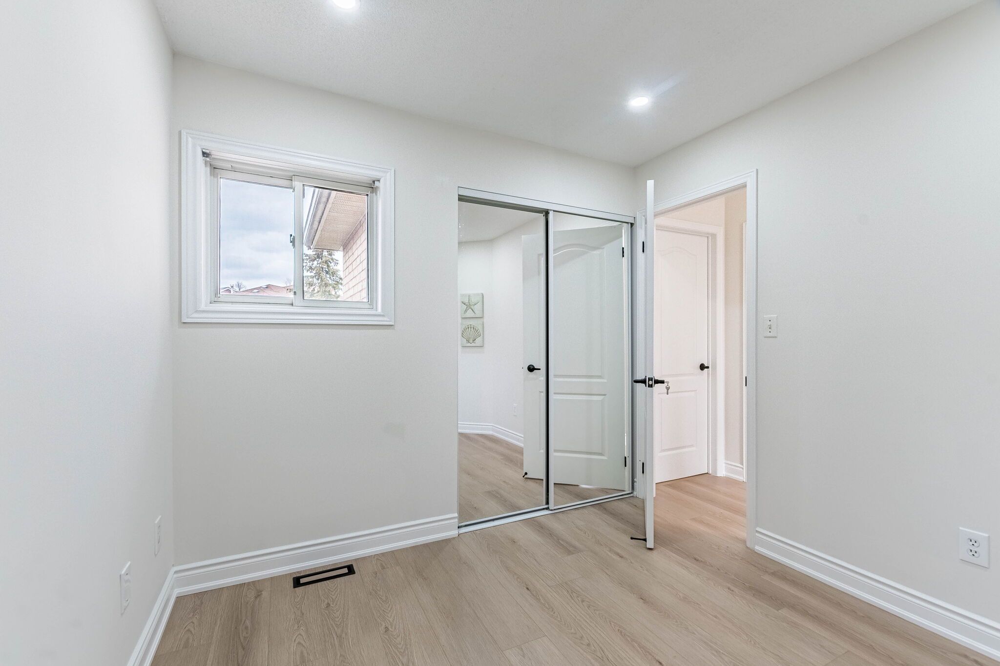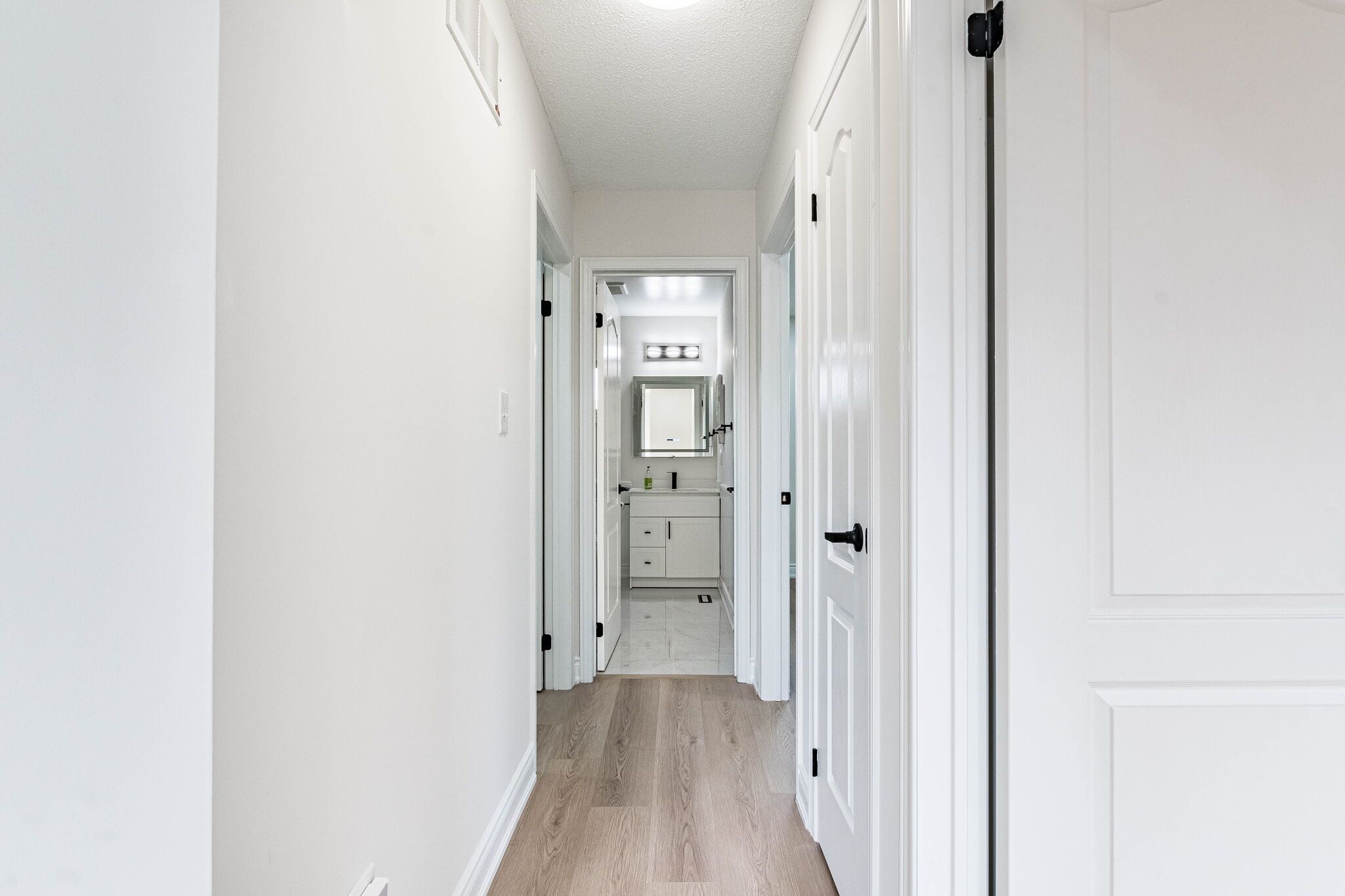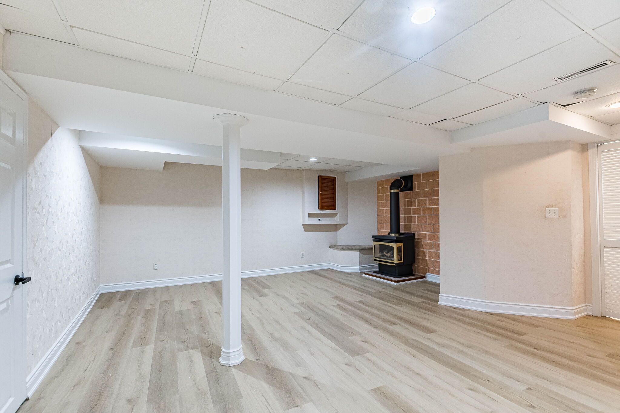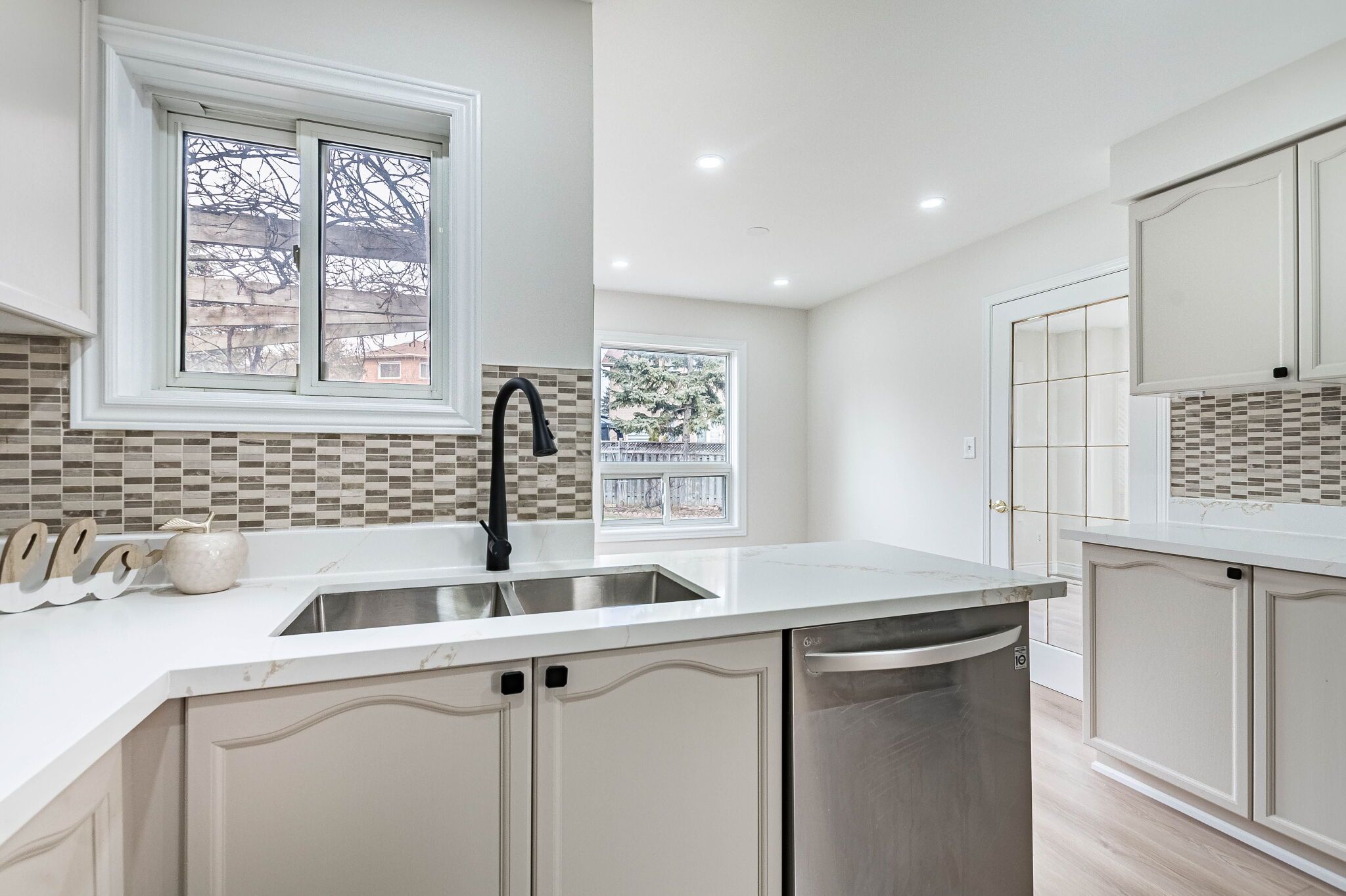 Quiet cul-de-sac location !! Newly renovated interior !! Beautiful detached home nestled on a quiet cul-de-sac in the highly desirable professors lake community. Situated on a large pie-shaped lot with an impressive 55' rear width and an east facing main entrance door, this property offers exceptional privacy with no through traffic and a peaceful setting. The home is bright and welcoming, filled with natural light throughout the day. The interior has been extensively renovated with modern finishes. The main and second floors feature new laminate flooring throughout, complemented by pot lights and a fresh coat of paint across the entire home. The kitchen has been updated with quartz countertops and newer appliances (2022), creating a stylish and functional space for everyday living and entertaining. The second floor includes generously sized bedrooms and a newly renovated full bathroom. The finished basement provides additional living space with a spacious recreation room, vinyl flooring, and a newer 4-piece bathroom-perfect for guests, extended family, or a flexible entertainment area. Outside, enjoy a private backyard with a wooden deck, perfect for outdoor use and entertaining. The home also features a single-car garage with convenient loft storage, plus a two-car driveway for additional parking. Roof replaced in 2022. Side yard offers potential for a separate basement entrance. Large pie-shaped lot !! Finished basement with 4 pc bathroom !! 3 parking spaces !! Steps to professors lake, beach, schools, parks, rec centre, transit & more !!