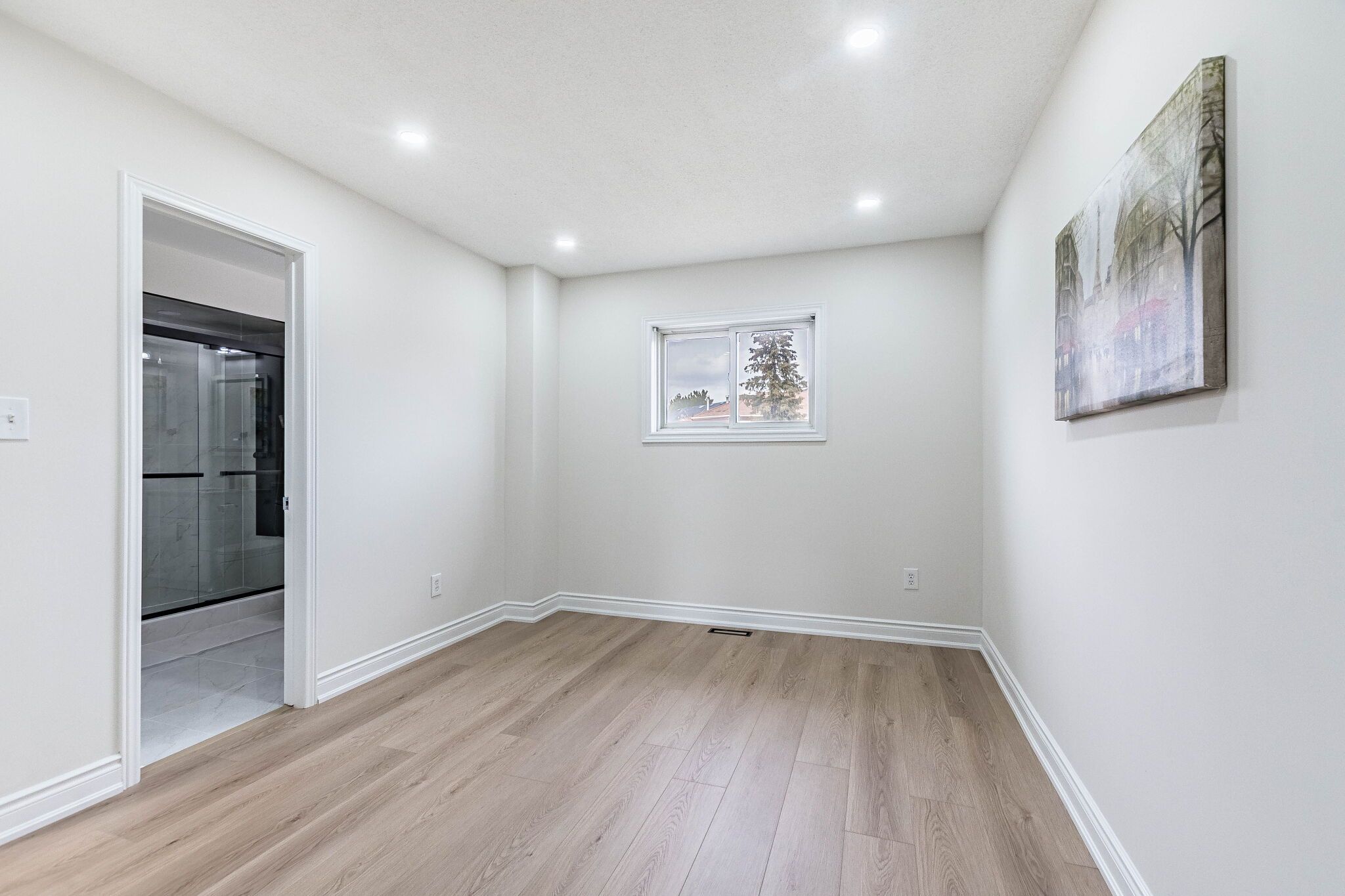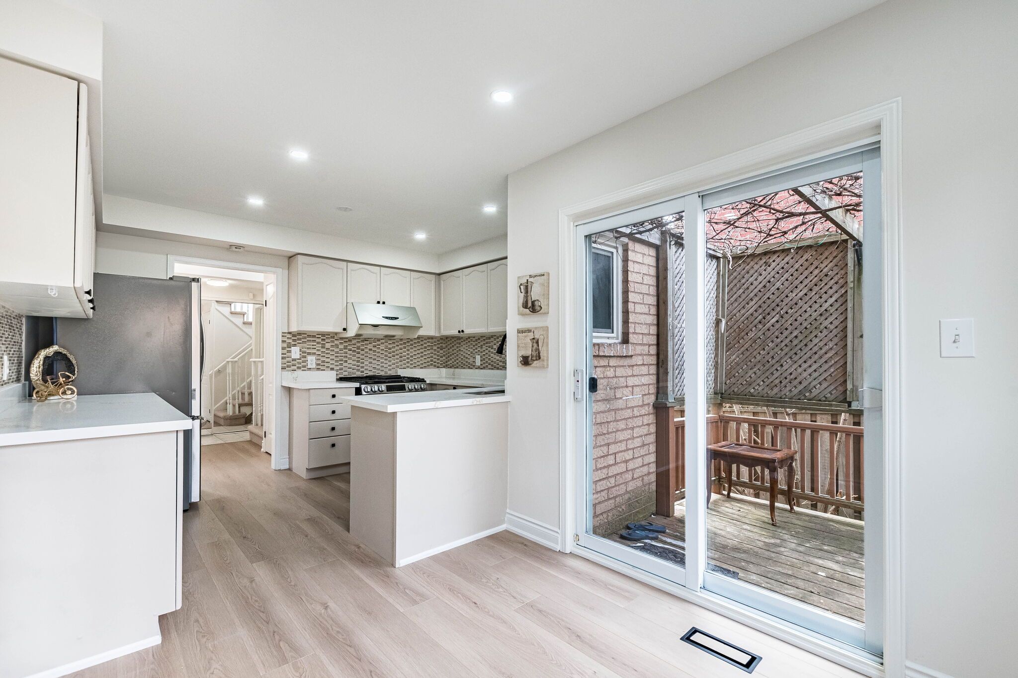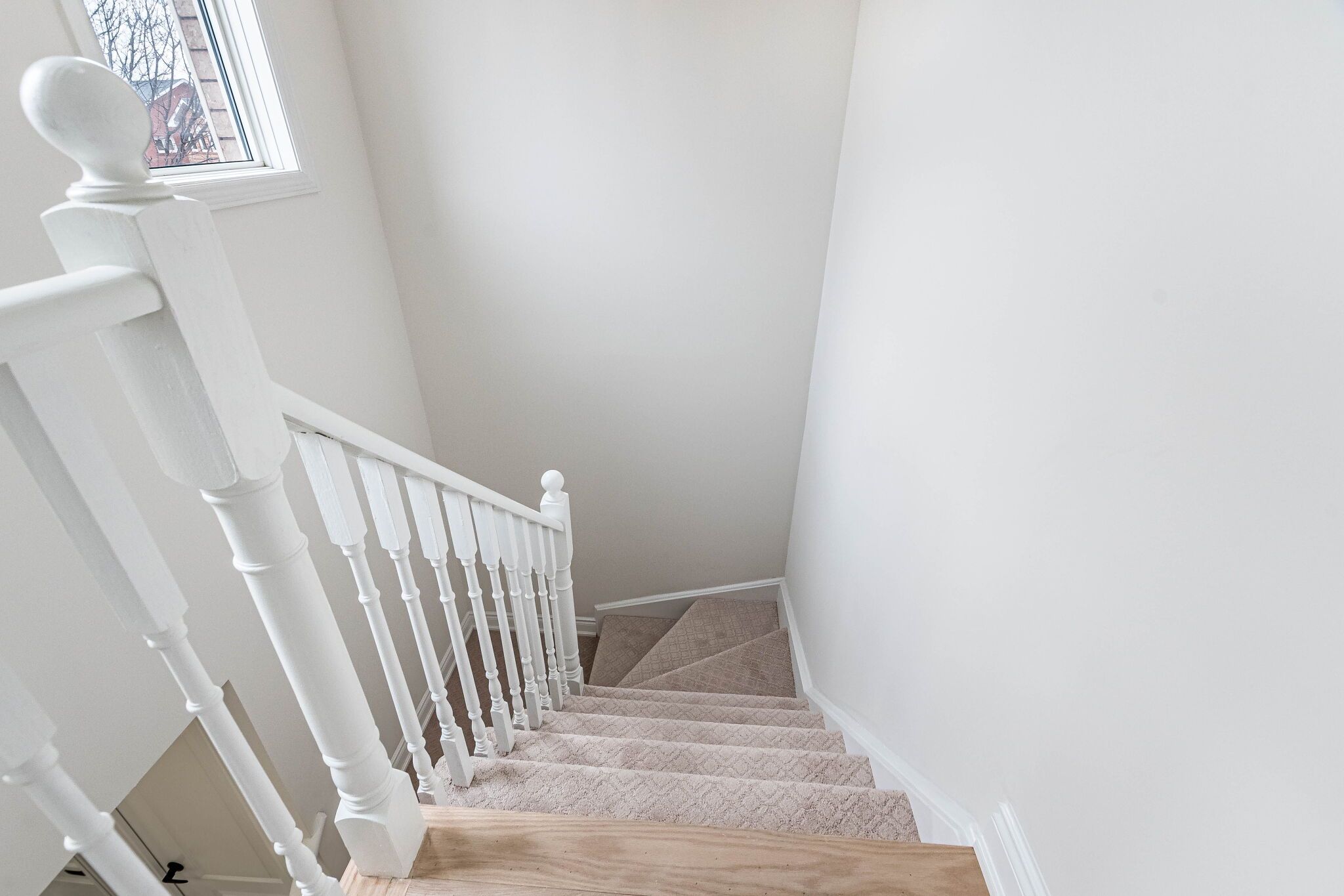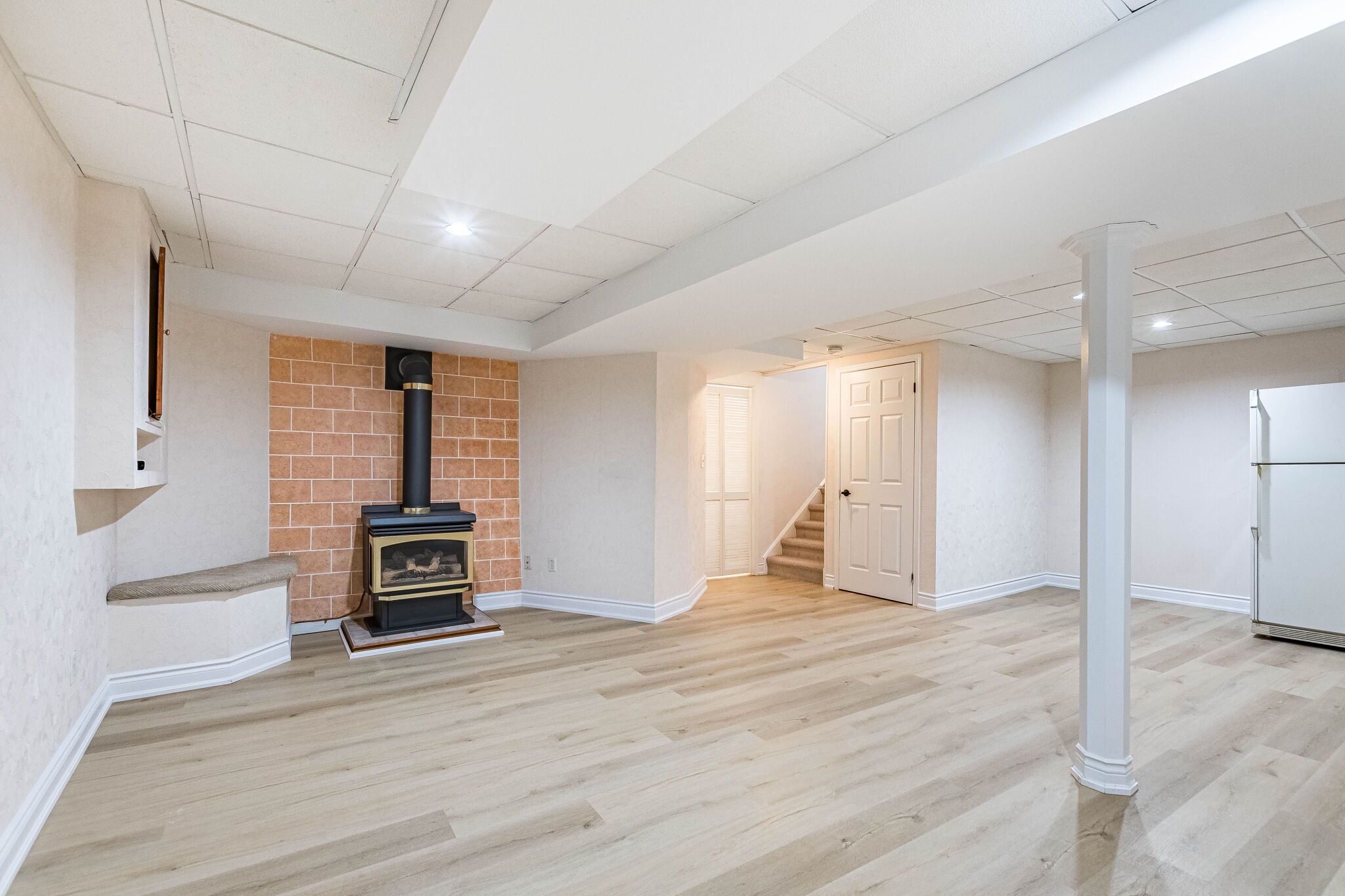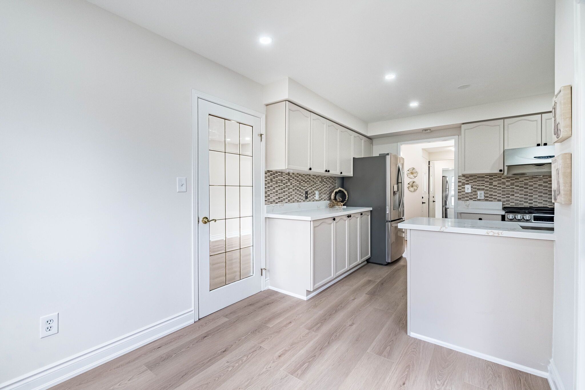 Quiet cul-de-sac location !! Newly renovated interior !! Beautiful detached home nestled on a quiet cul-de-sac in the highly desirable professors lake community. Situated on a large pie-shaped lot with an impressive 55' rear width and an east facing main entrance door, this property offers exceptional privacy with no through traffic and a peaceful setting. The home is bright and welcoming, filled with natural light throughout the day. The interior has been extensively renovated with modern finishes. The main and second floors feature new laminate flooring throughout, complemented by pot lights and a fresh coat of paint across the entire home. The kitchen has been updated with quartz countertops and newer appliances (2022), creating a stylish and functional space for everyday living and entertaining. The second floor includes generously sized bedrooms and a newly renovated full bathroom. The finished basement provides additional living space with a spacious recreation room, vinyl flooring, and a newer 4-piece bathroom-perfect for guests, extended family, or a flexible entertainment area. Outside, enjoy a private backyard with a wooden deck, perfect for outdoor use and entertaining. The home also features a single-car garage with convenient loft storage, plus a two-car driveway for additional parking. Roof replaced in 2022. Side yard offers potential for a separate basement entrance. Large pie-shaped lot !! Finished basement with 4 pc bathroom !! 3 parking spaces !! Steps to professors lake, beach, schools, parks, rec centre, transit & more !!