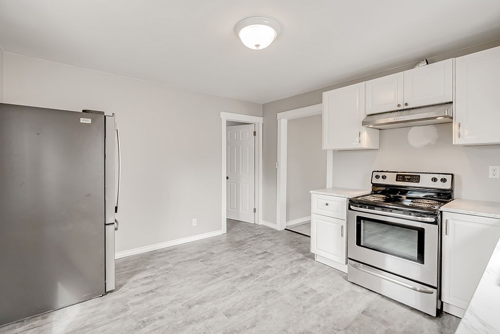 • Modern eat-in kitchen equipped with stainless steel appliances and updated cabinetry.
