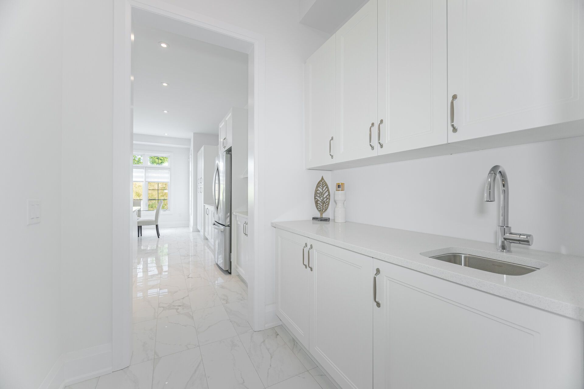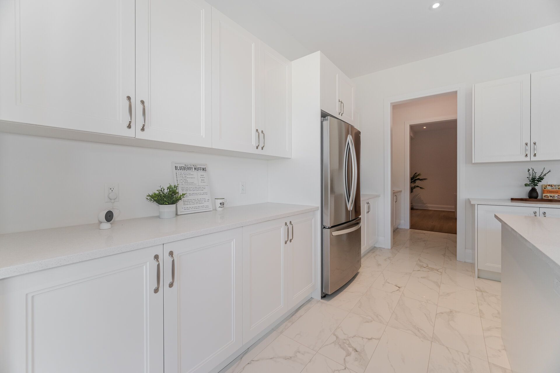 • Chef's kitchen with quartz countertops, large island, and walk-in pantry.