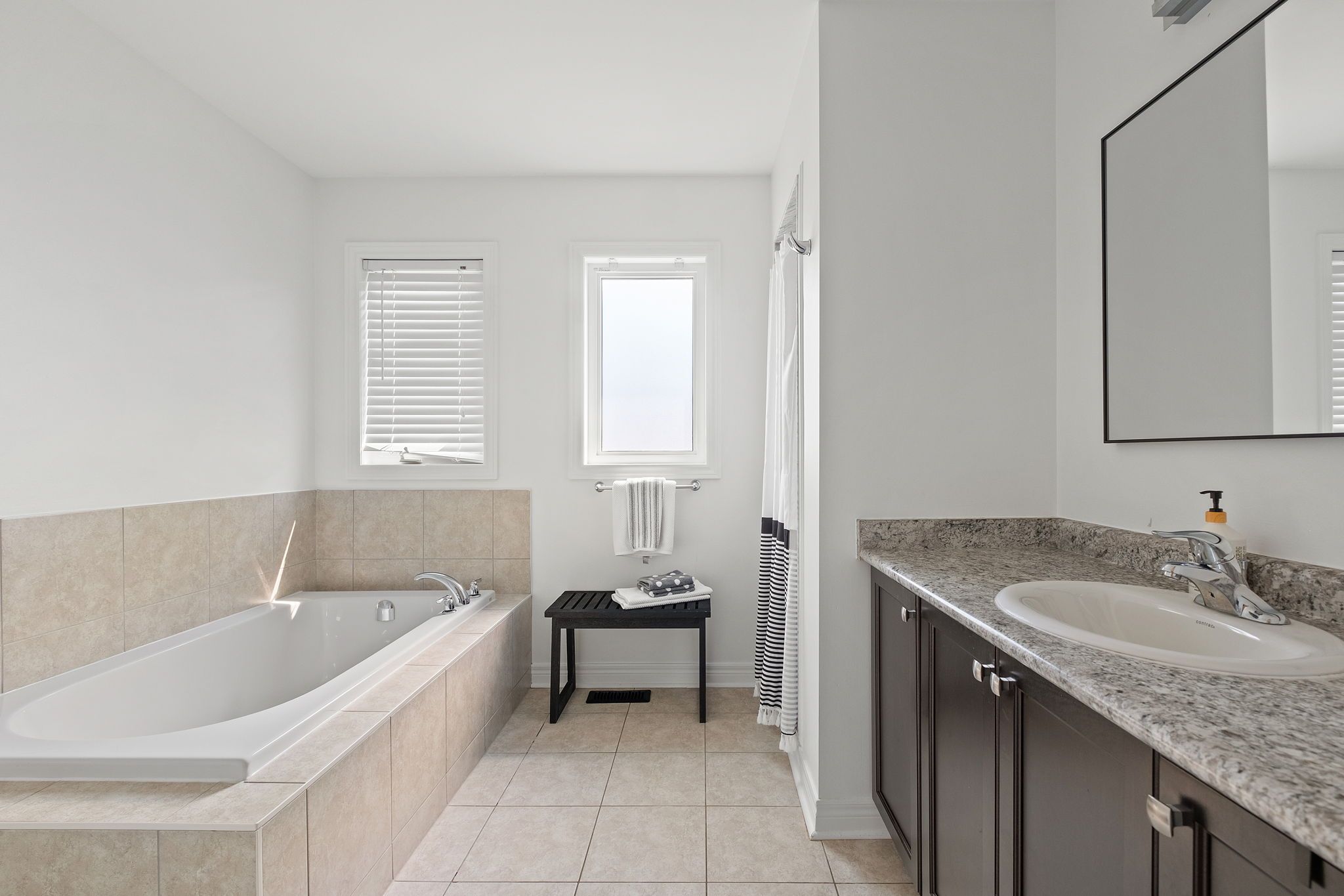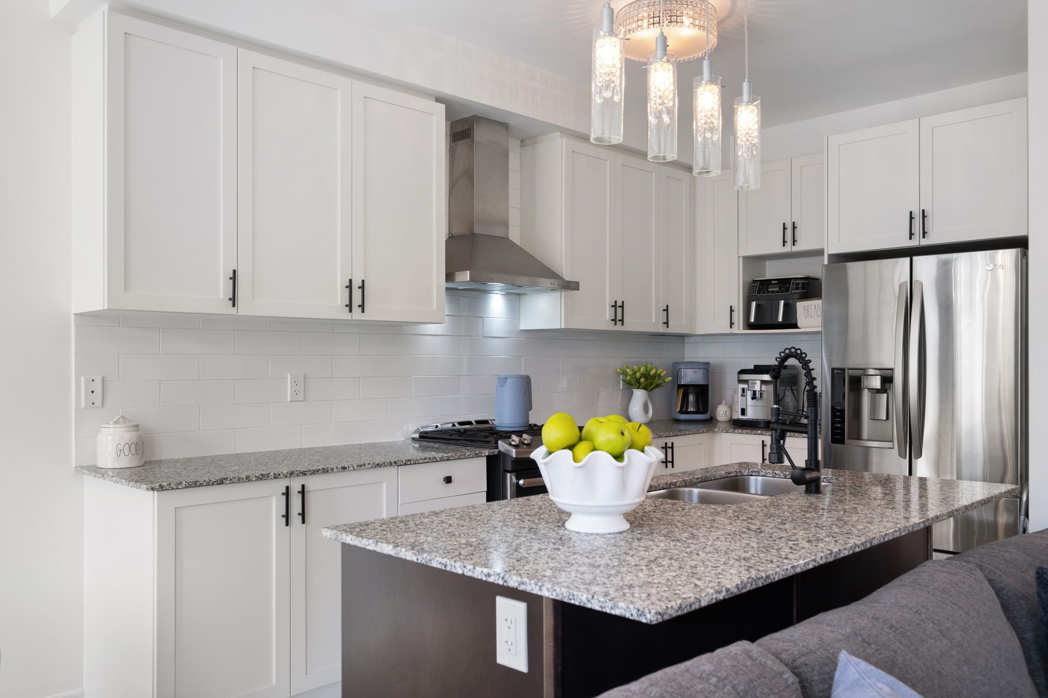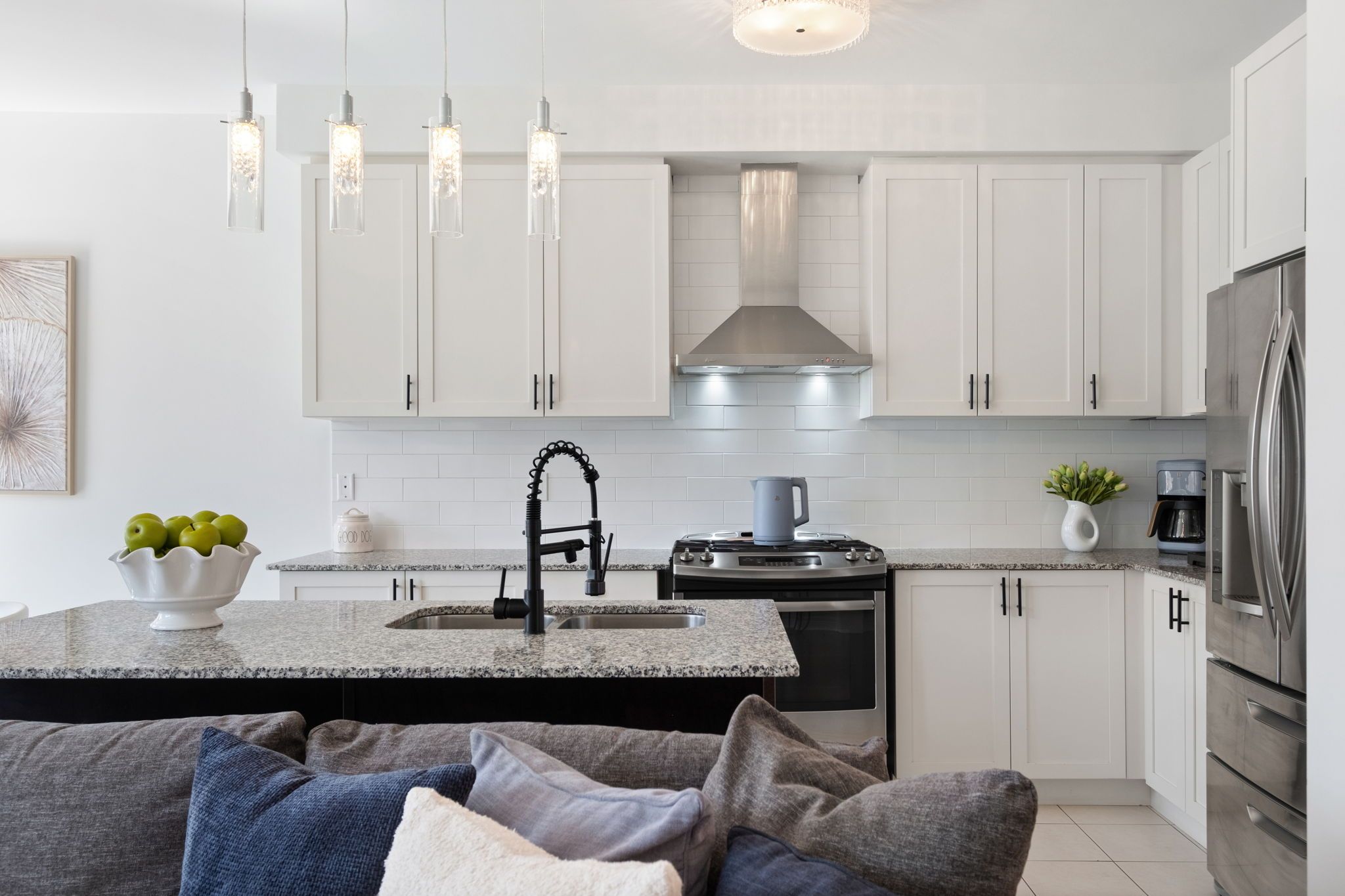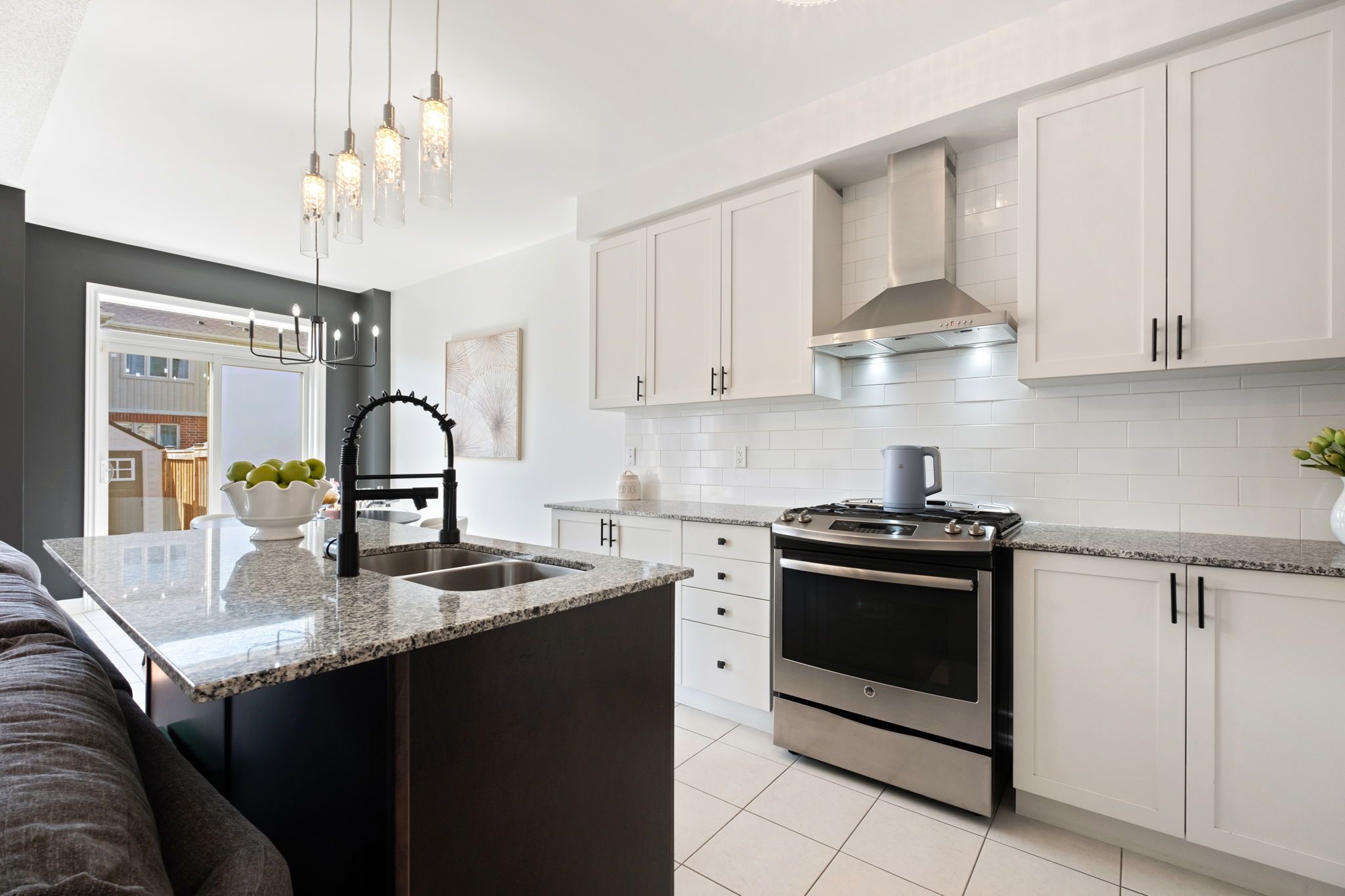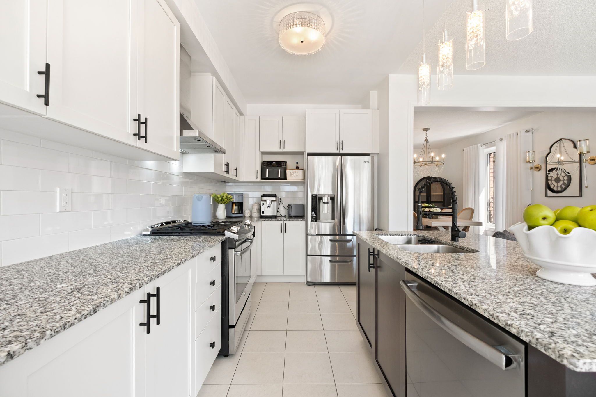• Upgraded kitchen with granite countertops, gas stove, and modern appliances.