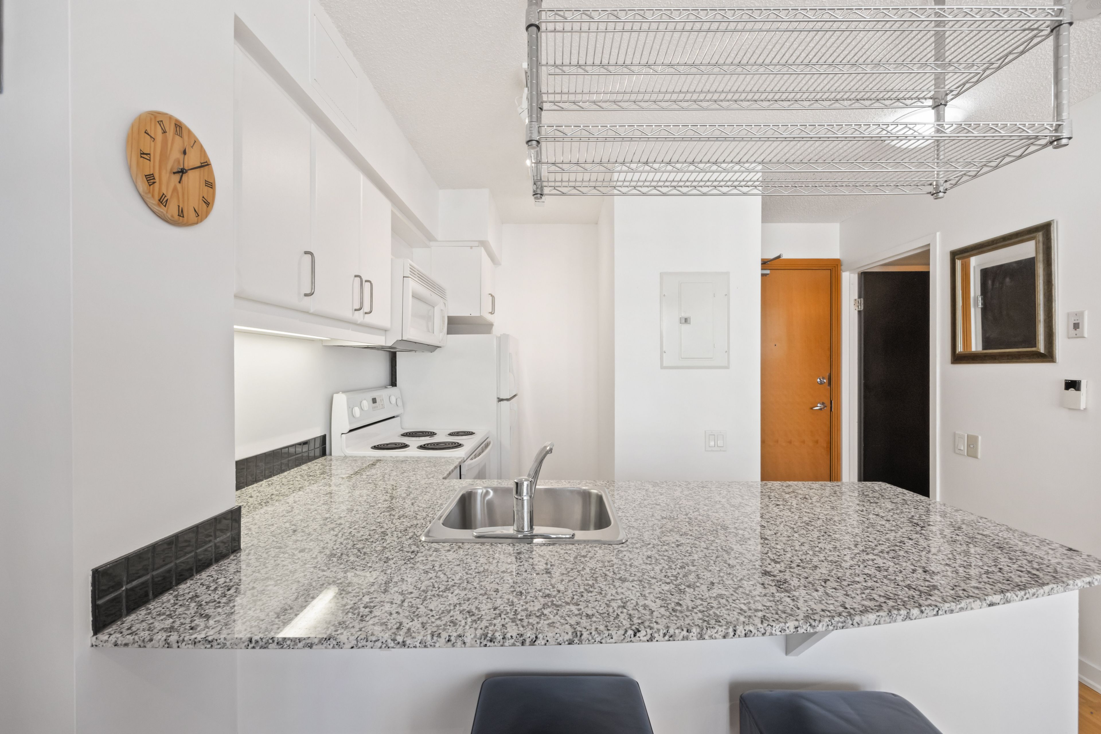 • Well-sized kitchen with granite countertops and breakfast bar.