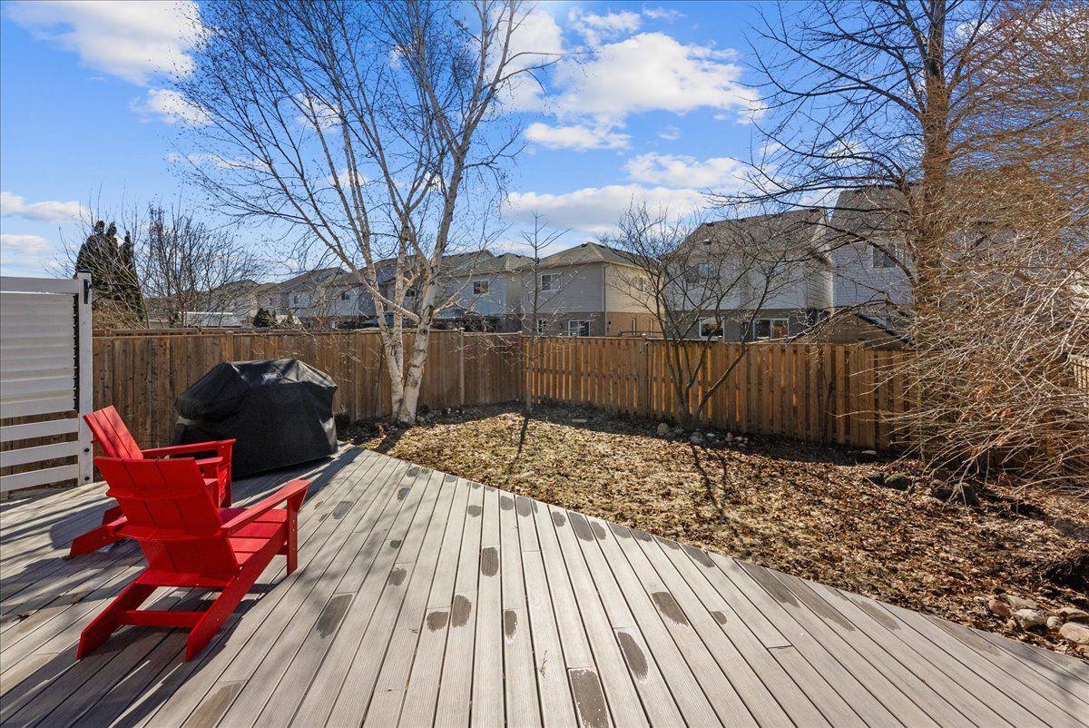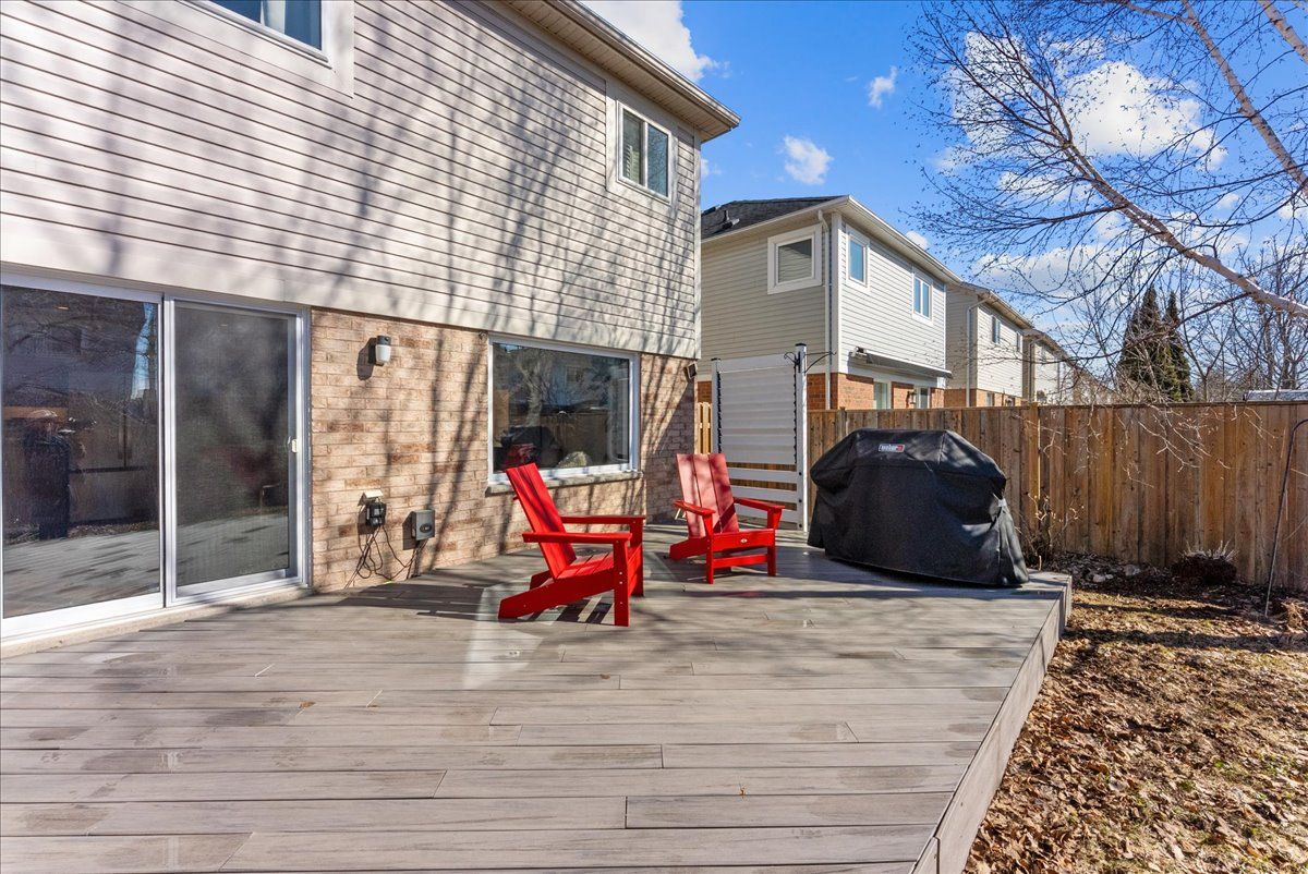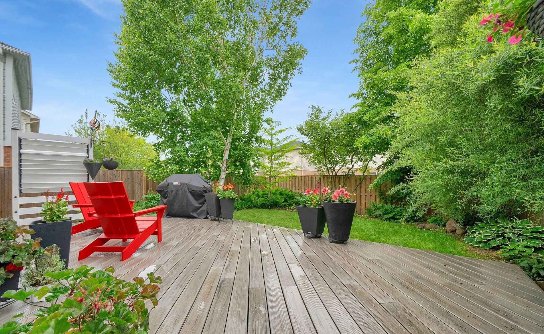 • Private backyard with a composite deck and beautiful mature gardens.