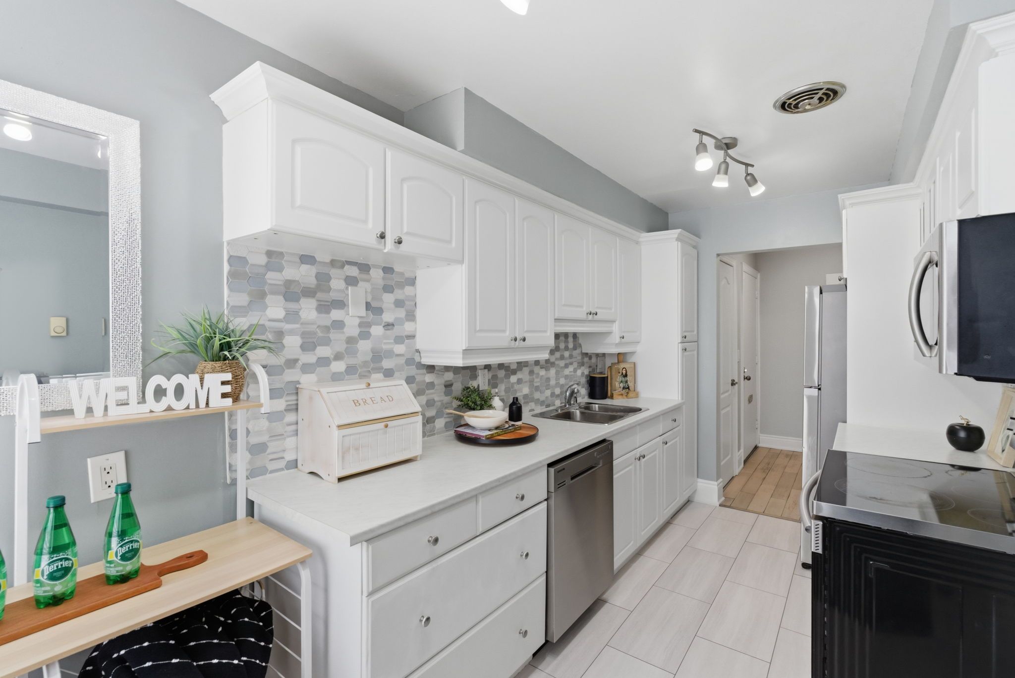 • Functional kitchen with plenty of cabinetry and workspace for meal prep.