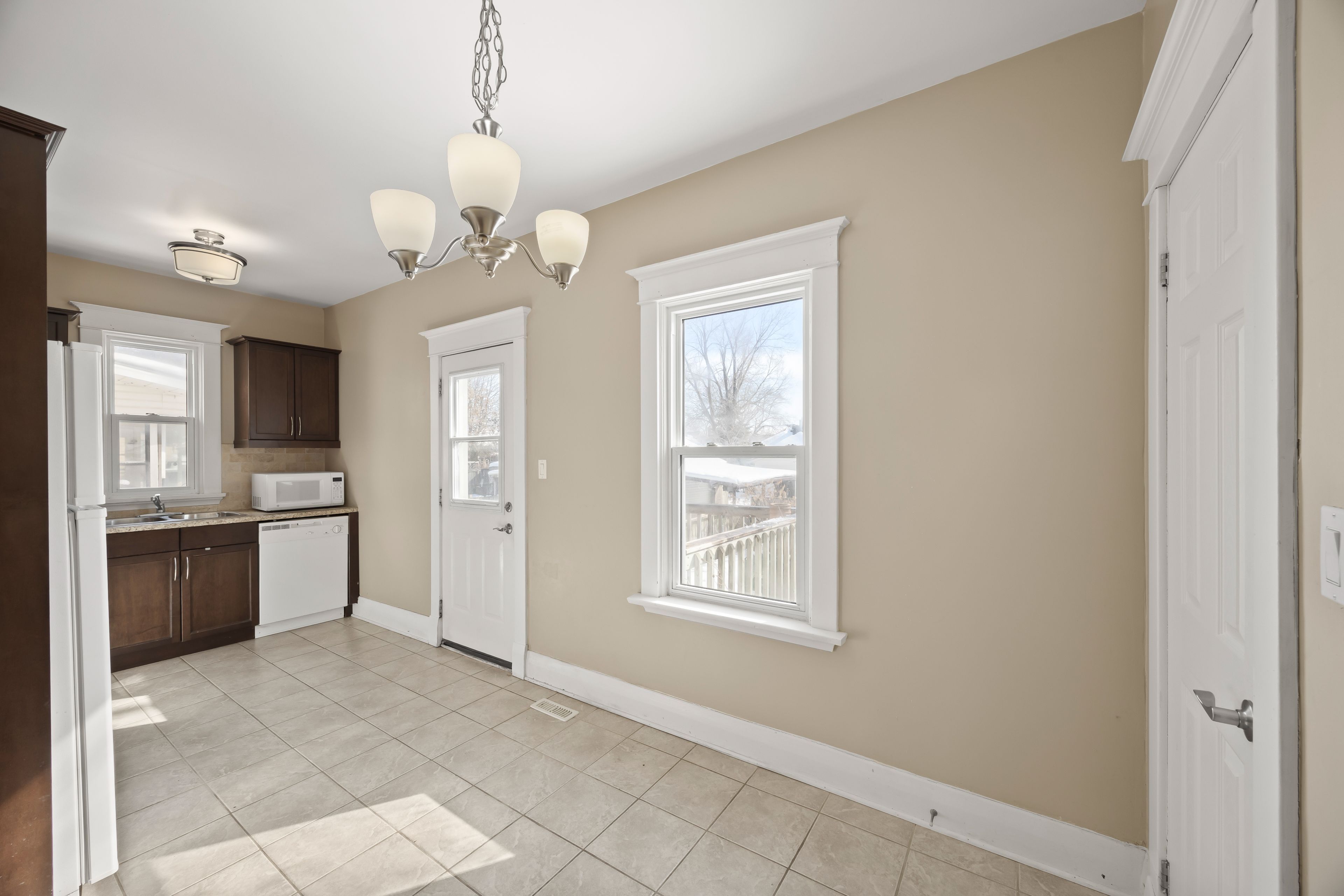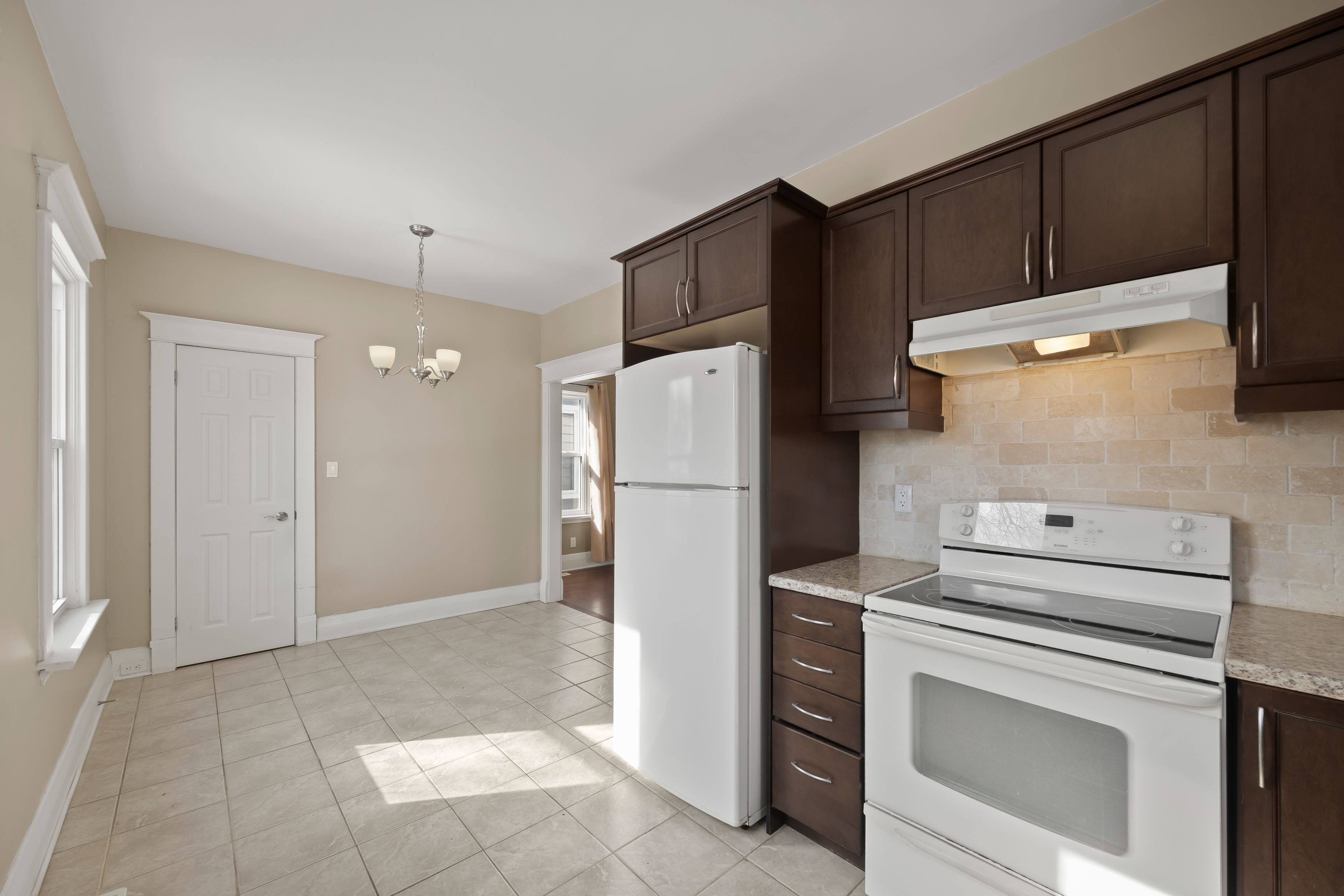 • Refreshed kitchen with maple cabinetry and modern tile flooring.