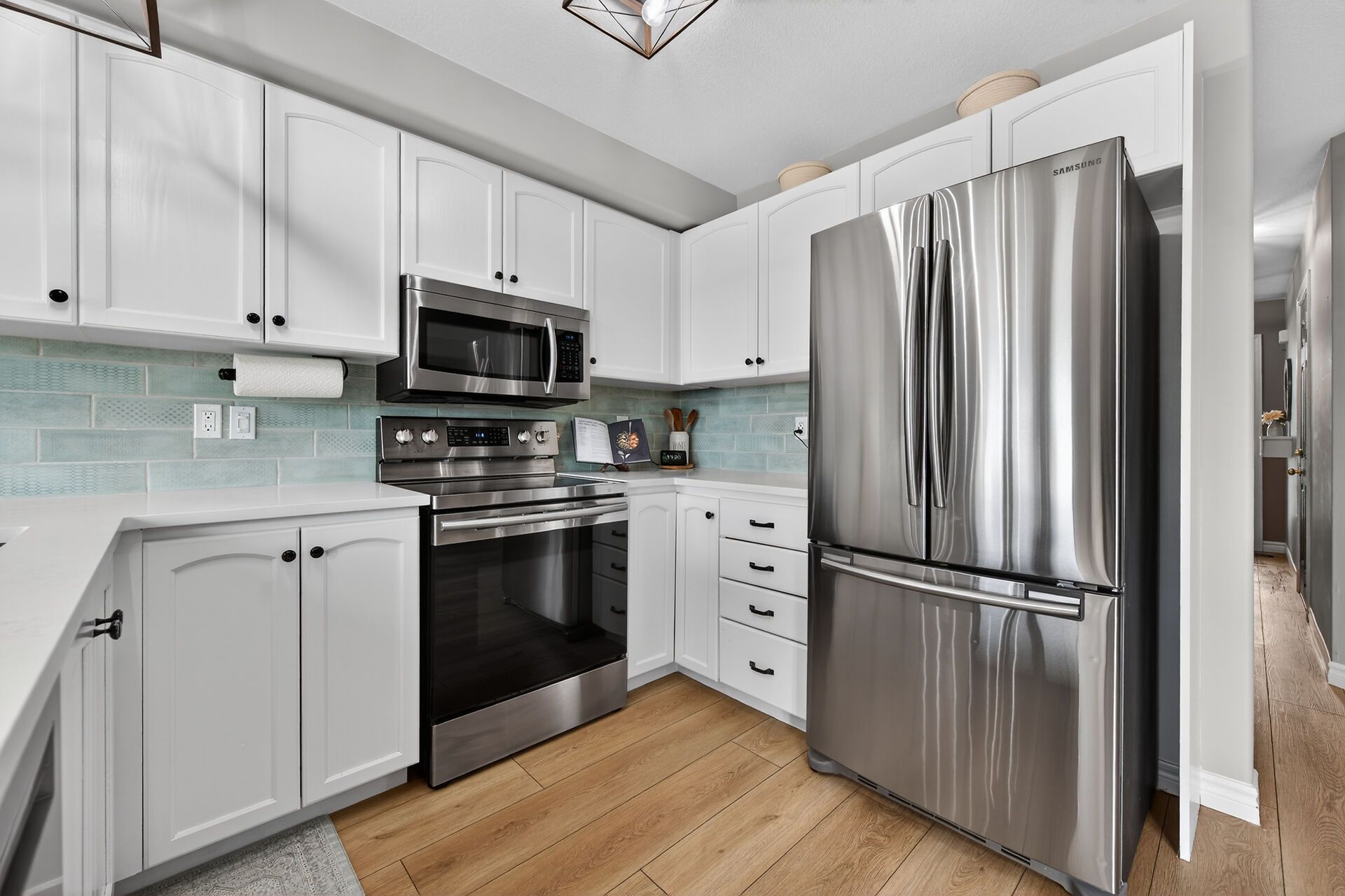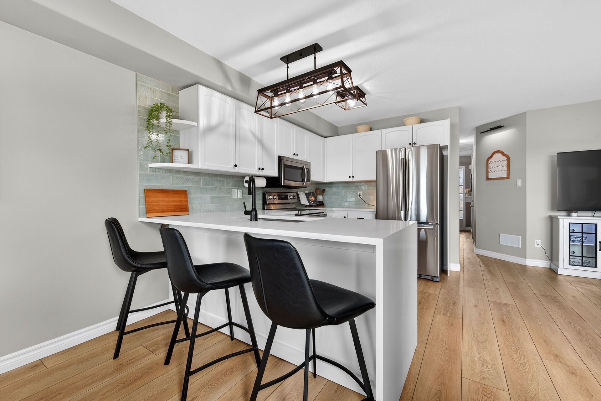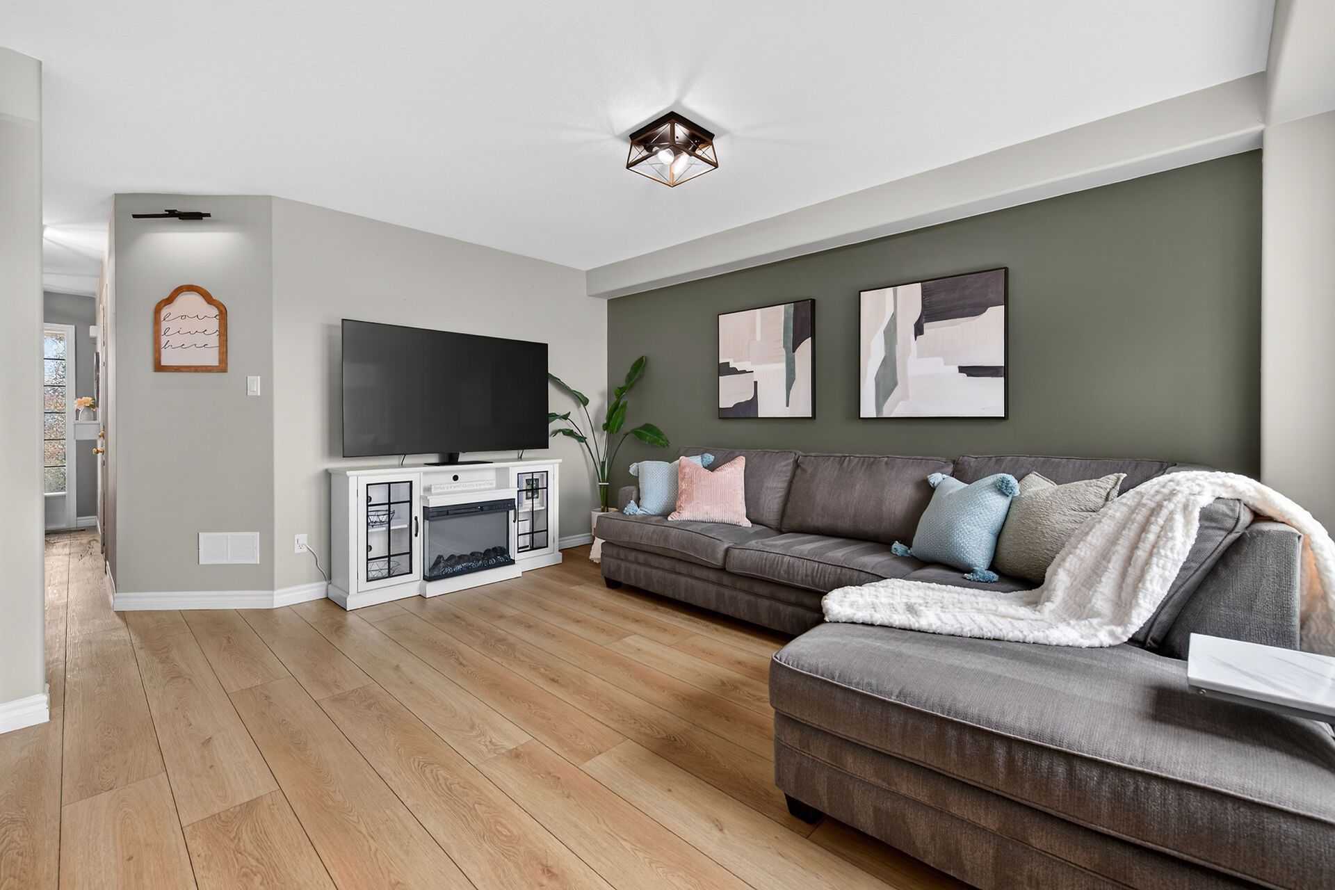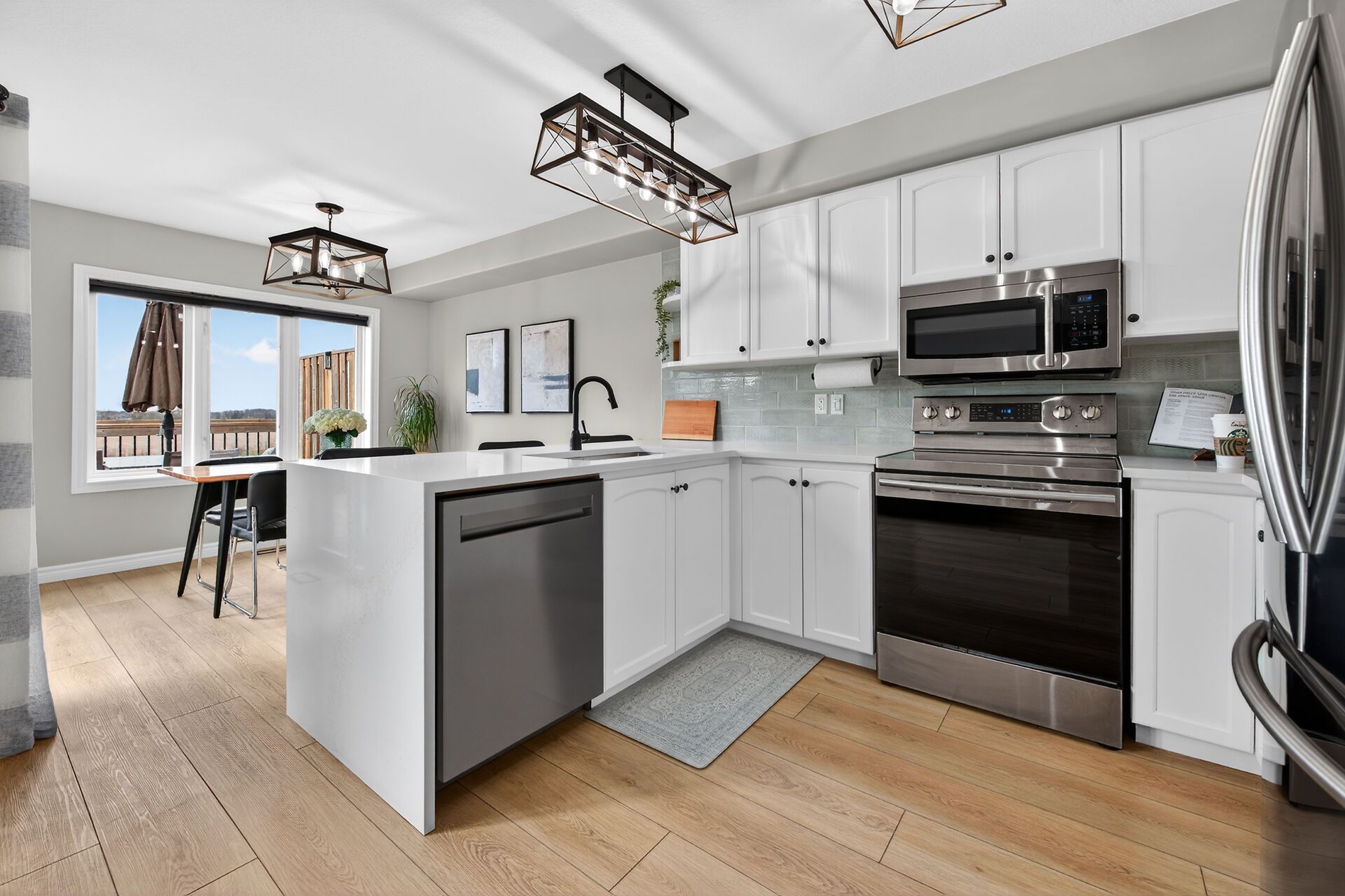 Beautifully maintained 3-bedroom, 2-bath townhome offers the ideal blend of functionality and style, designed for modern family living. Nestled in a sought-after, family-oriented neighbourhood, enjoy the convenience of walking to 2 schools, parks, library, shops, banks, medical and dental offices, bakeries, restaurants and more. This community has everything! The deep yard and greenspace located directly behind provides a safe and accessible space for children to play and families to enjoy the outdoors together. Pride of ownership is evident throughout this well cared for home. No need for renovations or repairs. This home is ready for you to move in and start making memories! Over 1700 sqft of living space is completely carpet free. Improvements include: main level luxury vinyl flooring (2022), kitchen updated with waterfall quartz countertop (2022), main bath reno (2022), roof shingles (2022). New dishwasher and new washer and dryer (2026). The private back deck (2021) is a perfect place for barbecues, gathering and relaxing. Pets are welcomed and will appreciate the fenced yard. Enjoy leisurely strolls with your furry friends through this safe and welcoming community. Don't miss your chance to own this exceptional, turn-key home in a sought-after neighbourhood.