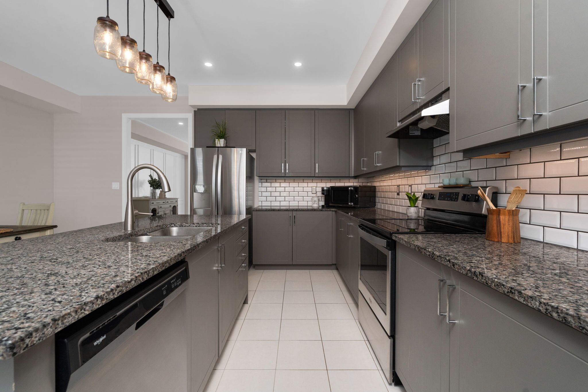 • Contemporary kitchen featuring quartz countertops and breakfast bar.