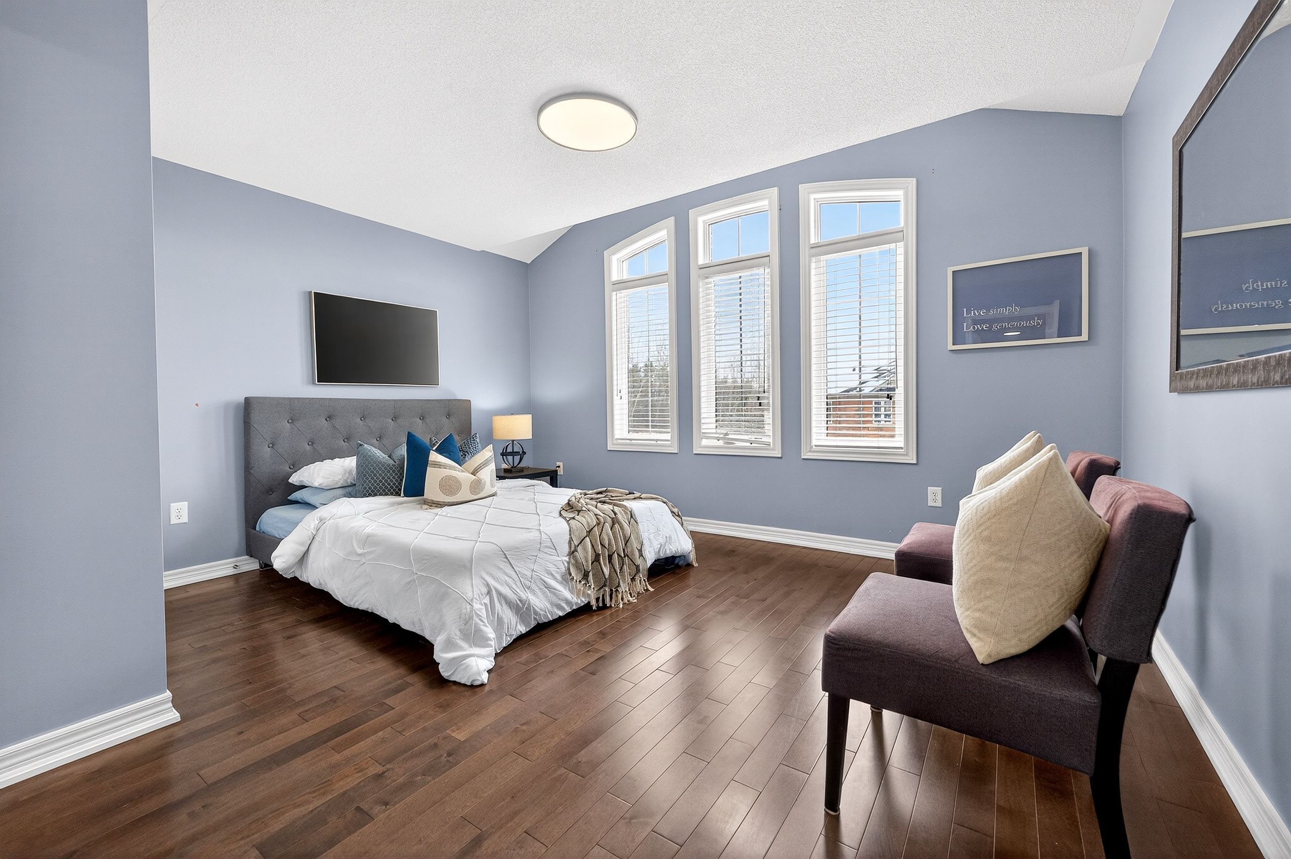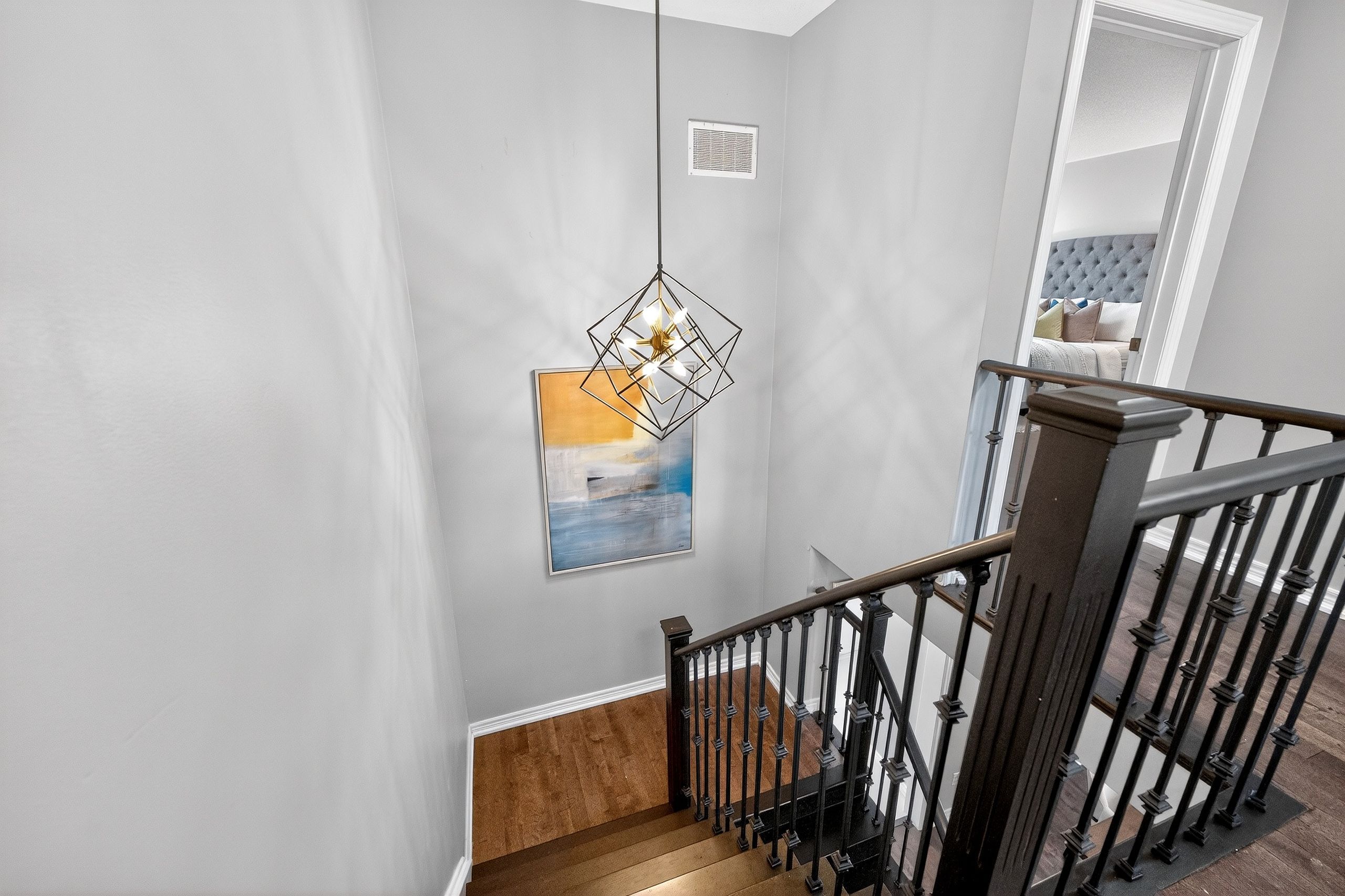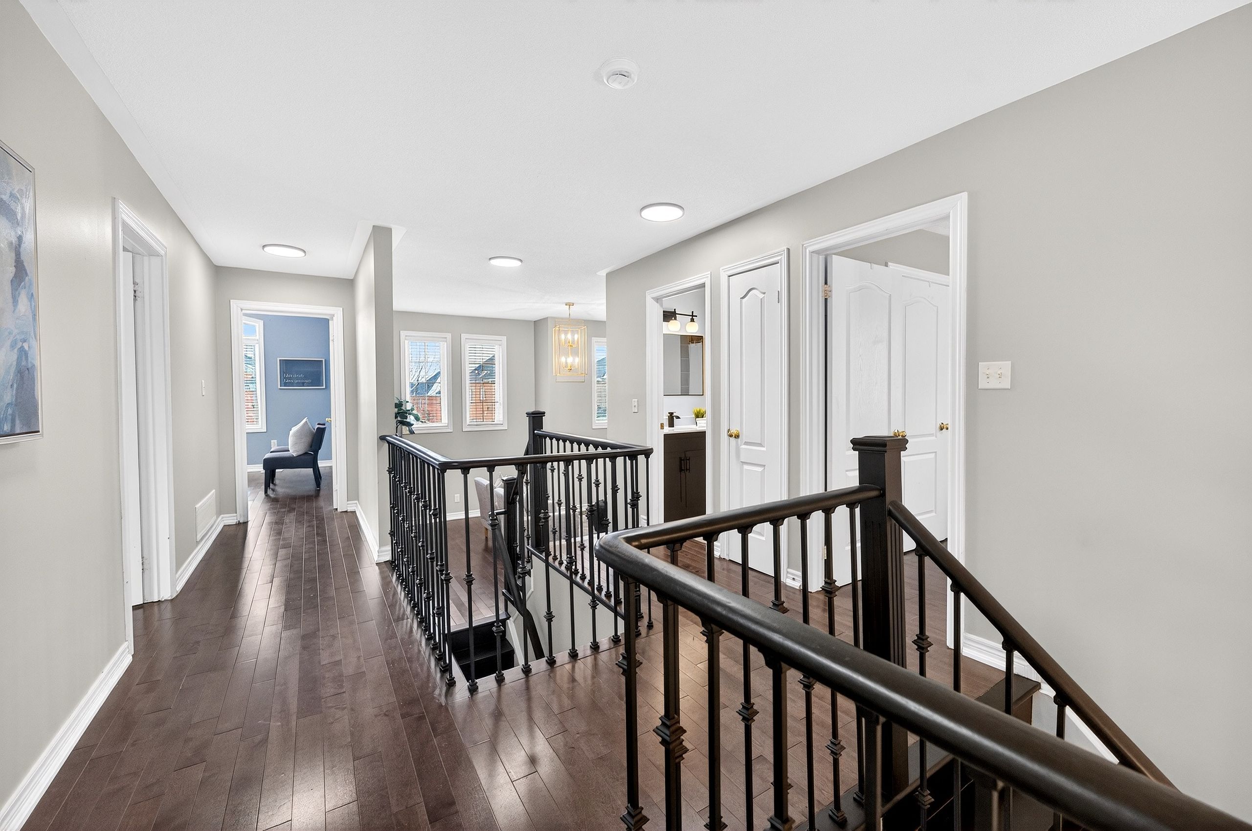 Stunning great gulf home situated on a premium lot with no neighbours on one side, offering added privacy and abundant natural light! This bright & spacious home features 9 ft ceilings on the main floor, a functional layout with a main floor office, and a finished basement. Renovated kitchen (2021) featuring porcelain tiles, upgraded cabinetry & stainless steel appliances, overlooking a cozy family room with fireplace and views of the backyard. Elegant finishes include hardwood flooring throughout and an oak staircase with iron pickets (2019), along with upgraded light fixtures and a stylish accent wall in the main hallway. Unique second floor layout features a media/entertainment room with its own separate staircase while still connected to the upper level. The primary bedroom offers a luxurious upgraded 5-piece ensuite and his & hers walk-in closets. Bedrooms 2 & 3 share a semi-ensuite, plus an additional 4-piece bath. All three bathrooms on the second floor are upgraded. Convenient main floor laundry with mudroom and side entrance, providing potential for separate basement access. The finished basement includes a rec room, kitchen, 3-piece bathroom, two roomsm & pot lights throughout. Recent upgrades include roof (2024) and ev charger (2024). Located within walking distance to french immersion, public & catholic schools, transit, parks & trails. Minutes to shopping, go station & highways 401, 412 & 407. Move-in ready and perfect for families seeking space, comfort & convenience!