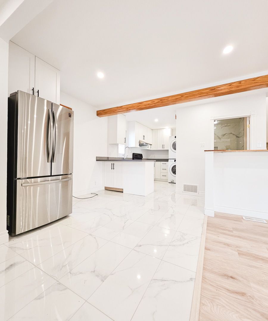 • Kitchen features elegant stone countertops and stainless steel appliances.