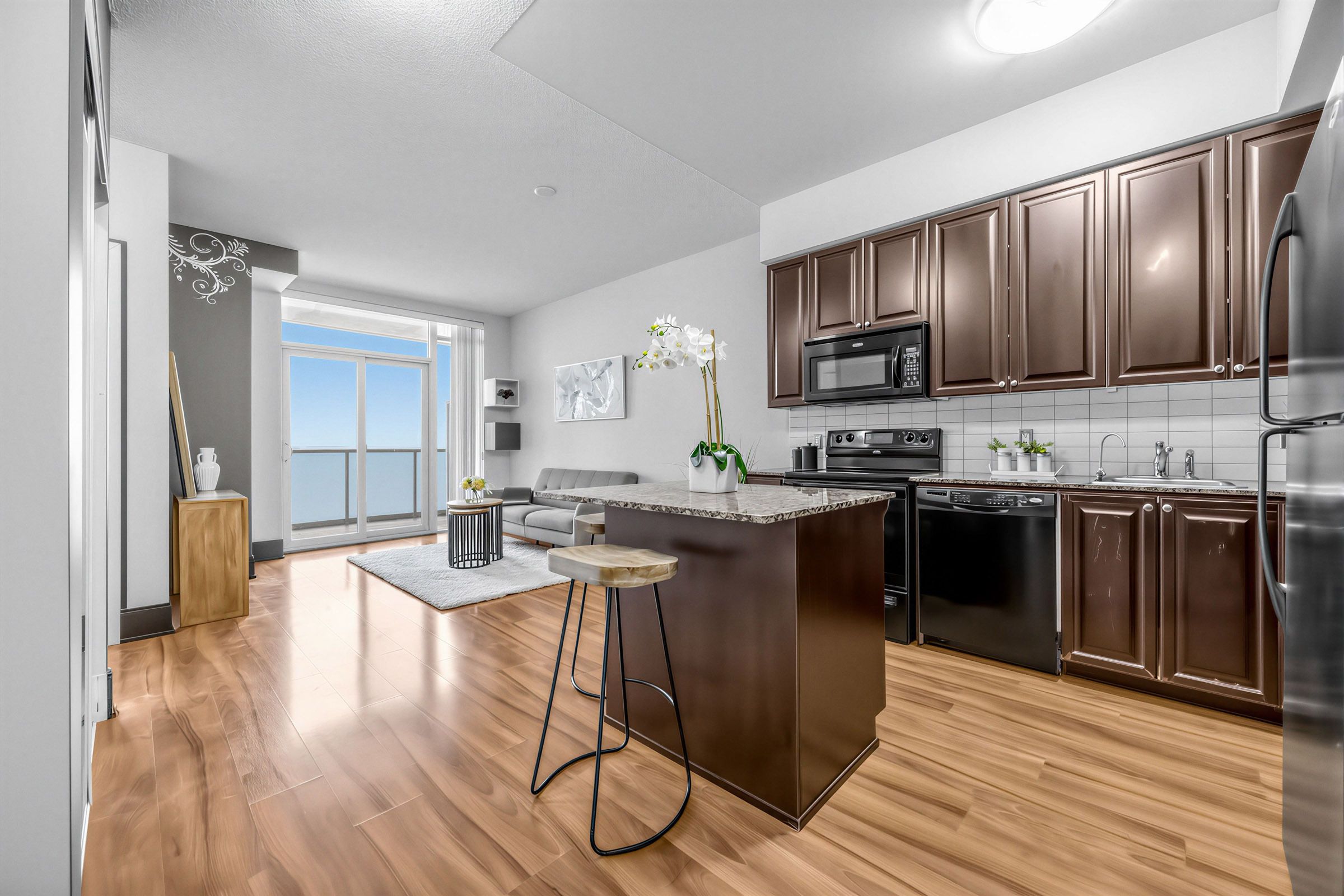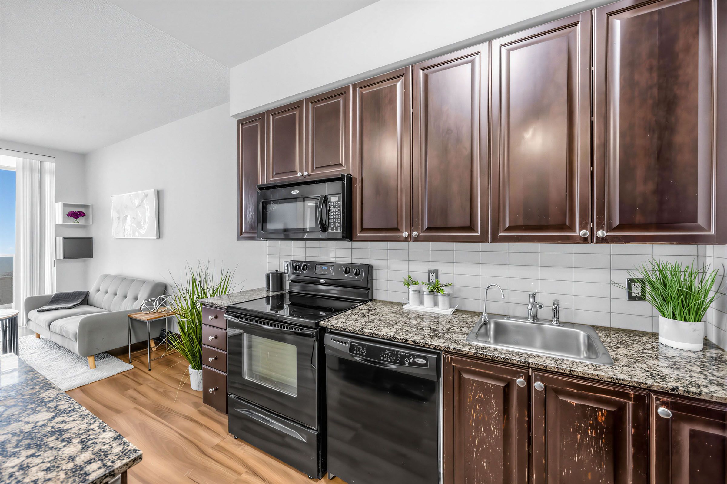 Check out these views! One of the largest 1 bedroom plus den layouts at the high in demand ultra ovation! At 660sqft this incredible unit has ample space to go along with higher 9ft+ ceilings. The living and dining rooms has an efficient layout and a walkout to your private balcony. The adjoining kitchen has granite counters and convenient centre island and lots of cabinet storage. The primary bedroom has plenty of space for additional furniture, a large closet, and is located next to the 4-piece bathroom. The multi-purpose den has been made into a separate room perfect for secondary sleeping quarters, home office, play area, and more! The best part is your open-air balcony with perfect views of celebration square events and fireworks! Enjoy resort-style amenities such as the indoor pool, exercise room, games room, party room, guest suites & more! Steps to public transit, square one shopping mall, restaurants, grocery stores, and celebration square. Quick access to major hwys, go station, parks, & schools. Come see this incredible unit today!