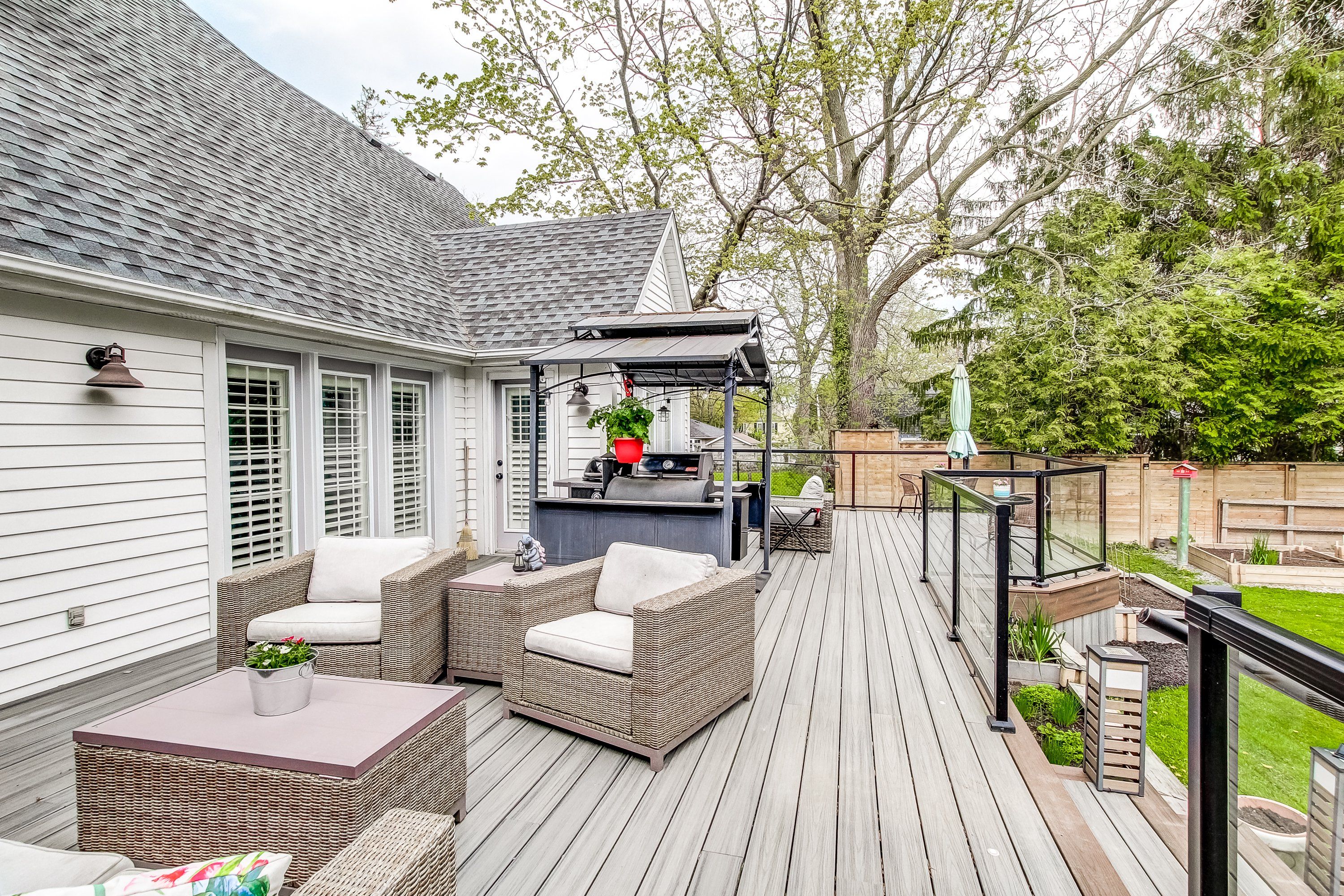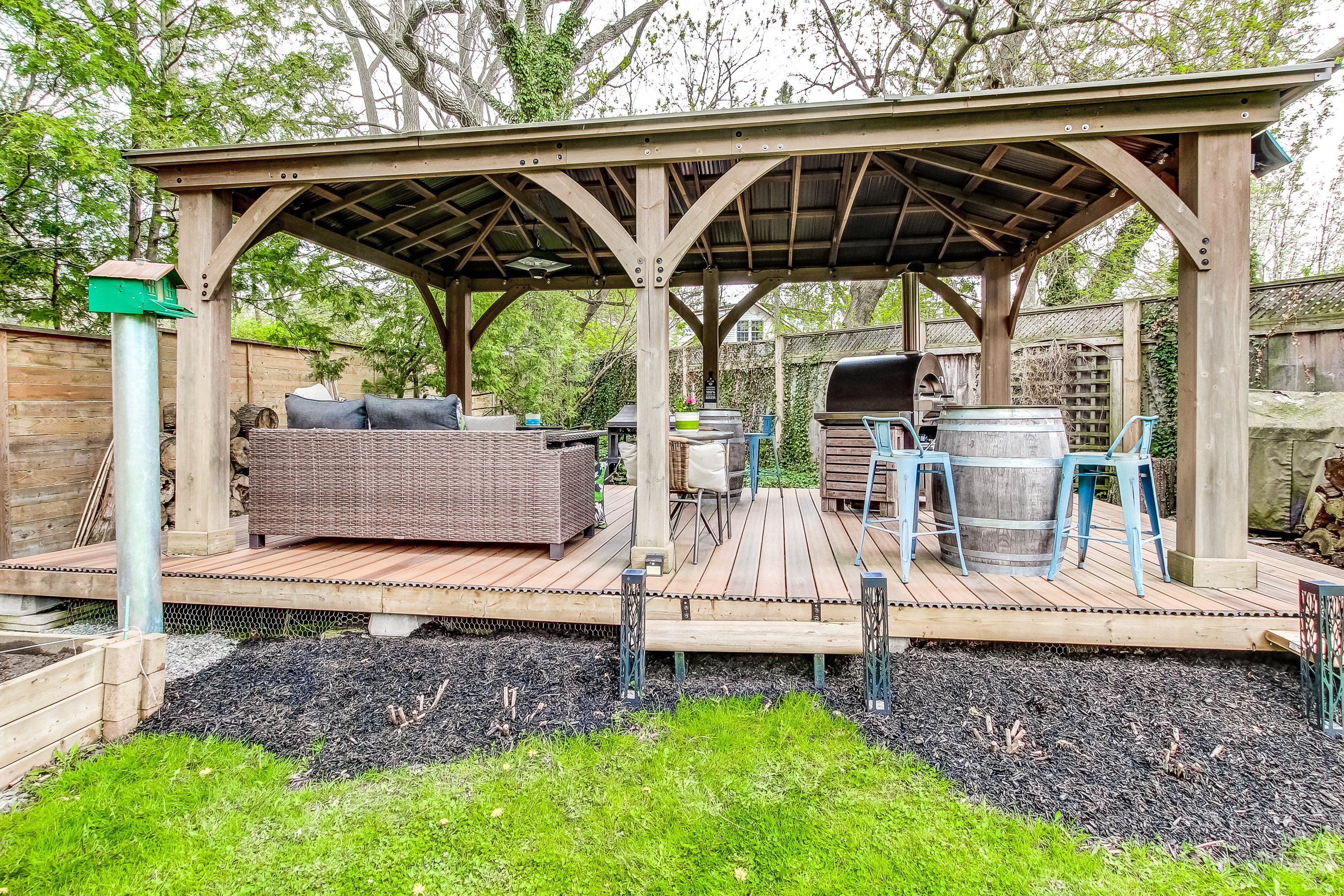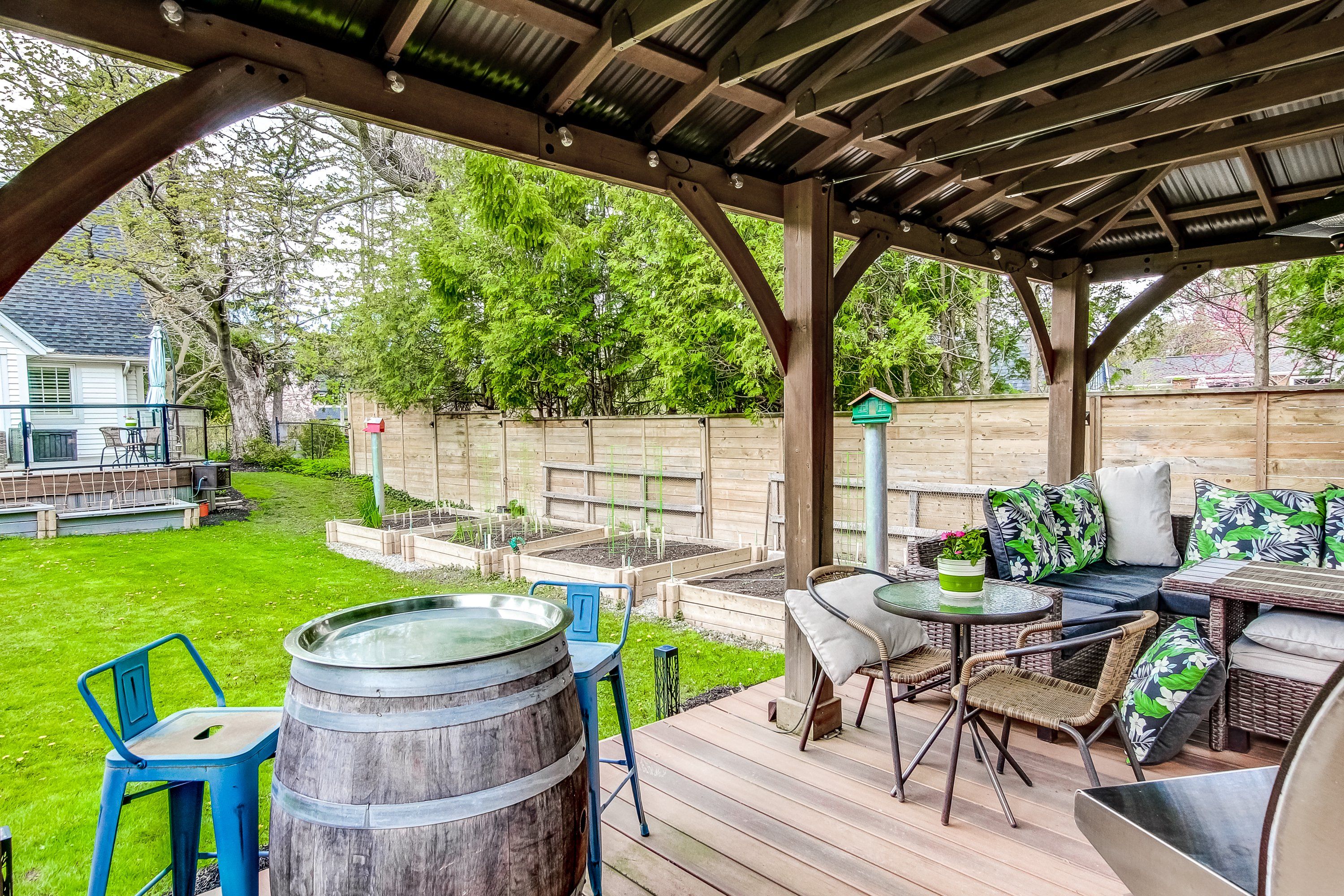 • Serene outdoor garden with a large deck for relaxing and enjoying nature.