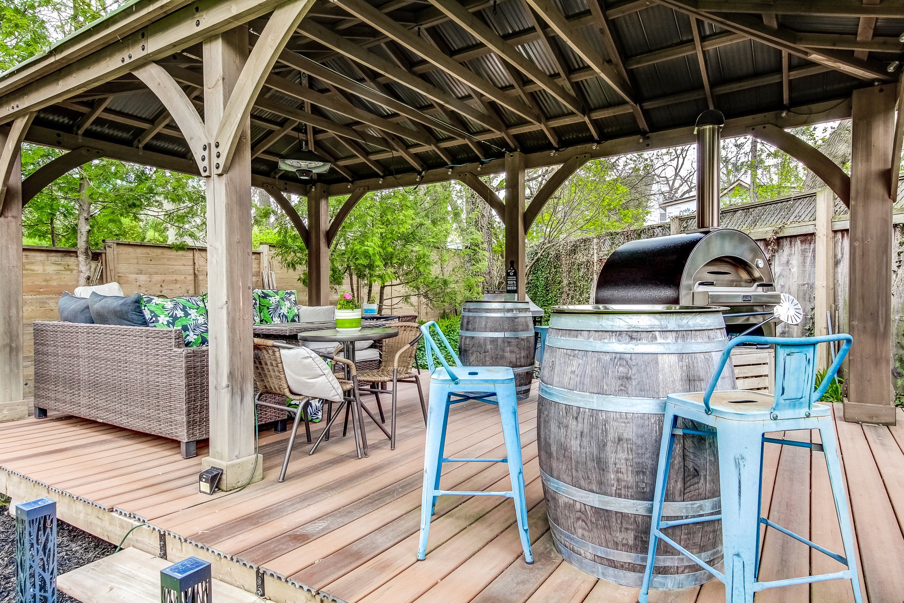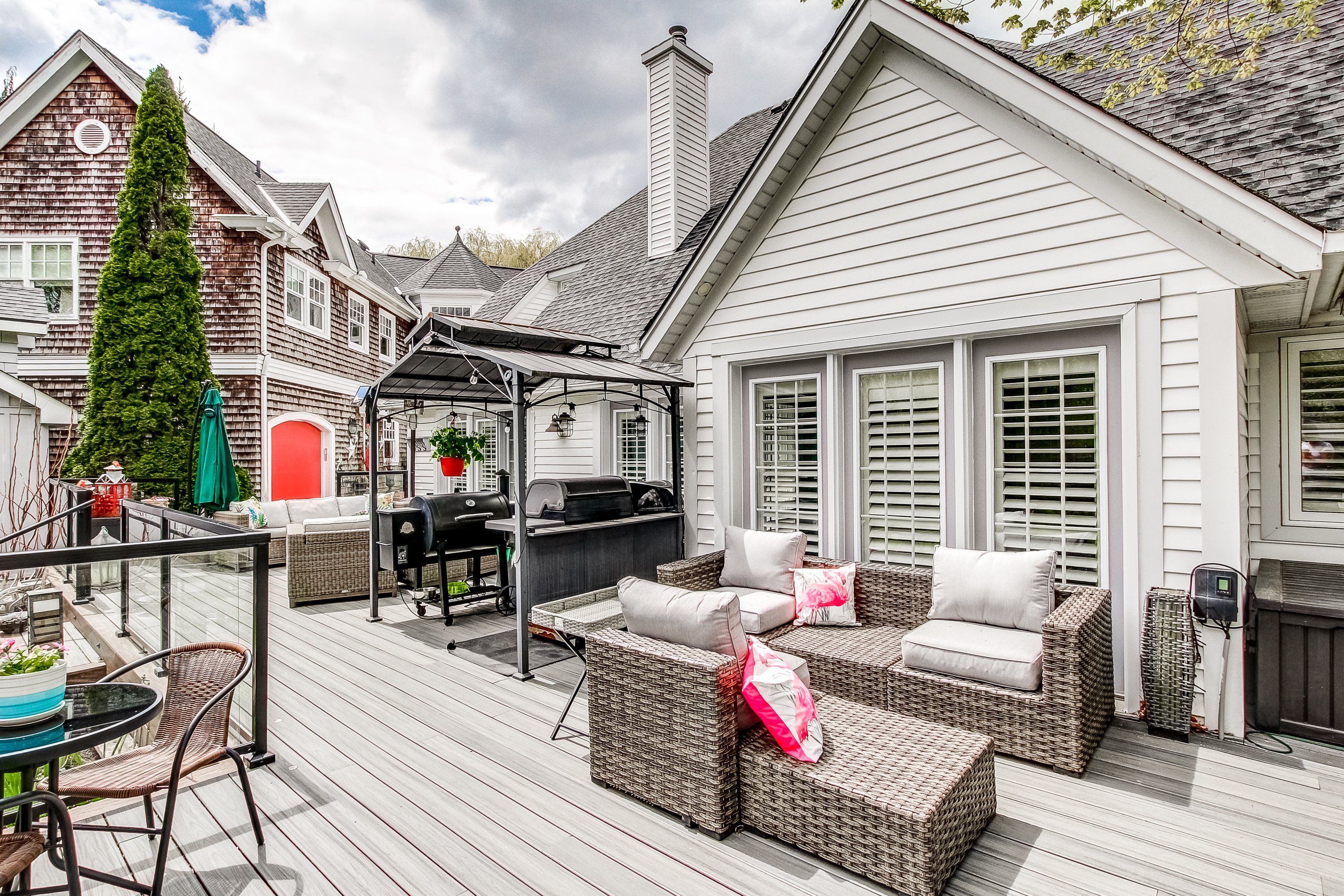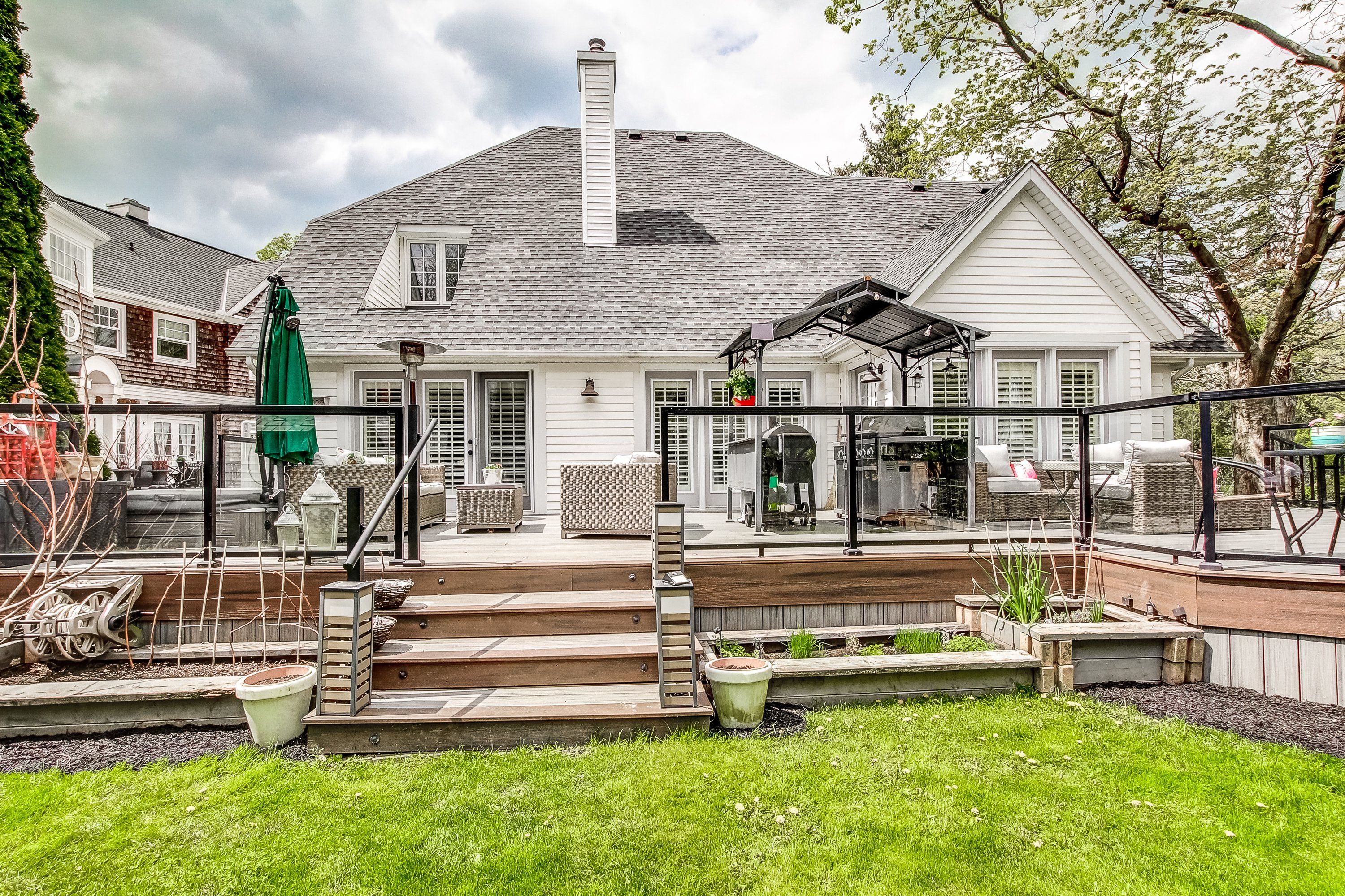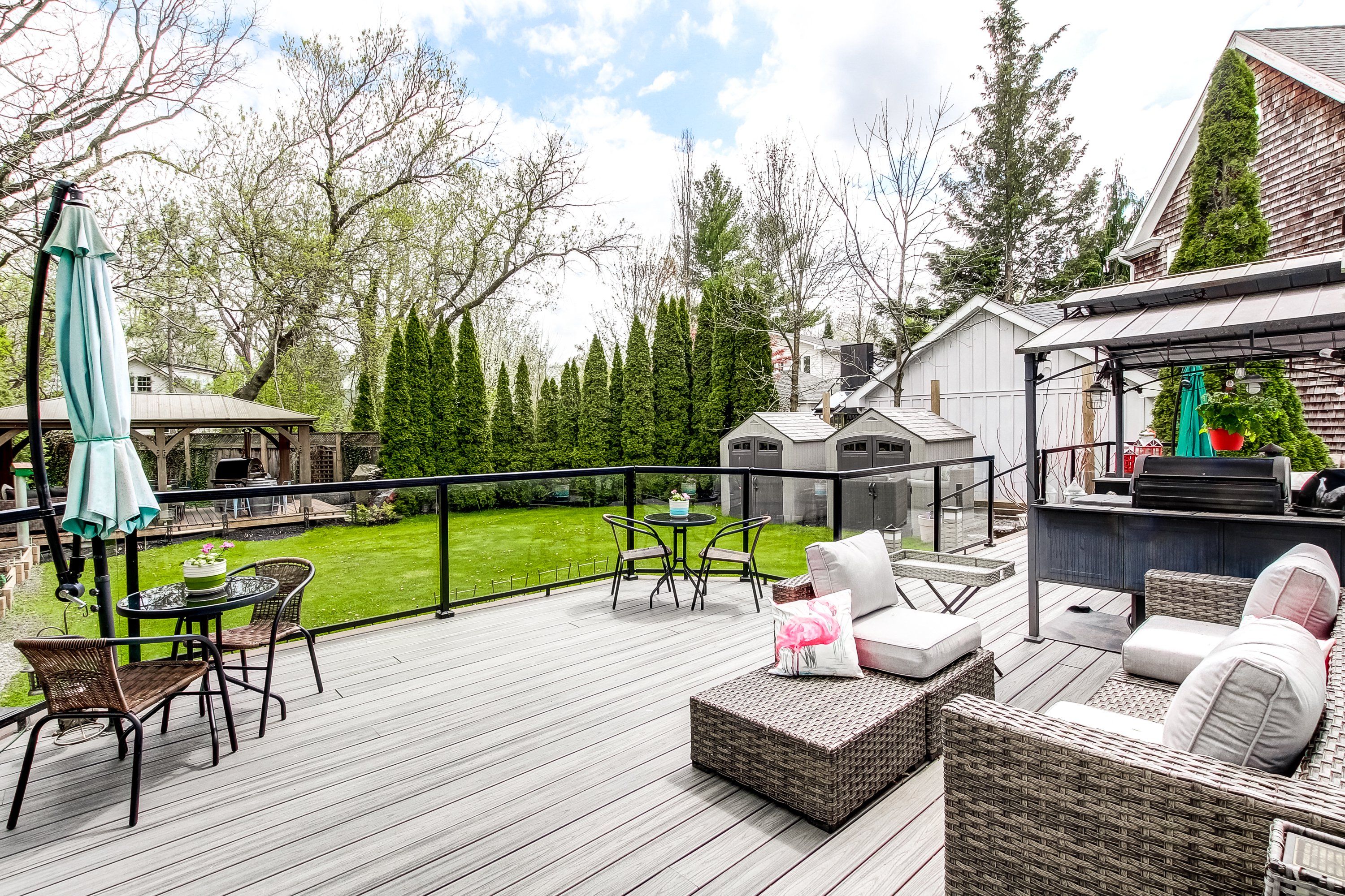 • Serene outdoor garden with a large deck for relaxing and enjoying nature.