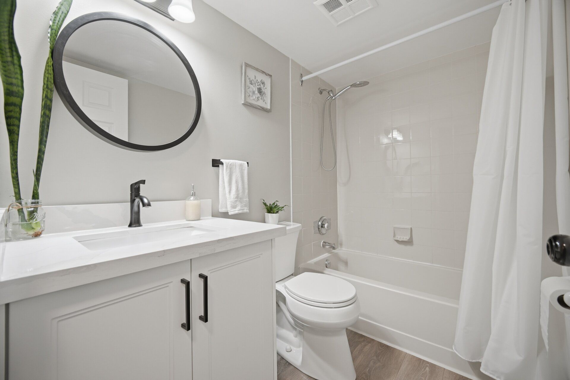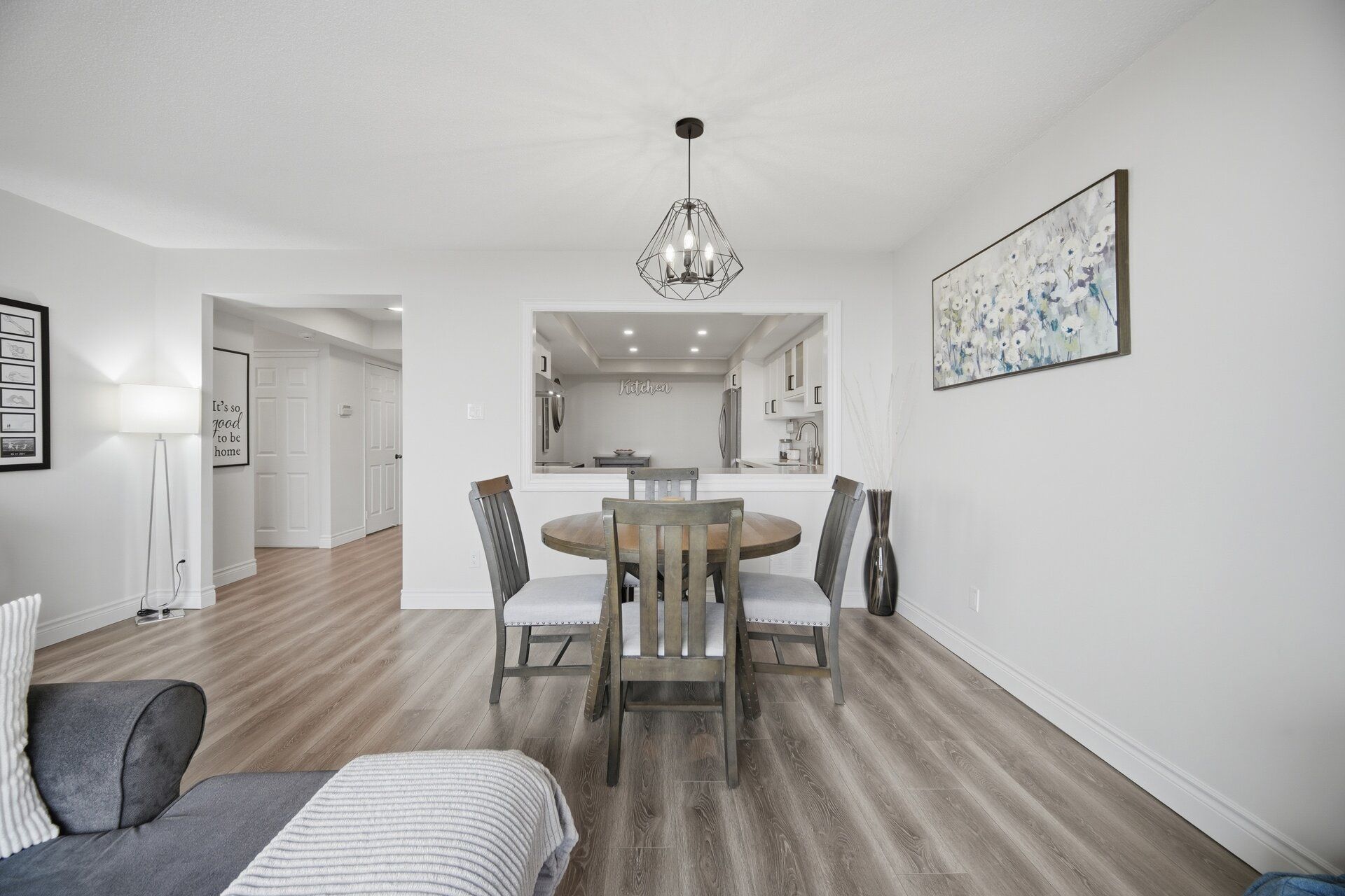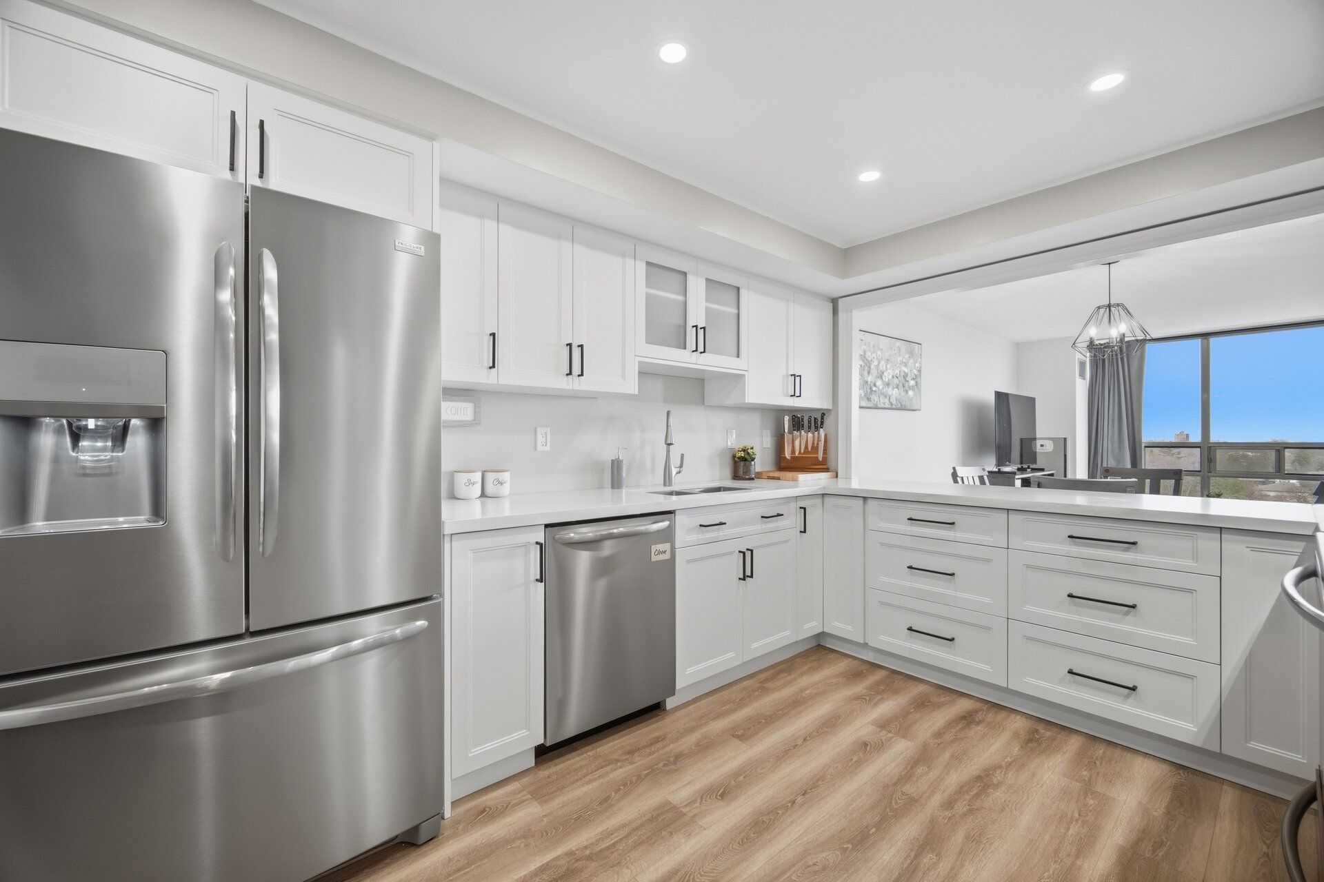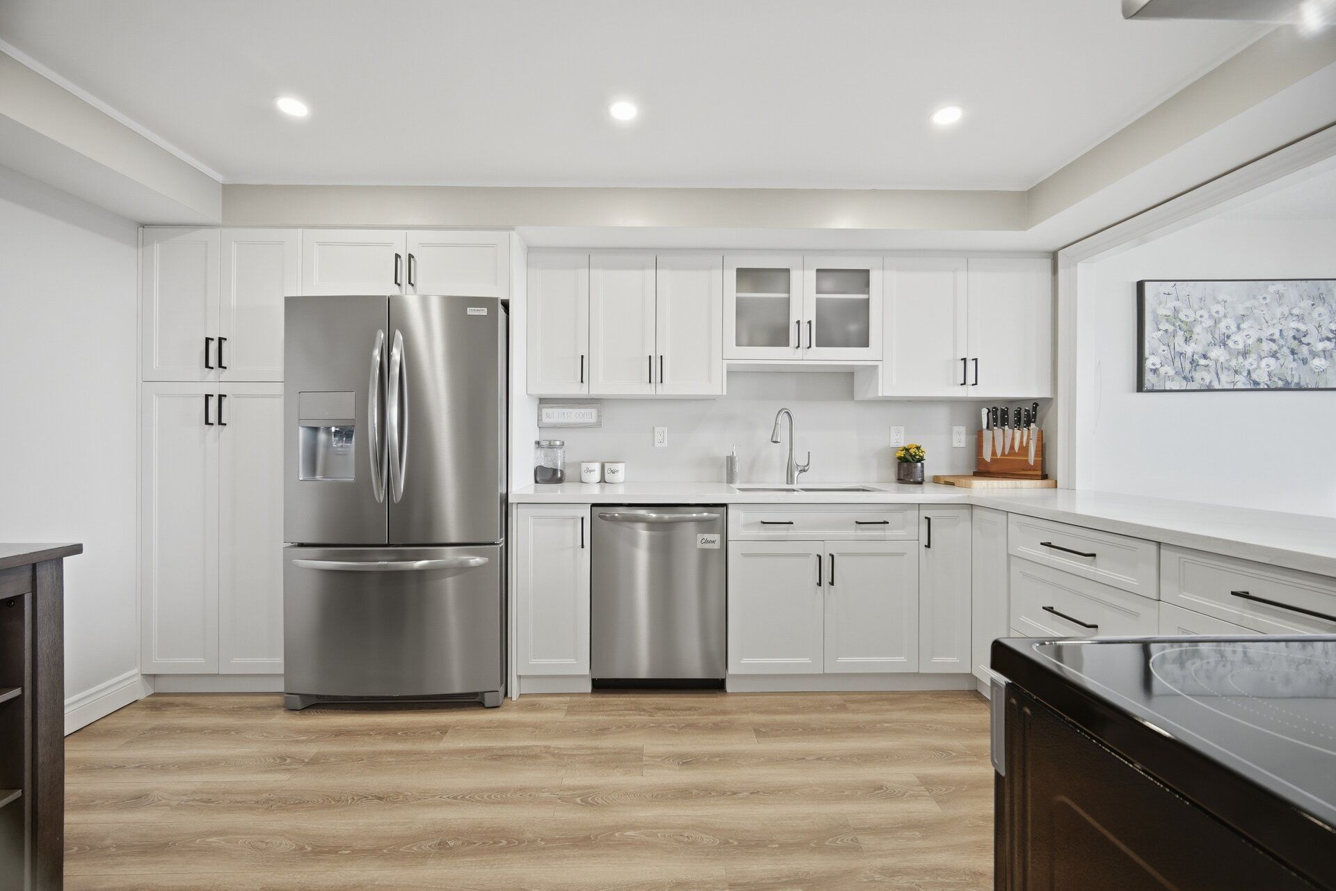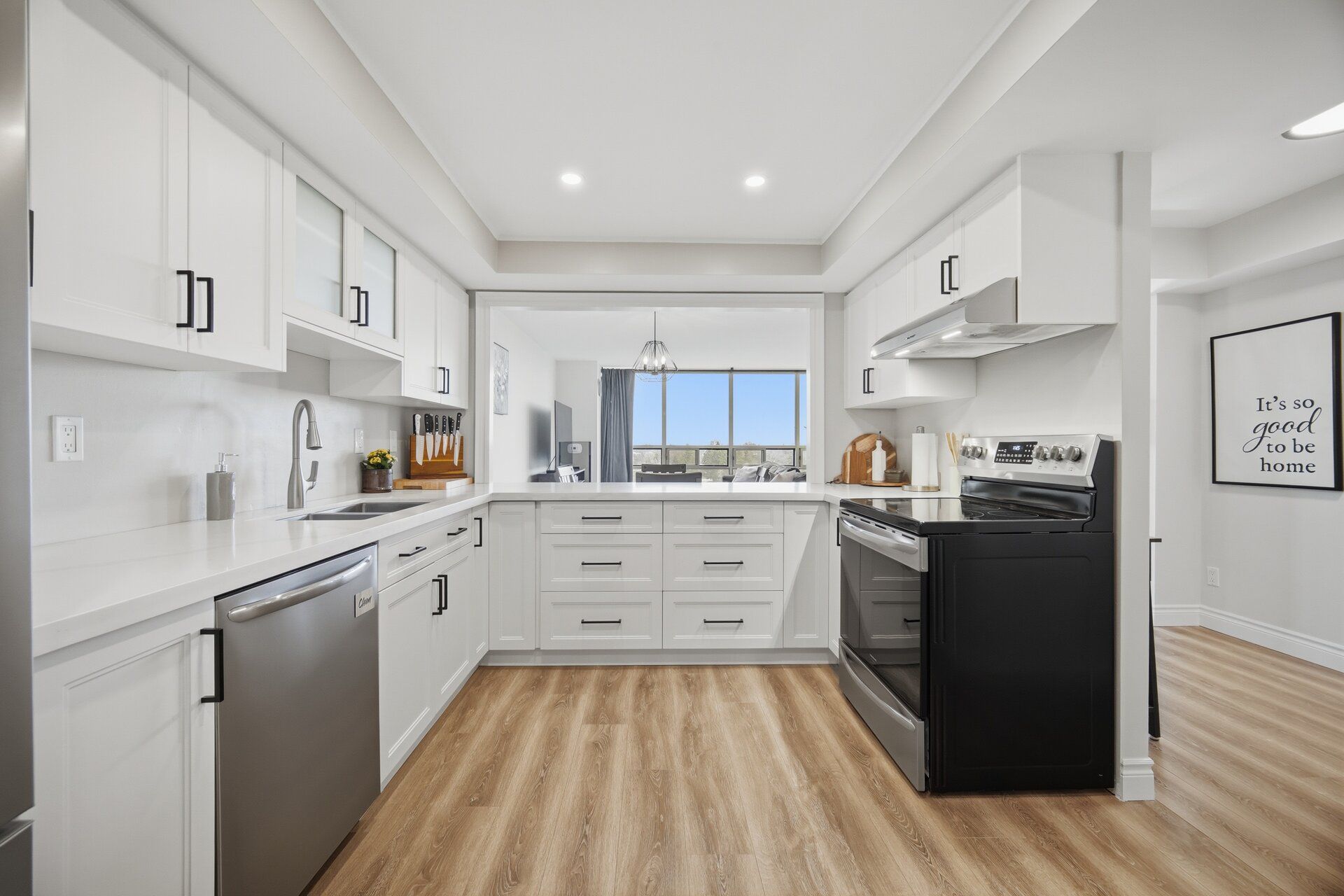 • Modern white kitchen with stylish finishes and upgraded vinyl flooring.