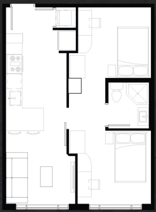 • Luxury student condo with a shared 2-bedroom unit setup.