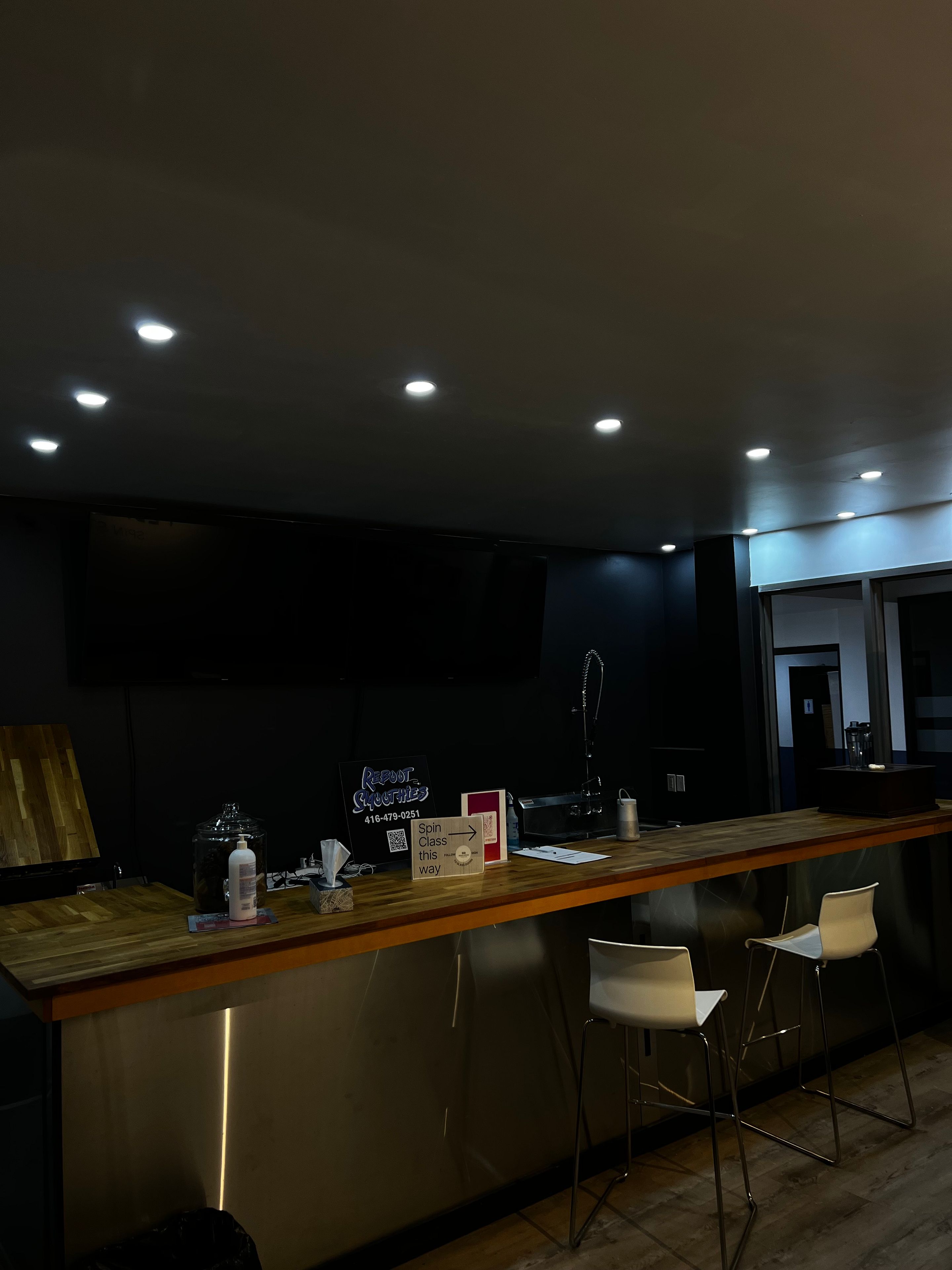 Nice space with access from two sides (corridor and vestibule). 9ft clear height. Has a counter area which was intended for smoothie bar. Formerly a spin studio and a group fitness studion. Lends itself to many different uses that are detailed in the zoning by-law. Landlord would consider restaurant, but not outfitted as such. Also potential for therapy spa, day spa, banja, dental practice, medical practice, product showroom, personalized strength training studio, etc. Please note rent is monthly for 1 year and does not include utilities or hst.