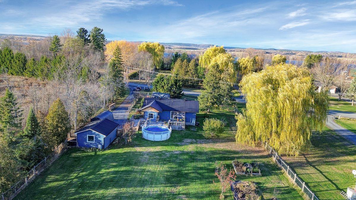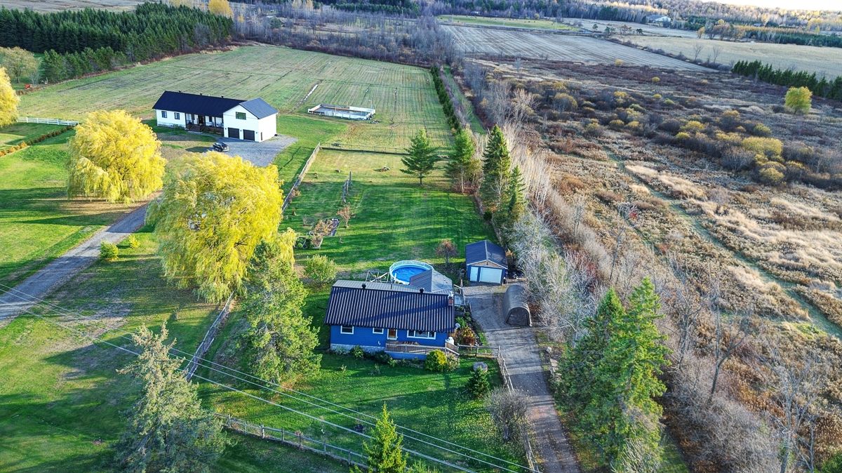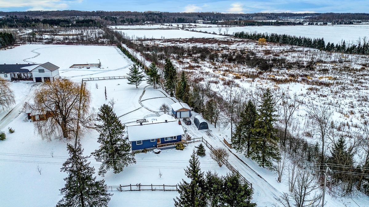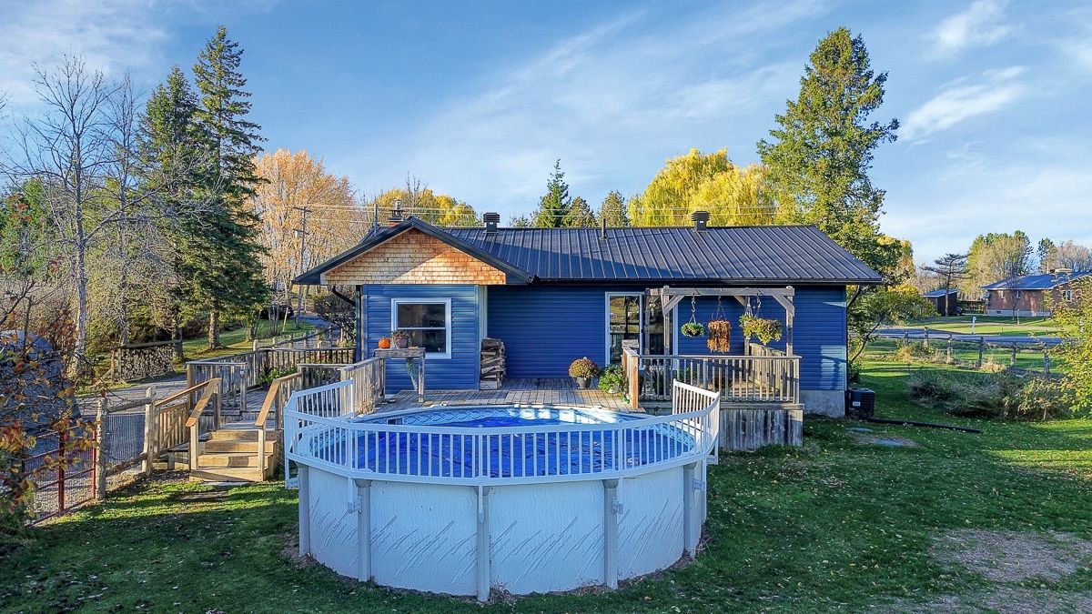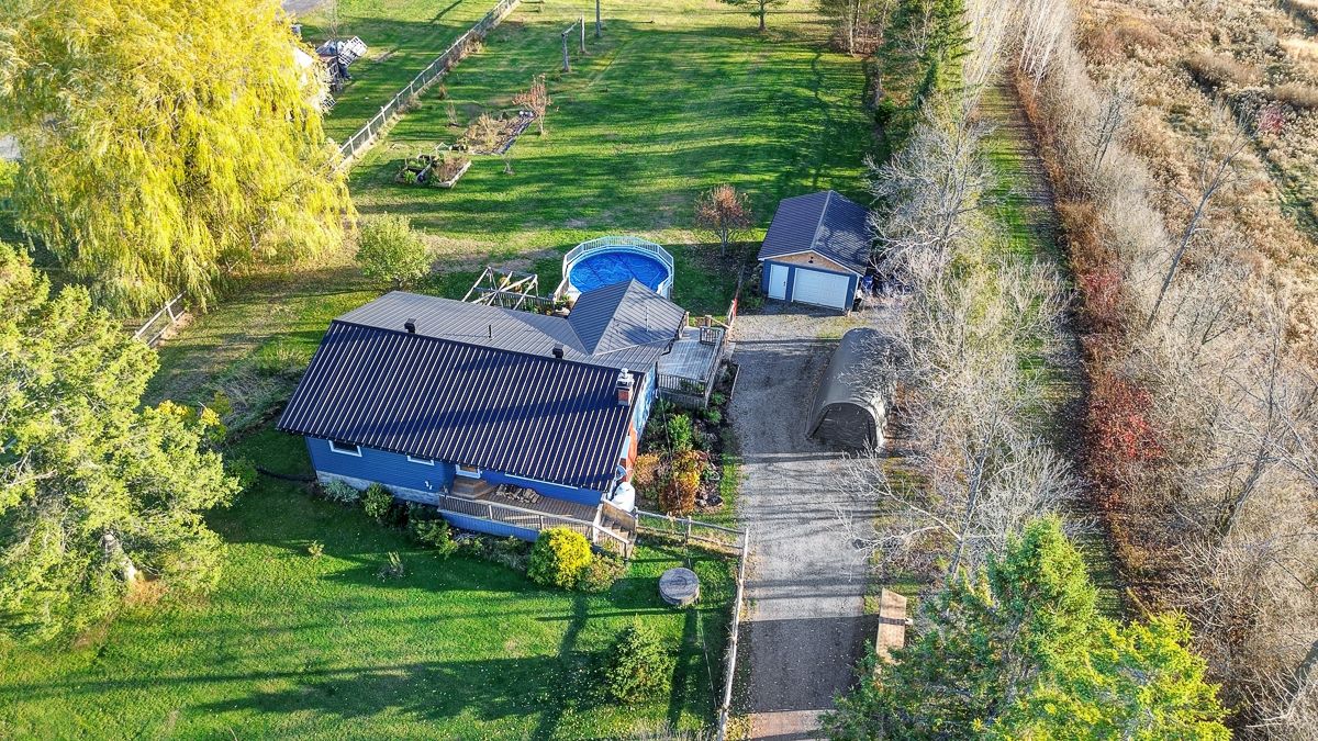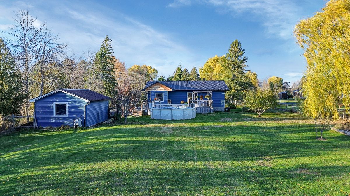 Your peaceful country retreat awaits. Discover the perfect blend of charm, comfort, and space in this meticulously maintained 2+1 bedroom, 2 full bath bungalow, set on over an acre picturesque lot surrounded by nature. Step inside to find rich hardwood floors and a bright, bistro style kitchen that radiates warmth and character. Flooded with natural light and freshly painted, the open concept layout flows seamlessly into a cozy living room with a wood burning fireplace, the perfect place to unwind on cool evenings. A separate dining area opens to a large deck overlooking the above ground saltwater pool, perfect for entertaining or relaxing in your private oasis. The main floor features two inviting bedrooms, including a primary suite, and an elegant full bath with his and her sinks. Downstairs, the fully finished lower level offers a third bedroom, a large entertainment or family room, a second full bath, and generous storage. Outside, enjoy your fully cedar fenced backyard, detached garage with two additional carports- 1 is covered, 1 is frame only, a durable steel roof, and ample parking for all your vehicles and toys. Whether you're entertaining friends, raising a family, or simply seeking tranquility, this property delivers it all. Come experience the serenity. This is home!