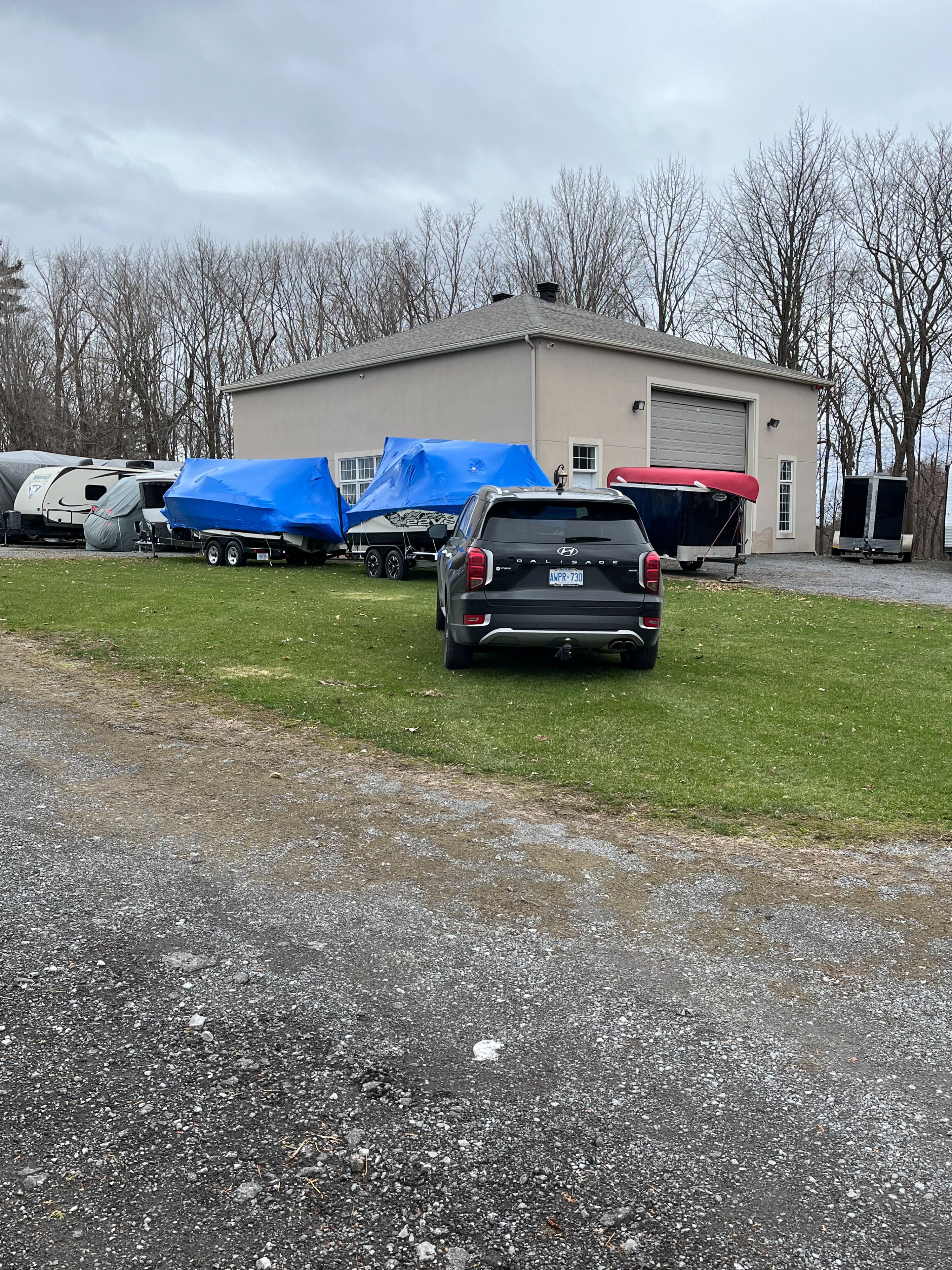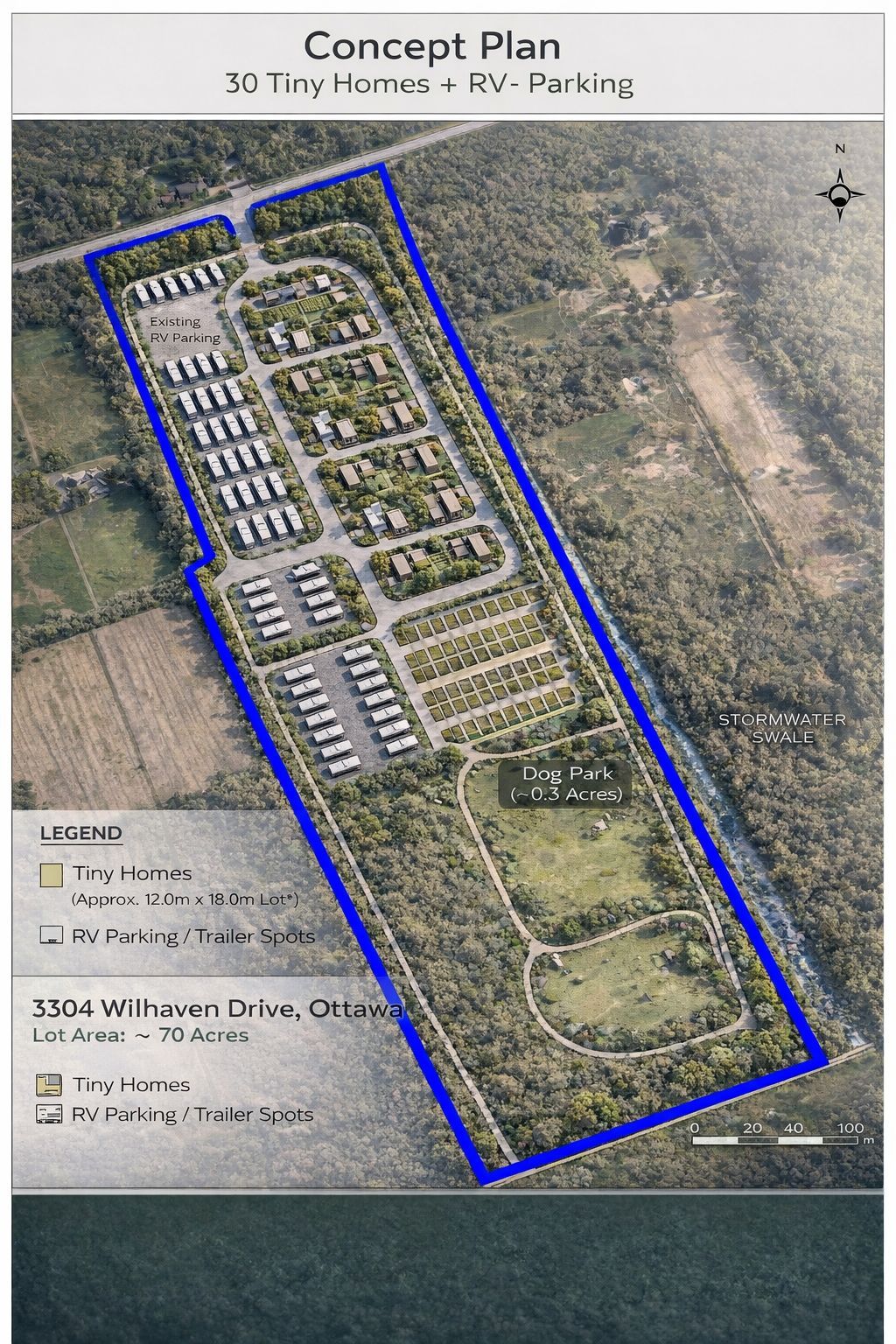Subject property is well-located, just 16-minutes east of place d'orleans and 6 and minutes from the trim road light rail station. Existing use: rv parking with special underground "blanket" to protect parked rvs from excess humidity. Well maintained and high ceilinged works garage (41' x 41', 1,681 sq ft) currently available for lease at $2,500 per month plus hst plus power and heat. Parking pad for tiny home/mobile home also available for lease for $650 per month including power but excluding heat (propane). Area of subject property is 72. 553 acres including arable land, uplands treed area, roadways, swimming pool (non-functional), concrete parking pad plus more than 65 rv parking places. Year-to-year farmland lease in place. Potential for tiny home community with starter homes, garden plots, workshops, storage, parking, playland, private dog park, farmgate marketing canteen, small greenhouse sales and rentals plus additional rv parking. No sign on subject property.