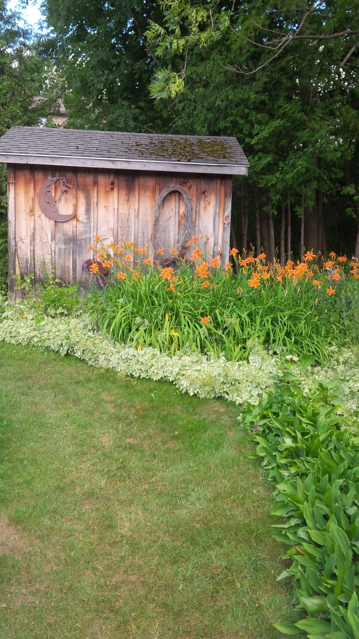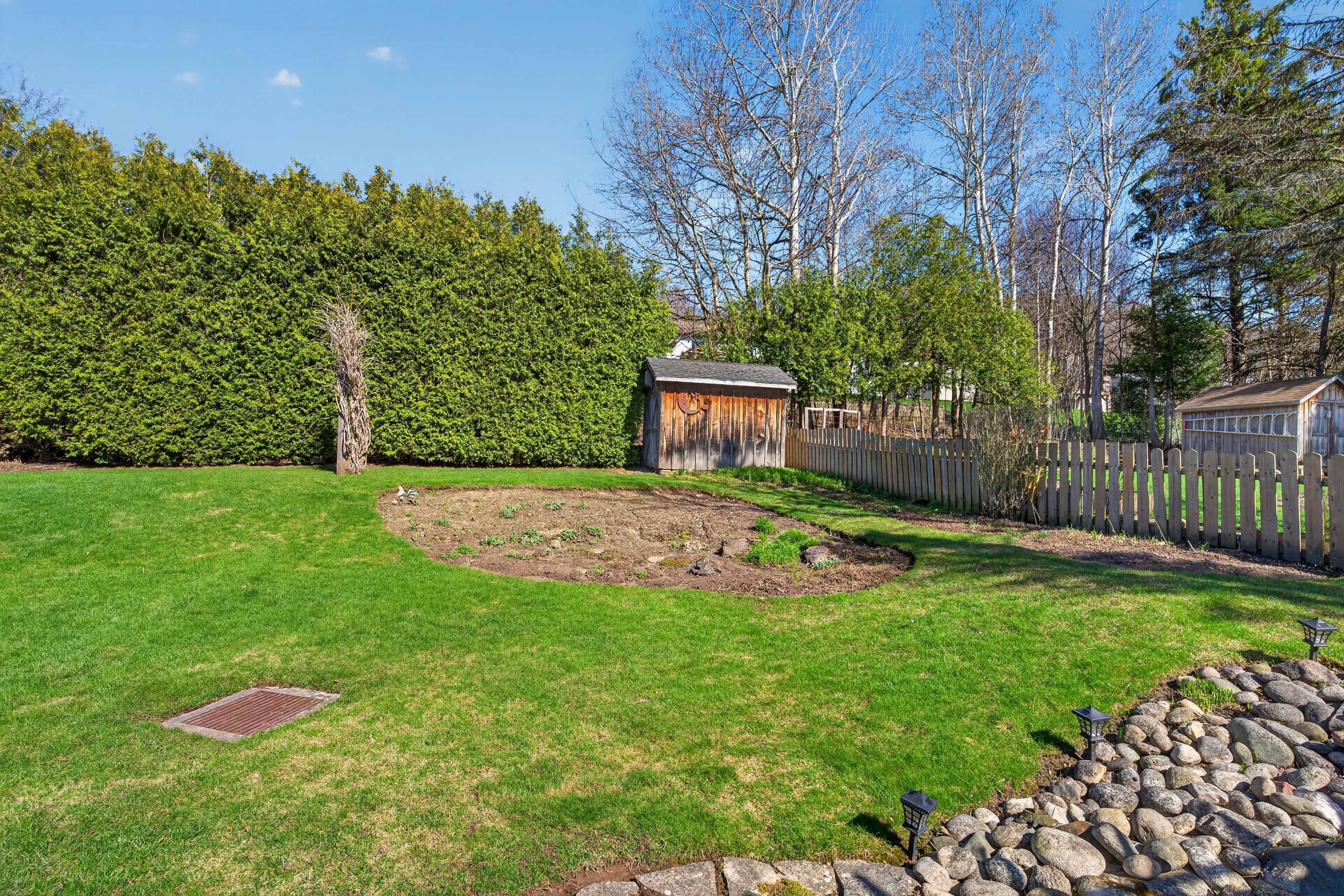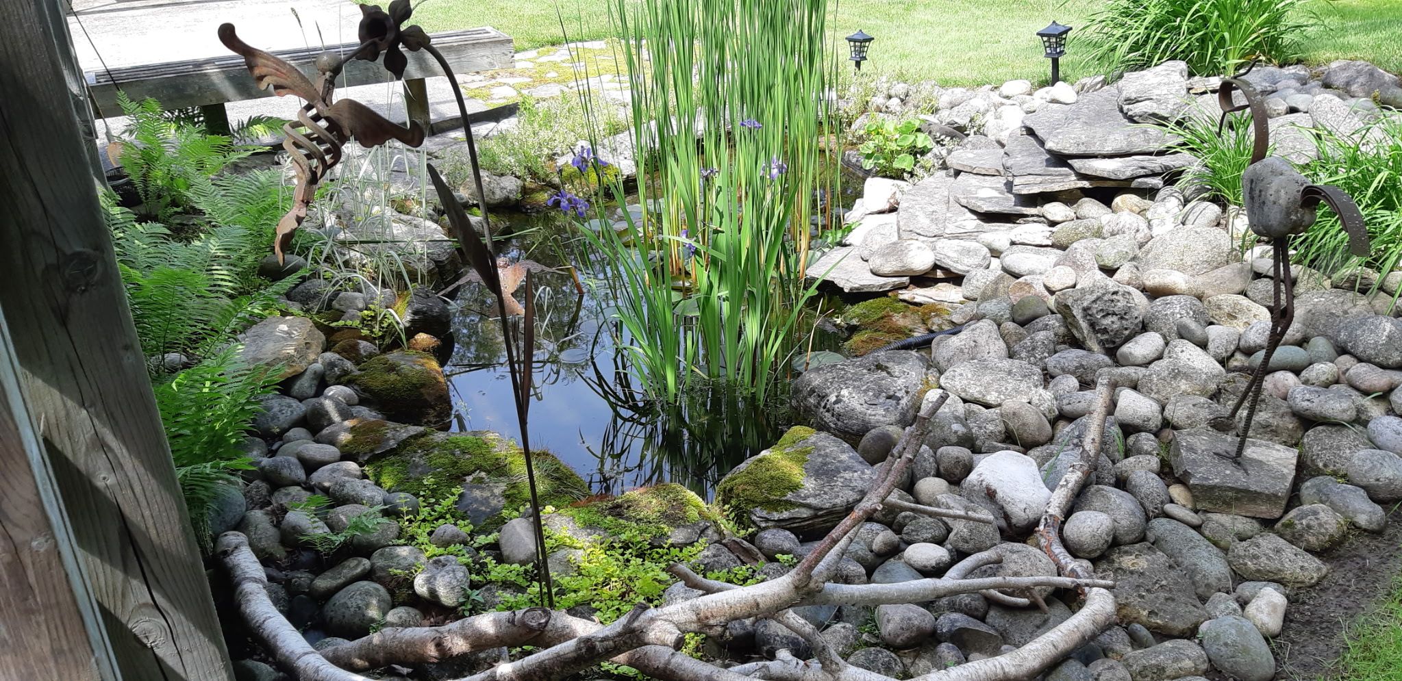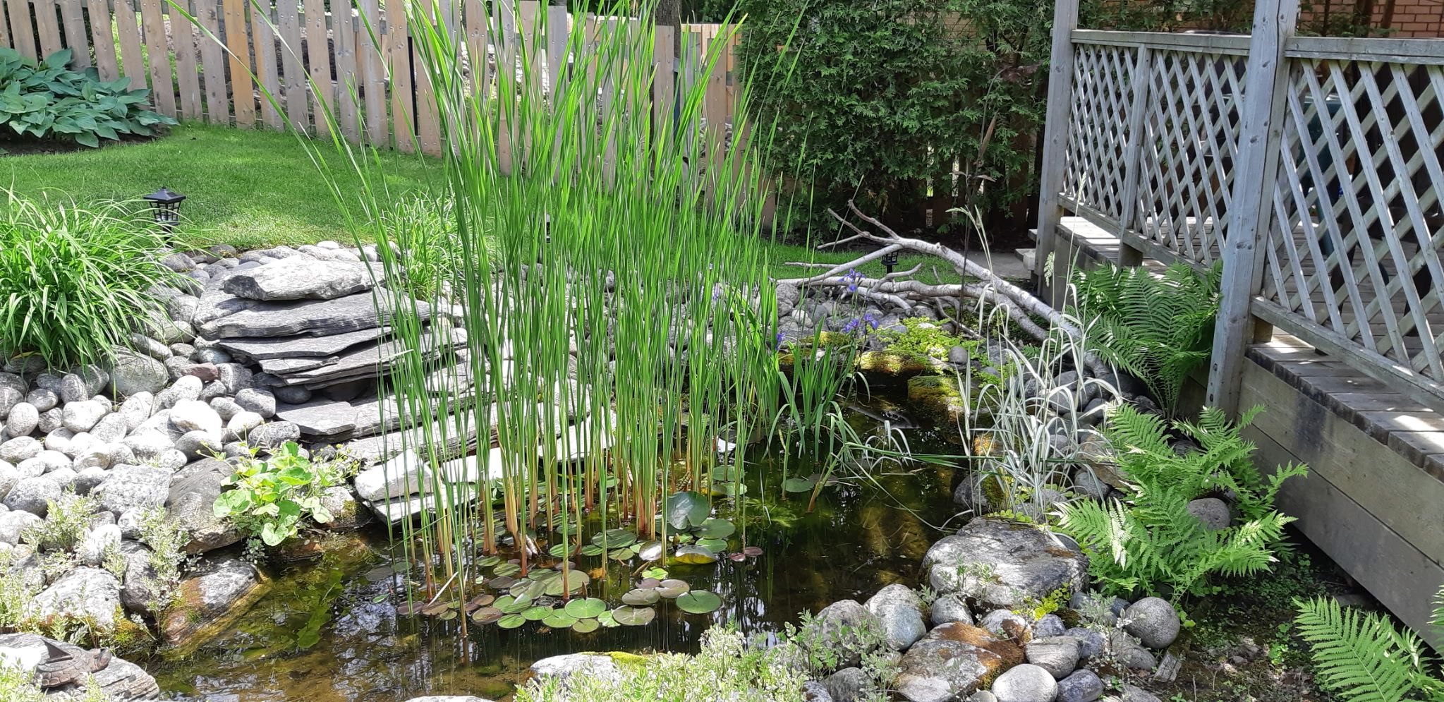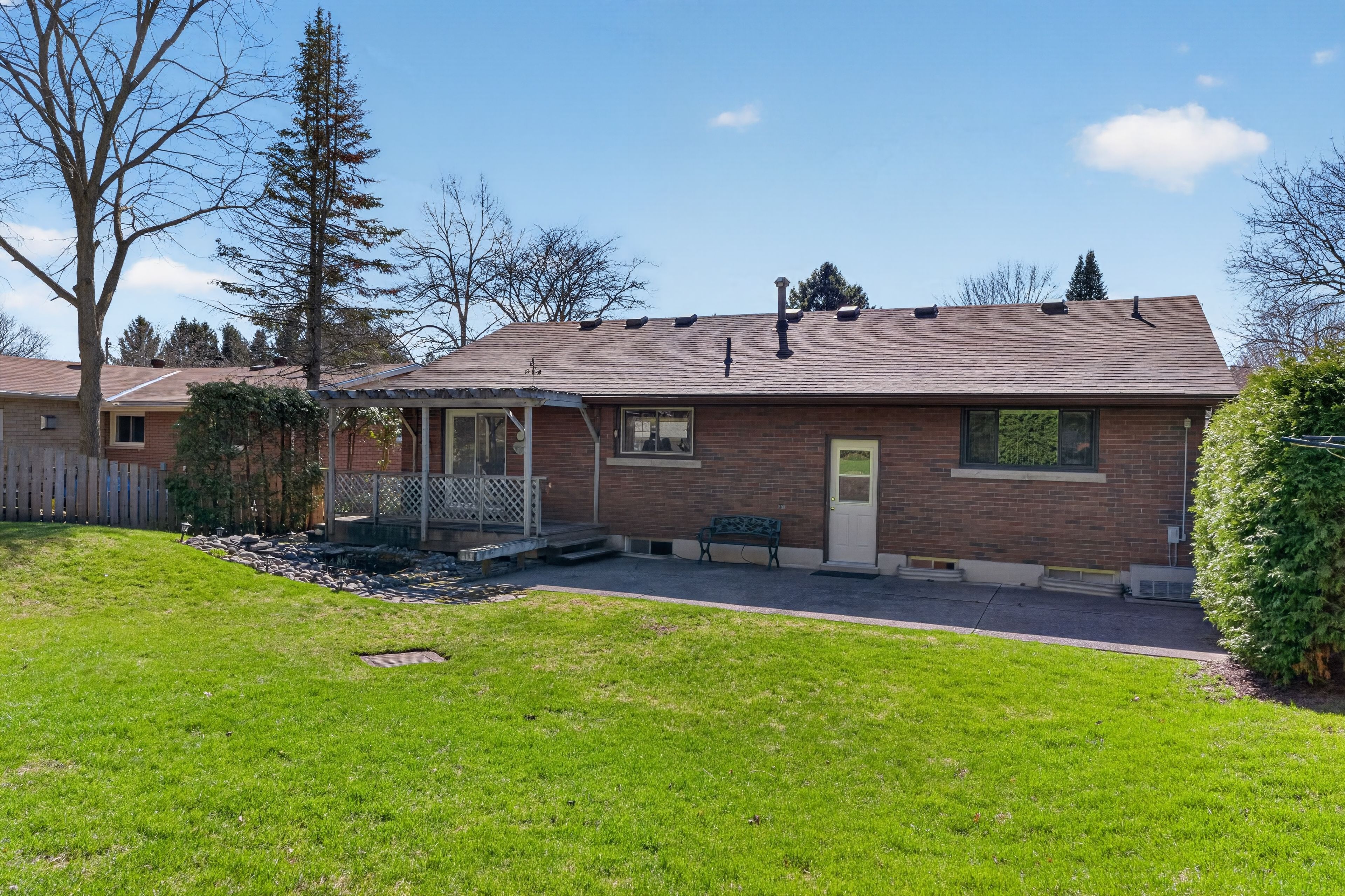 • Lush backyard features a fish pond and space for outdoor activities.