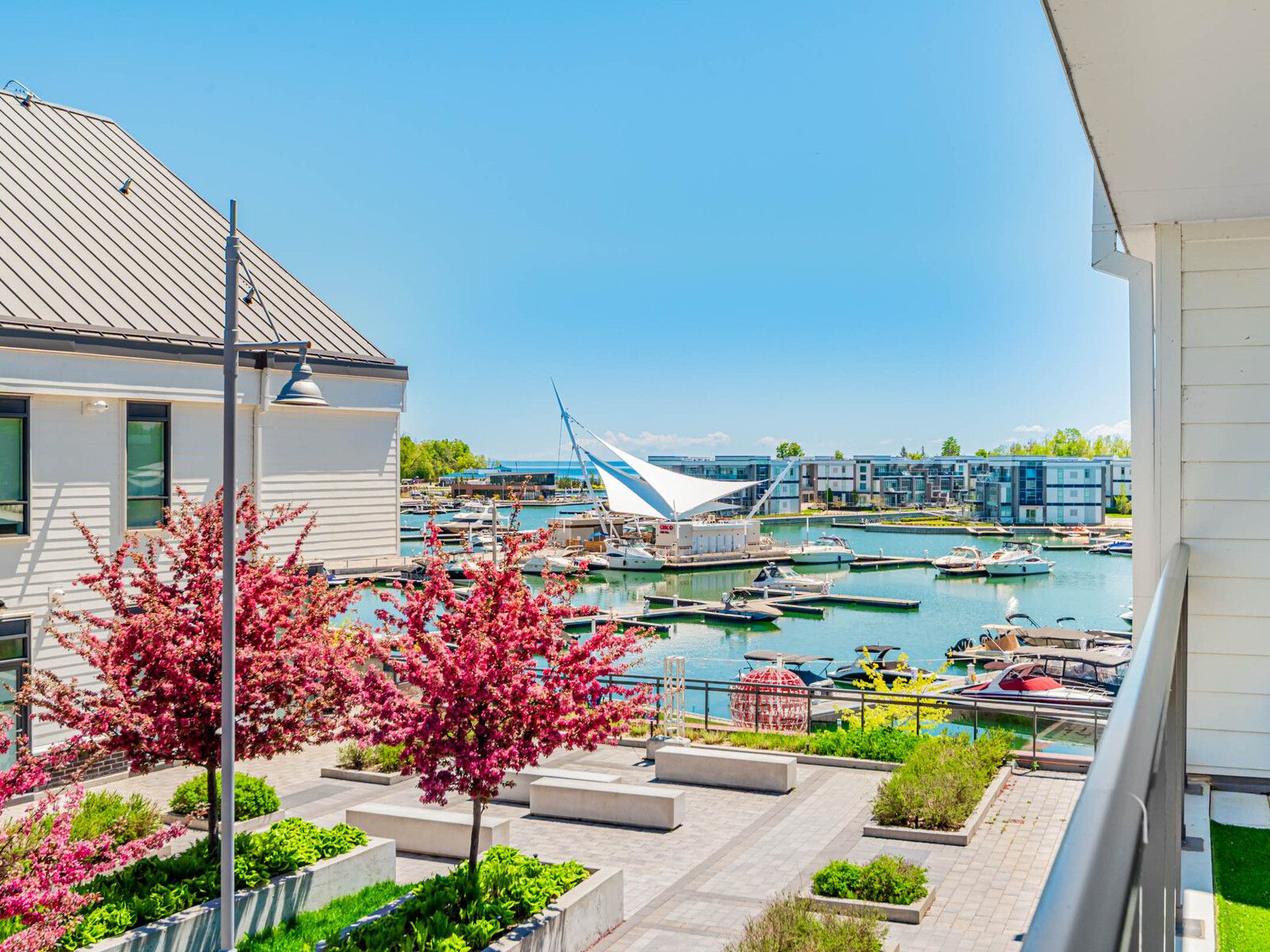 Beautiful 2-story home with a private entrance located in the boardwalk condos. 2 bedrooms 3 bathrooms. Perfect marina and water views from bedrooms and balcony. Large private terrace perfect for entertaining. Hardwood floors and many upgrades. The perfect place and location in friday harbour resort. Just steps away from restaurants, lcbo, starbucks, marina, and lake club. Live every day like its friday!