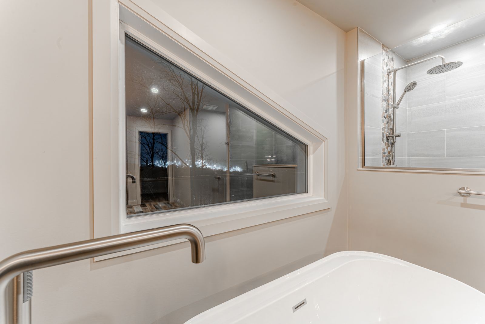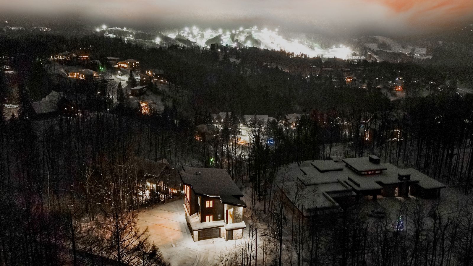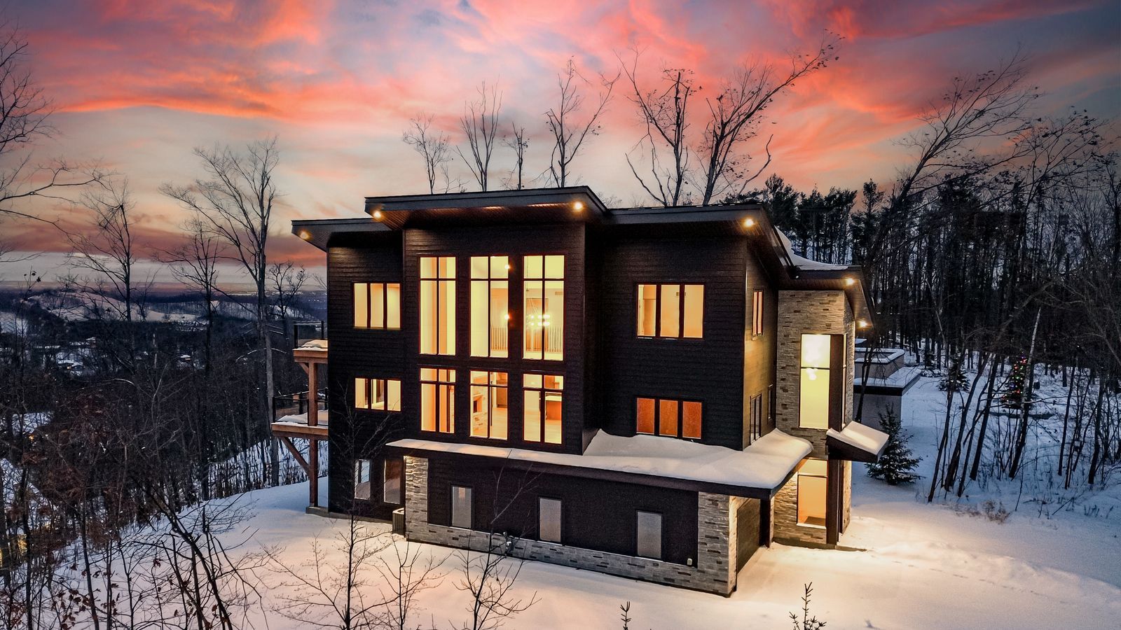 2024-built 4,200+ sq ft chalet-style residence meets four-season adventure in horseshoe valley! Indulge in the artistry of modern design at this custom-built 2024 home in horseshoe valley, capturing panoramic western views and sunsets from its commanding hilltop setting. Boasting over 4,200 sq ft of above-grade living space, this modern chalet showcases striking black hardie board siding, stone facade accents, a fibreglass roof, and multiple glass-railed decks designed to celebrate the surrounding scenery. The open-concept main level is ideal for entertaining, highlighted by a 24-ft vaulted ceiling, floor-to-ceiling windows, and a double-sided napoleon fireplace connecting the great room to the dining/family areas. The gourmet kitchen features caesarstone quartz countertops, custom two-tone cabinetry, a dramatic x-leg island, a chevron tile backsplash, a pantry, and modern lighting, all flowing to a dining area with built-in shelving and a walkout. A private main-floor office provides a peaceful workspace, while the third level hosts the luxurious primary suite with its own fireplace, balcony, walk-in closet, and spa-inspired ensuite with a freestanding tub, double vanity, and glass shower, along with two additional bedrooms, a full bathroom, and a laundry room. The ground level extends the home's versatility with 9'9" ceilings, a bright rec room, an additional bedroom, and a full bathroom. Engineered hardwood, ceramic tile finishes, and meticulous craftsmanship are complemented by superior construction featuring an icf foundation, lvl beams, and double-studded 2x6 walls. Within walking or golf cart distance to horseshoe resort, the valley club, tennis courts, and scenic trails, and just minutes to vetta nordic spa, copeland forest, lake horseshoe, local dining, and highway 400, this exceptional home is also near a new school, community centre, clinic, and fire station, defining sophisticated four-season living in one of ontario's most prestigious destinations.